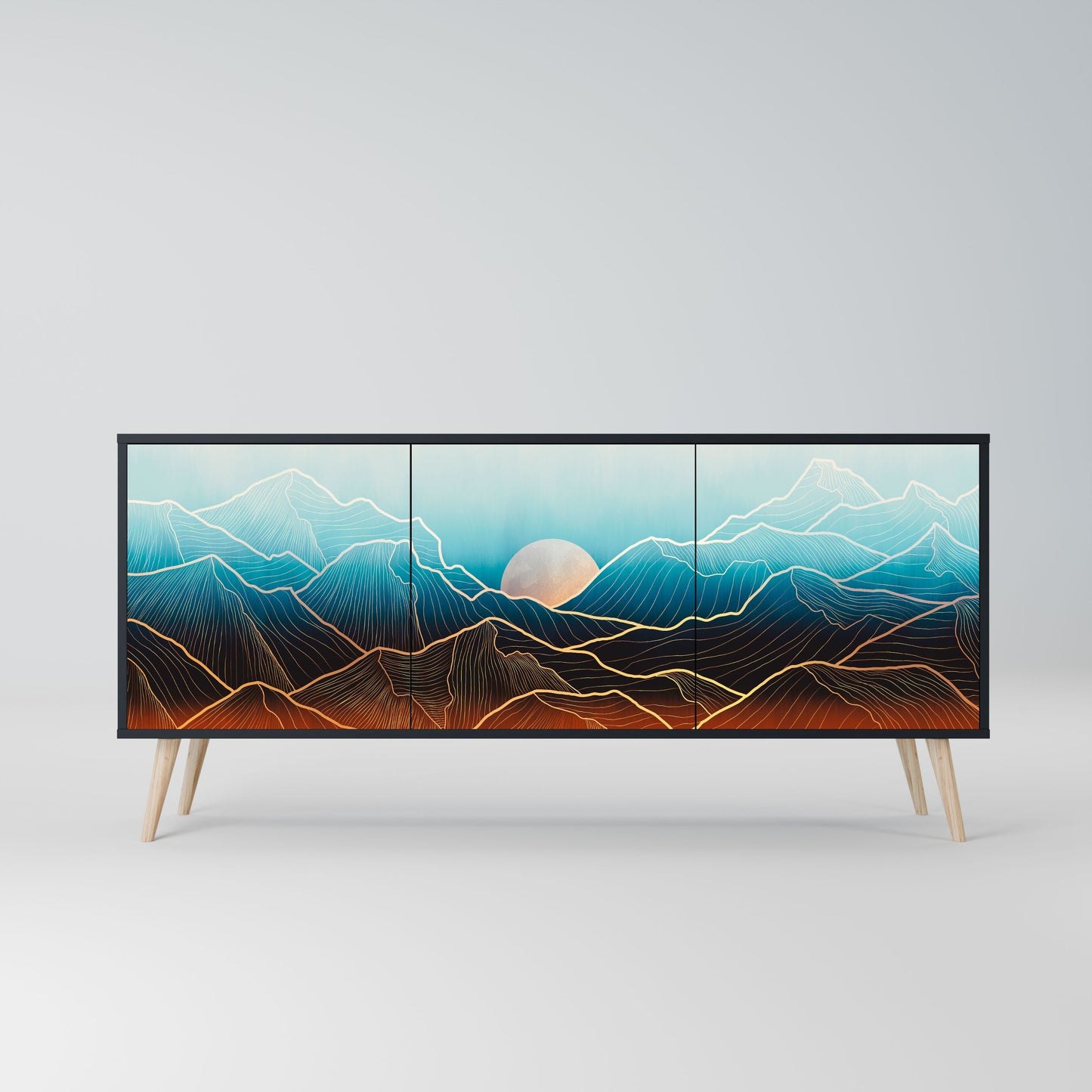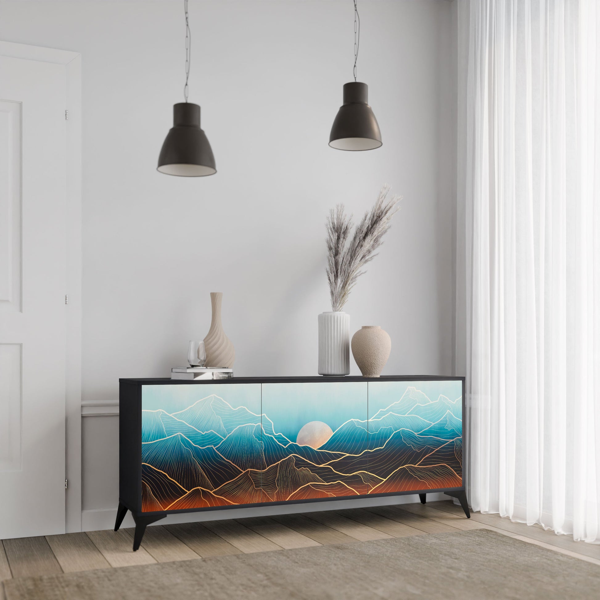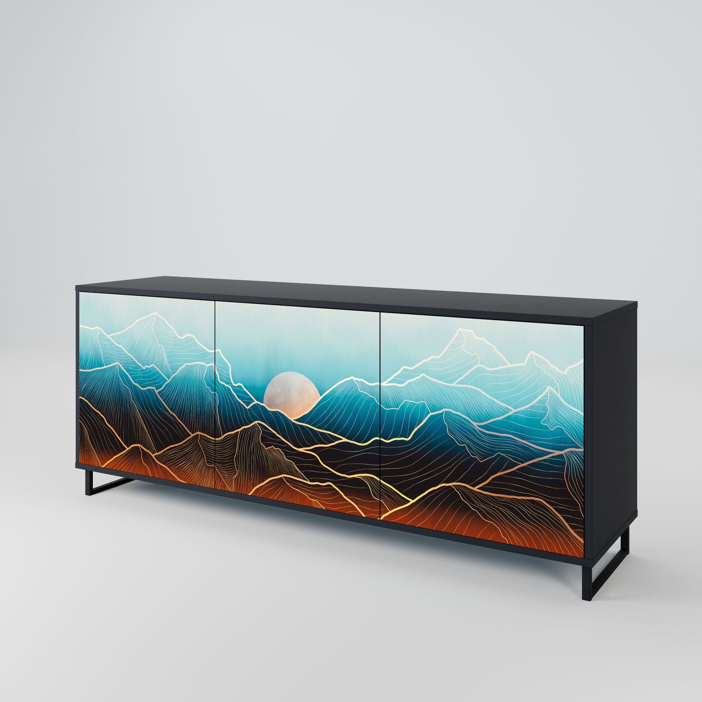 Eleganza e funzionalità in un unico mobile: la nostra credenza a 3 ante con corpo nero è la soluzione perfetta per gli amanti degli interni eleganti e moderni. Il corpo nero enfatizza il carattere audace del mobile, mentre i frontali con una stampa unica aggiungono un tocco artistico. Si adatta perfettamente al soggiorno, alla camera da letto o all'ufficio, completando sia gli arrangiamenti moderni che quelli industriali.