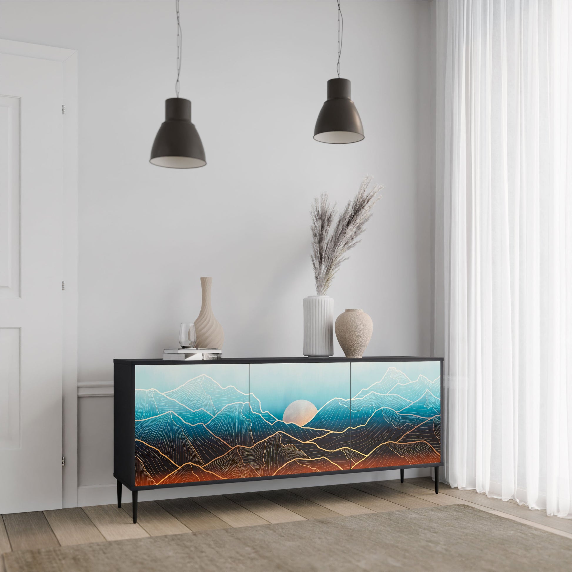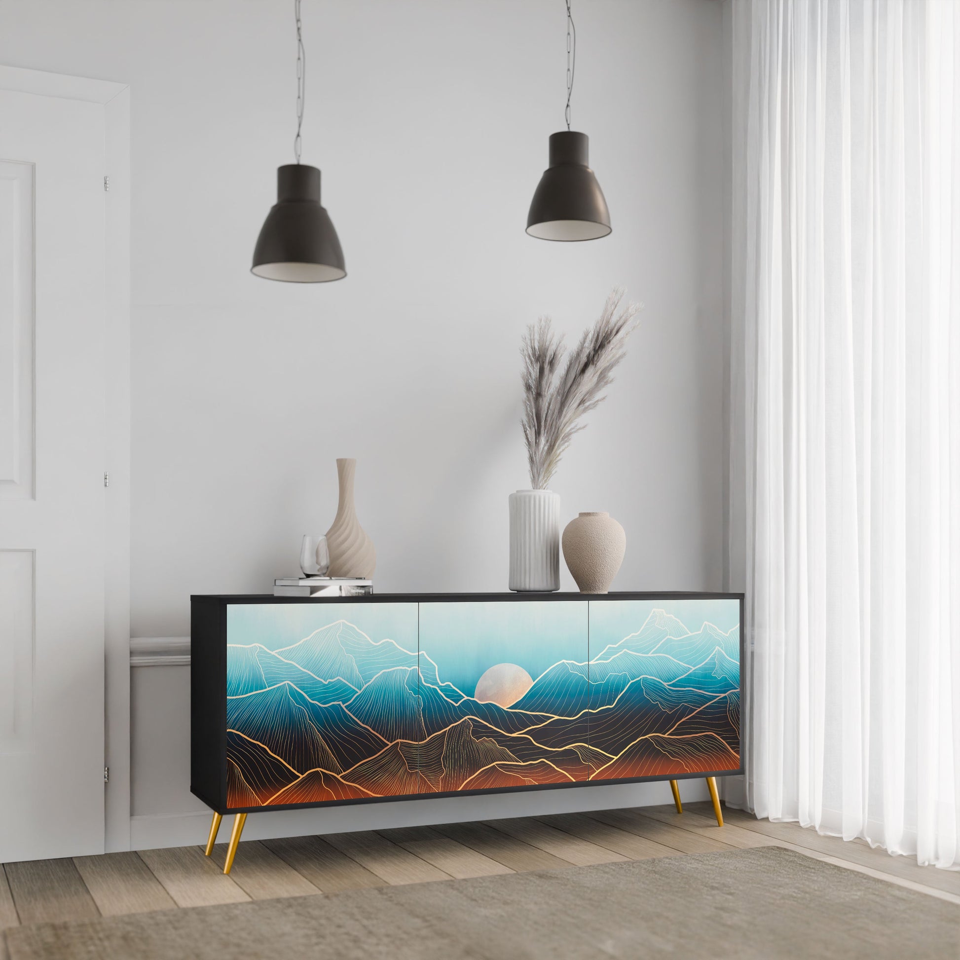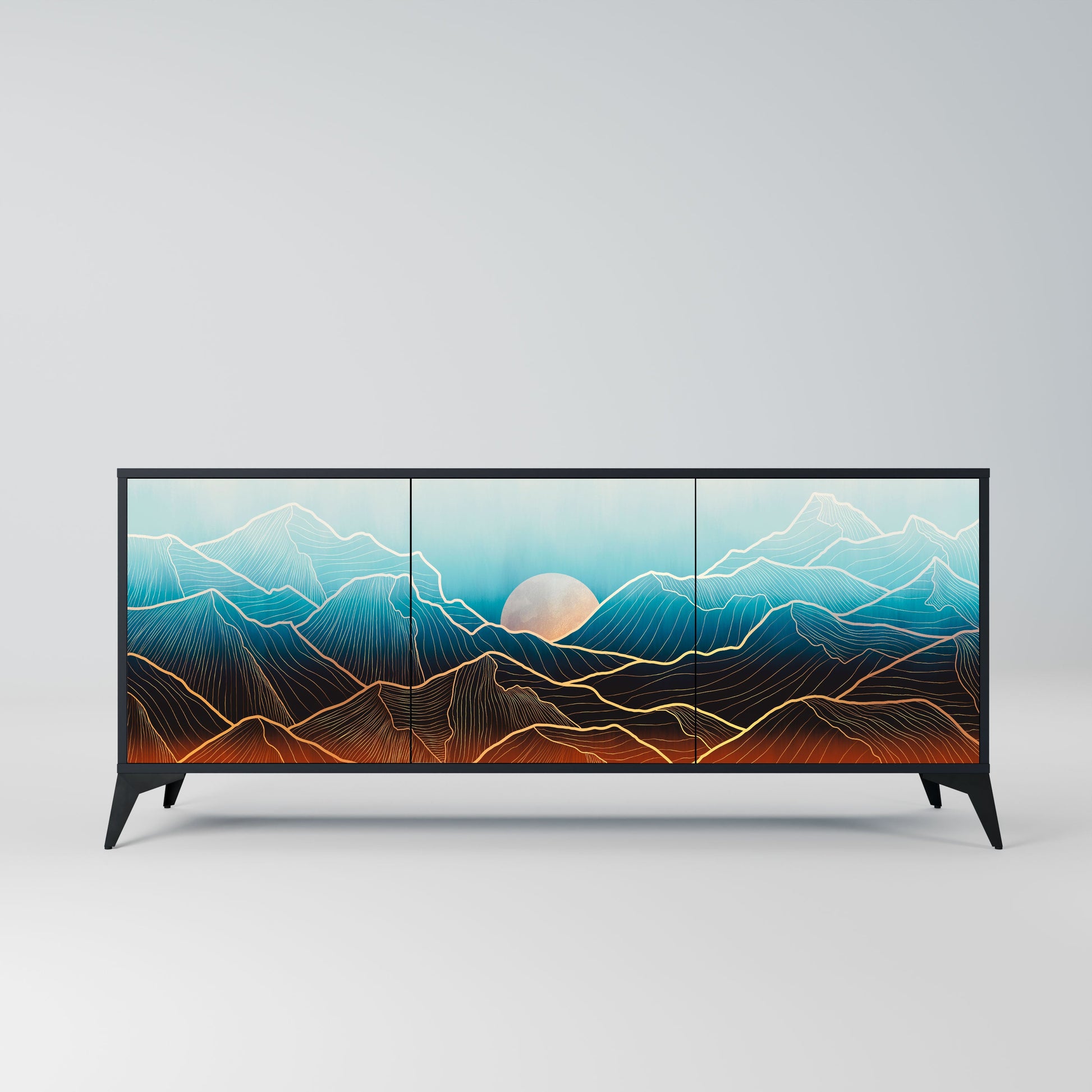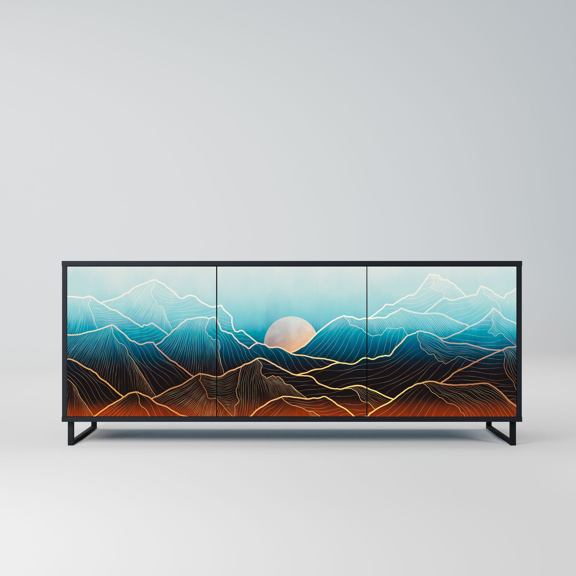 Eleganza e funzionalità in un unico mobile: la nostra credenza a 3 ante con corpo nero è la soluzione perfetta per gli amanti degli interni eleganti e moderni. Il corpo nero enfatizza il carattere audace del mobile, mentre i frontali con una stampa unica aggiungono un tocco artistico. Si adatta perfettamente al soggiorno, alla camera da letto o all'ufficio, completando sia gli arrangiamenti moderni che quelli industriali.