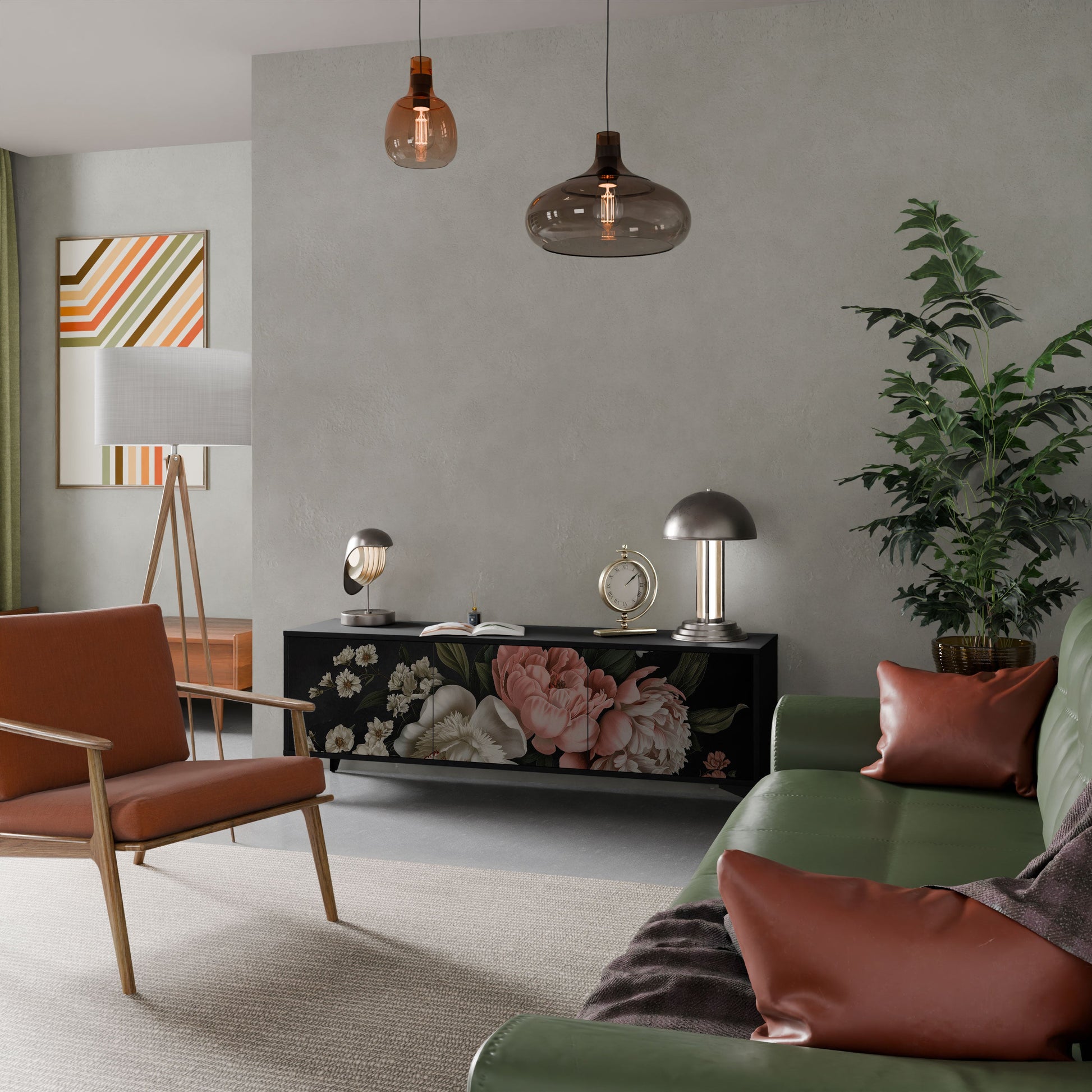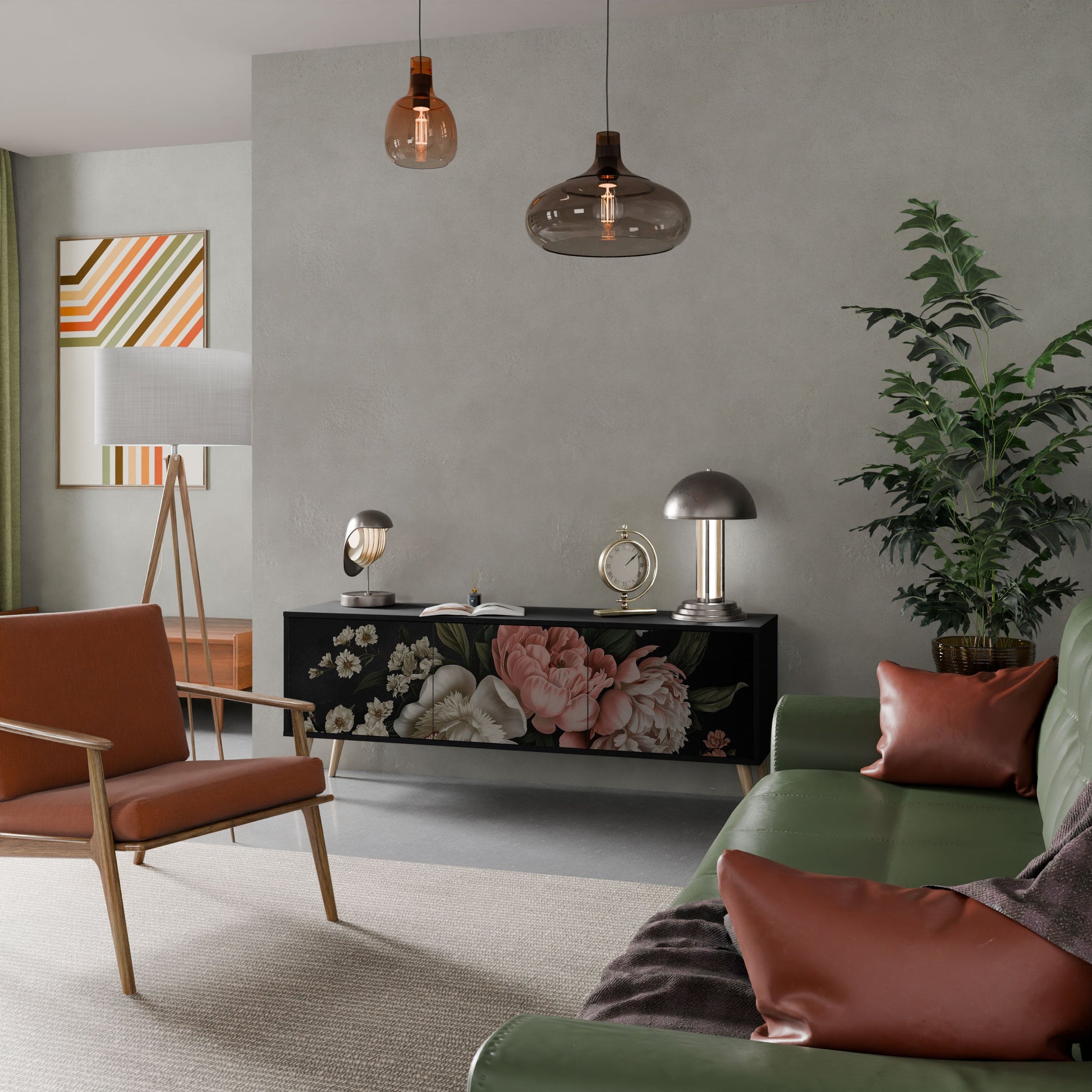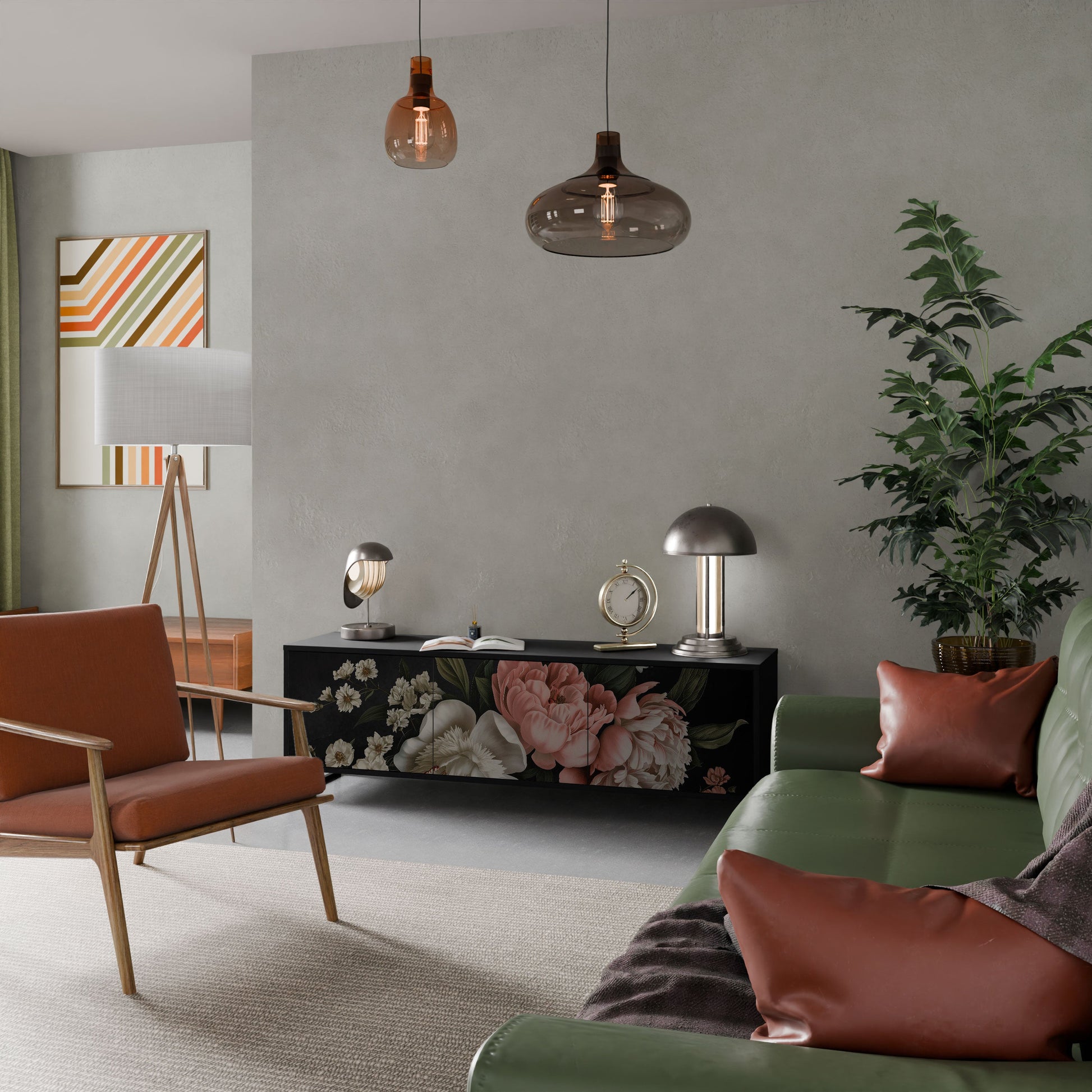 Il corpo nero del supporto crea un accento audace e moderno che si abbina magnificamente ad allestimenti industriali e minimalisti. I frontali con una stampa di design aggiungono carattere e unicità, rendendo questo pezzo non solo pratico ma anche un elemento decorativo di spicco.