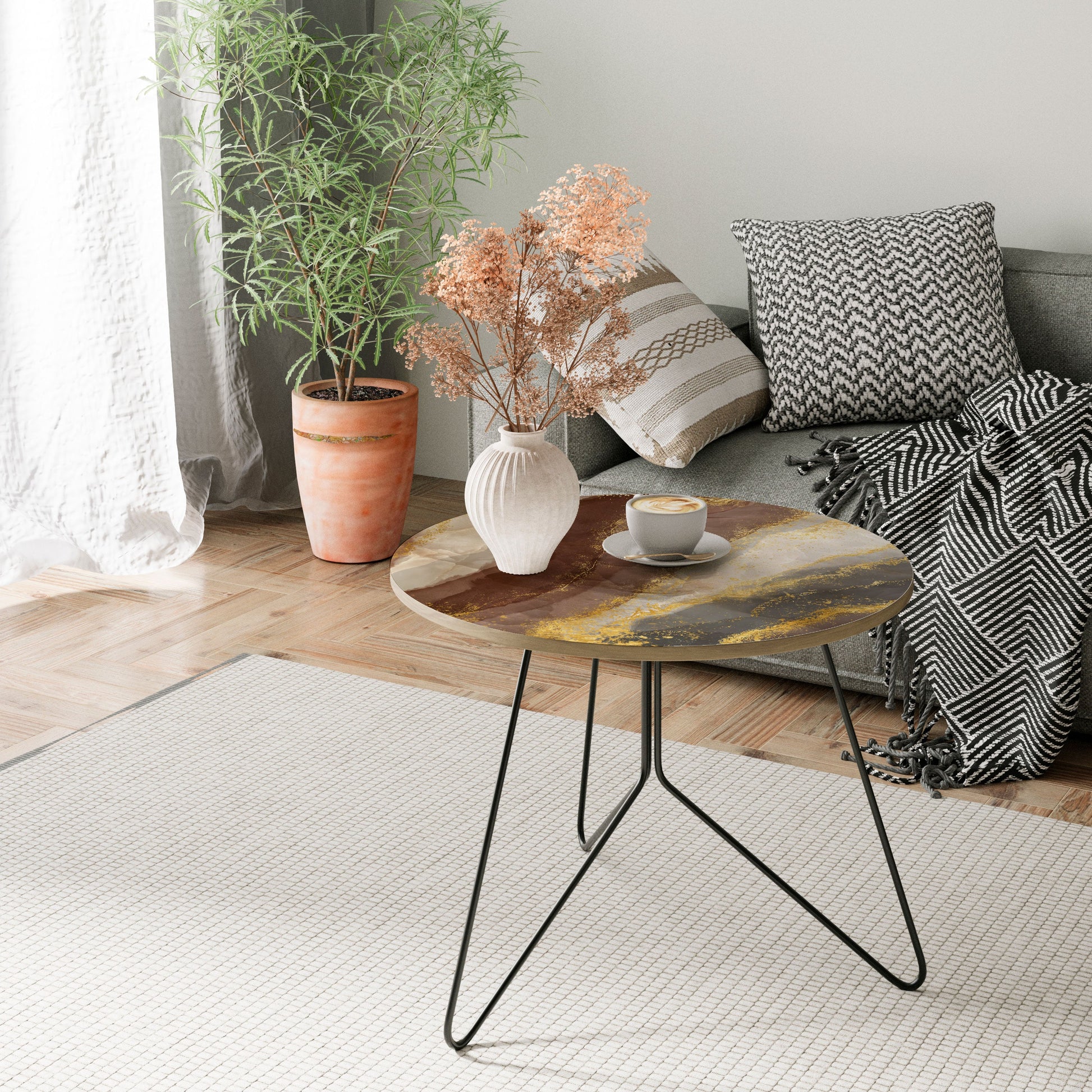 Scopri la versatilità e lo stile dei nostri tavolini da caffè di design, ora disponibili in quattro eleganti combinazioni di finiture per gambe e bordi del piano. Che tu preferisca la calda eleganza delle gambe dorate o la moderna raffinatezza delle gambe nere, ogni opzione si abbina perfettamente all'effetto rovere naturale o all'elegante bordo nero del piano, permettendoti di adattare il tavolo al tuo arredamento.