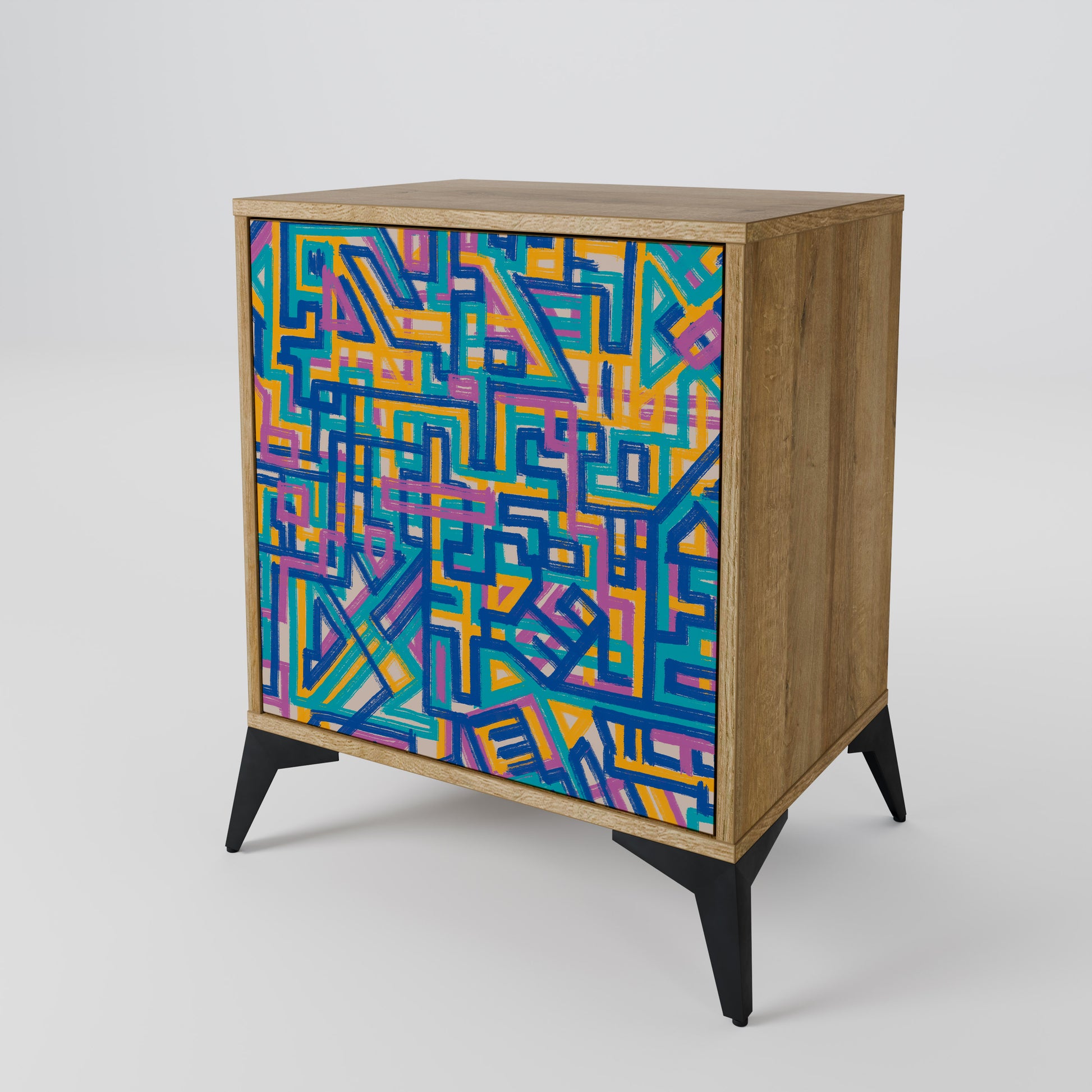 L'elegante frontale con una stampa discreta aggiunge un tocco moderno, rendendo la credenza non solo un elemento pratico ma anche decorativo per gli interni.
