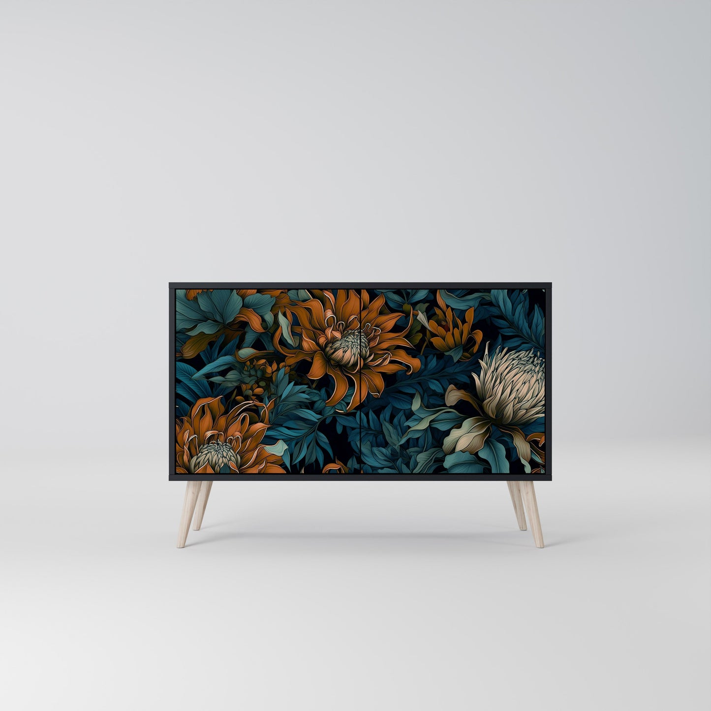 Eleganza e funzionalità in un unico mobile: la nostra credenza a 2 ante con corpo nero è la soluzione perfetta per gli amanti degli interni eleganti e moderni. Il corpo nero enfatizza il carattere audace del mobile, mentre i frontali con una stampa unica aggiungono un tocco artistico. Si adatta perfettamente al soggiorno, alla camera da letto o all'ufficio, completando sia gli arrangiamenti moderni che quelli industriali.