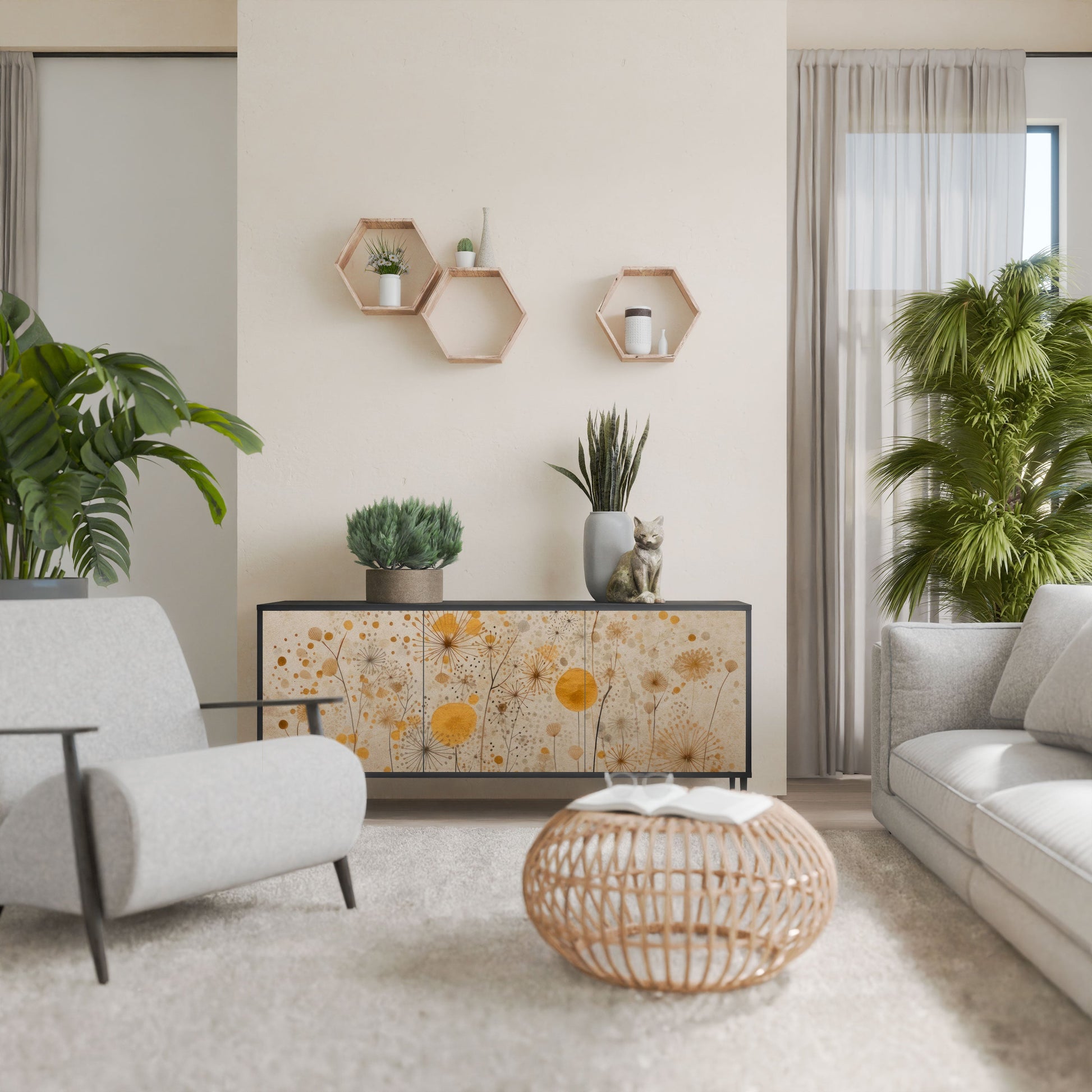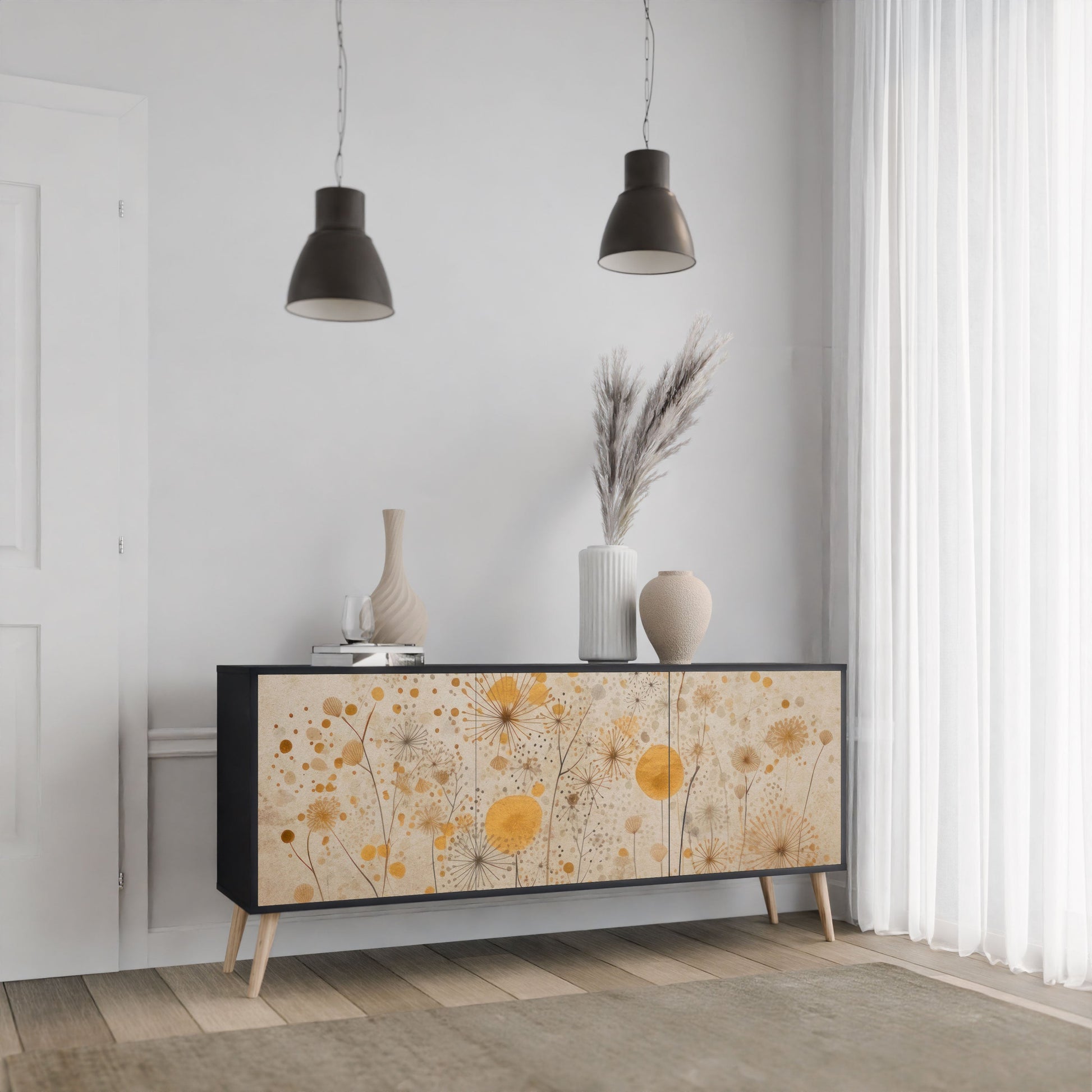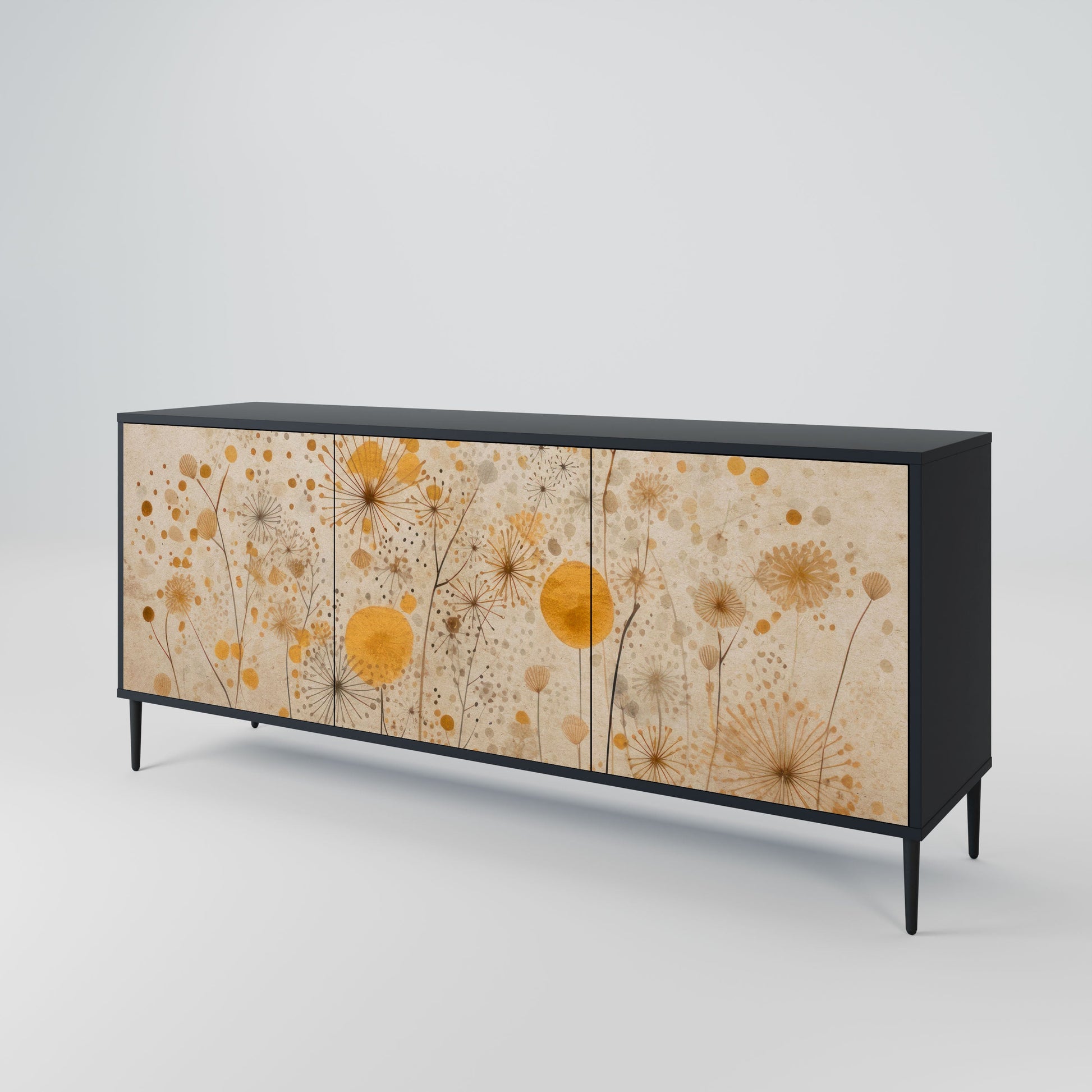Eleganza e funzionalità in un unico mobile: la nostra credenza a 3 ante con corpo nero è la soluzione perfetta per gli amanti degli interni eleganti e moderni. Il corpo nero enfatizza il carattere audace del mobile, mentre i frontali con una stampa unica aggiungono un tocco artistico. Si adatta perfettamente al soggiorno, alla camera da letto o all'ufficio, completando sia gli arrangiamenti moderni che quelli industriali.