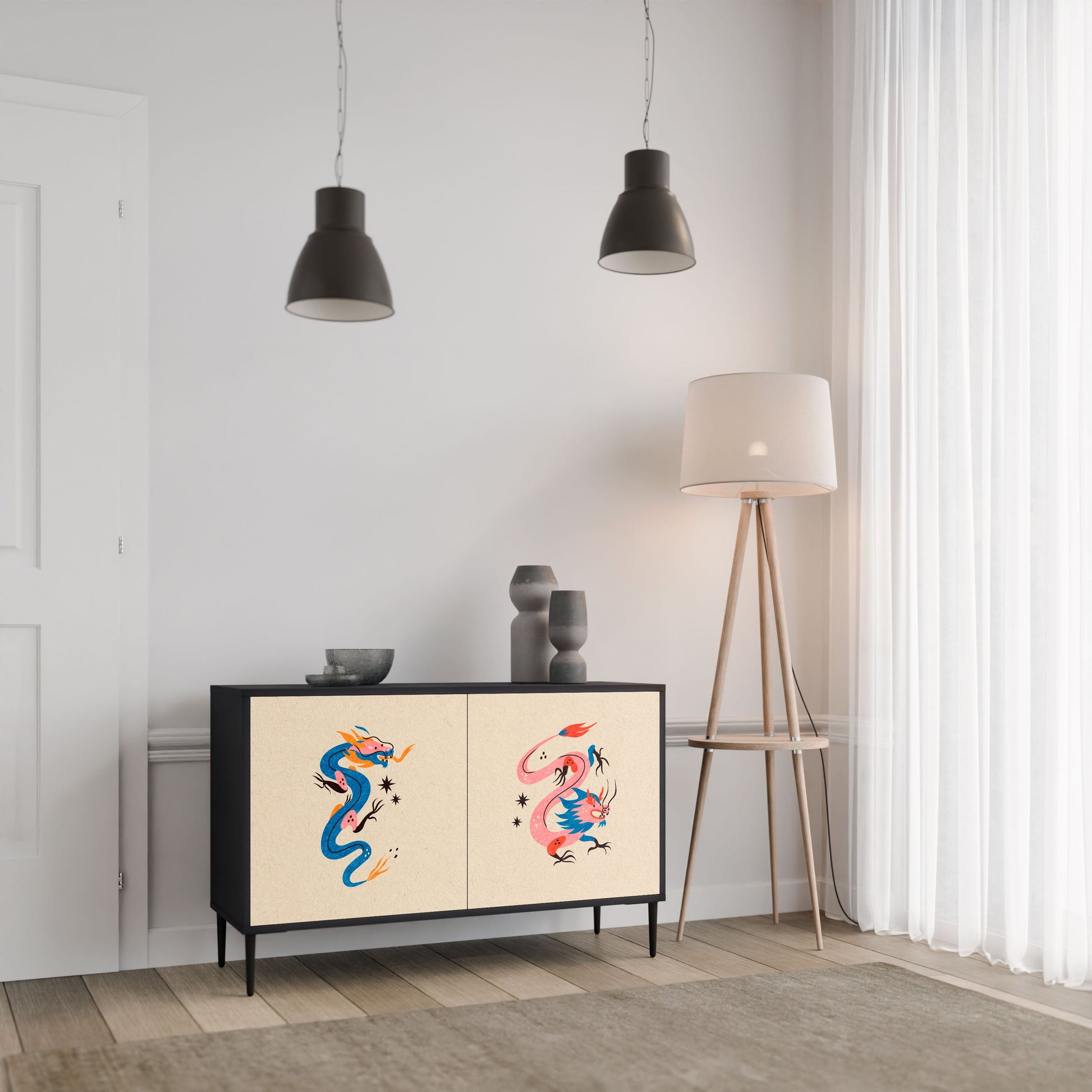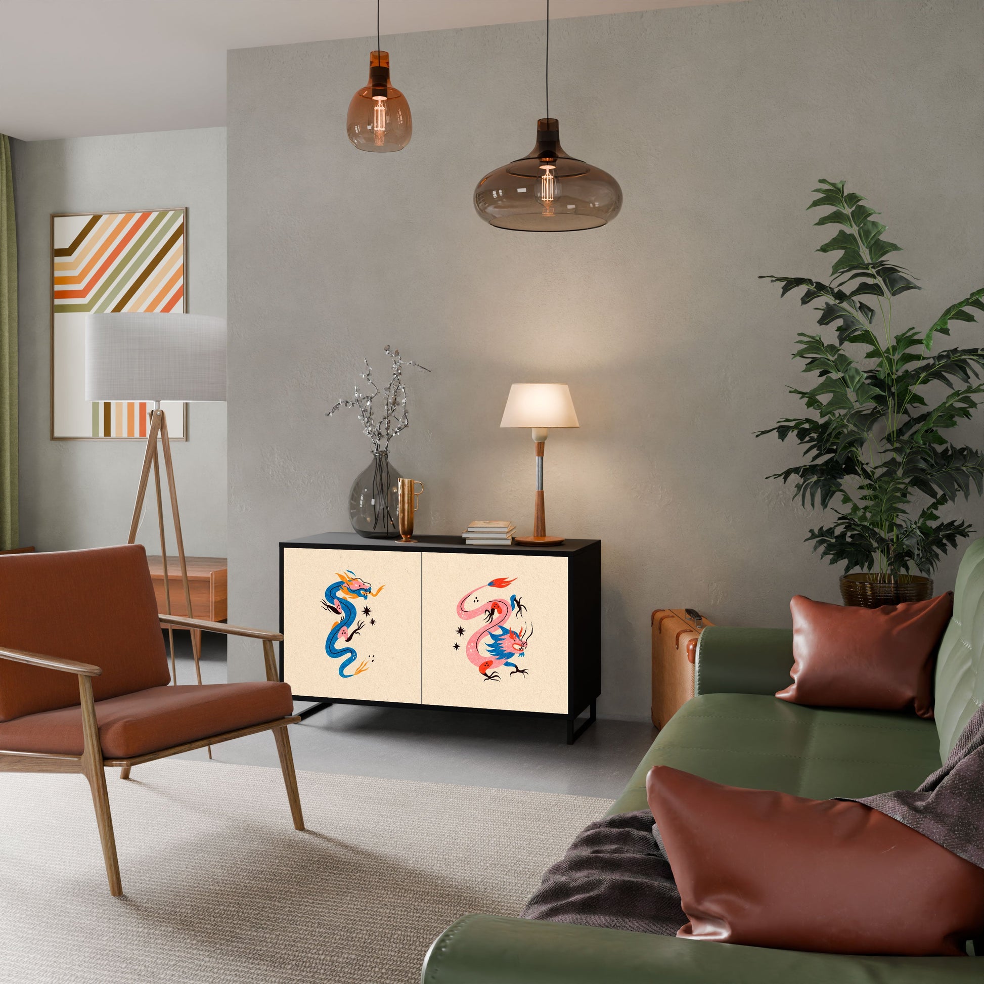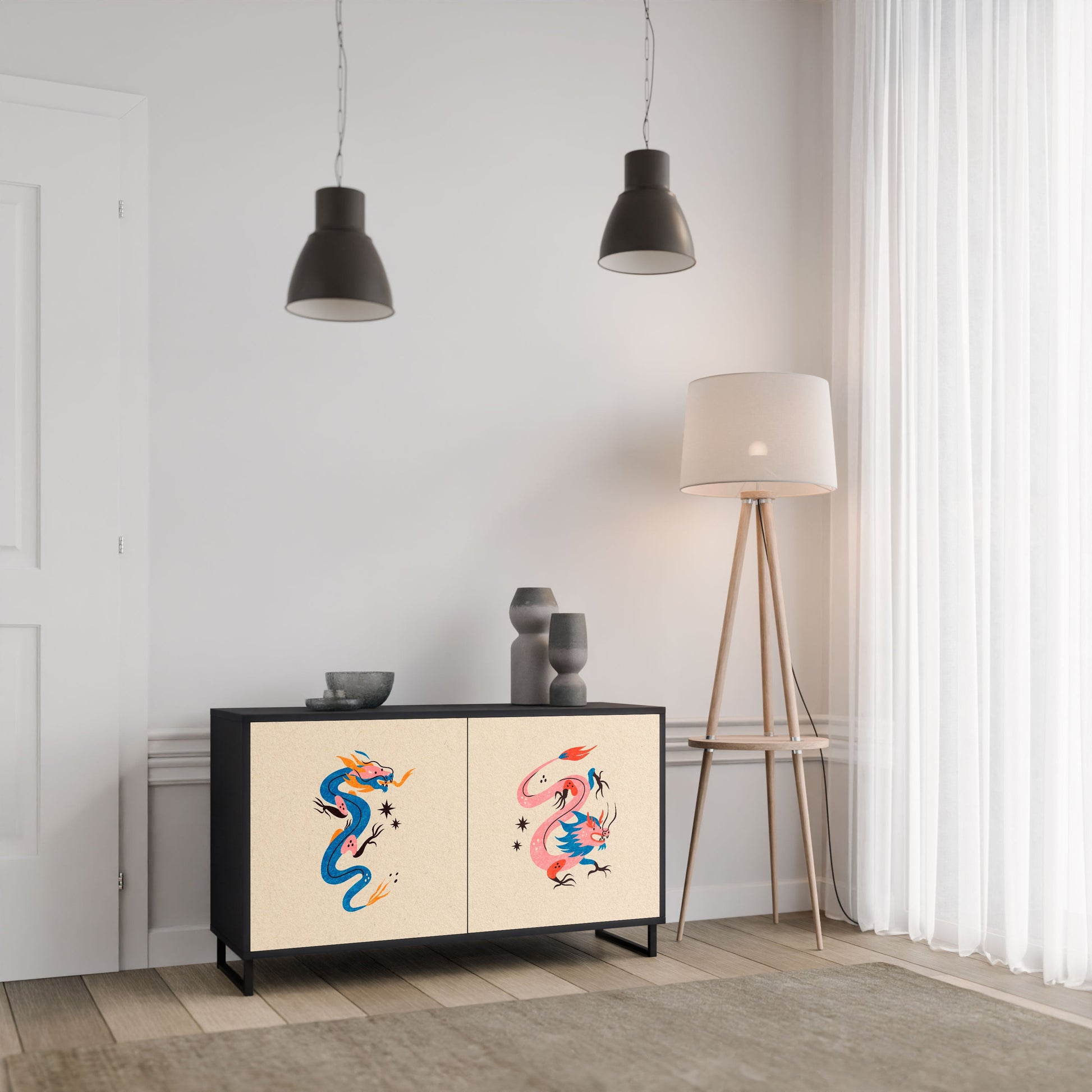 Eleganza e funzionalità in un unico mobile: la nostra credenza a 2 ante con corpo nero è la soluzione perfetta per gli amanti degli interni eleganti e moderni. Il corpo nero enfatizza il carattere audace del mobile, mentre i frontali con una stampa unica aggiungono un tocco artistico. Si adatta perfettamente al soggiorno, alla camera da letto o all'ufficio, completando sia gli arrangiamenti moderni che quelli industriali.