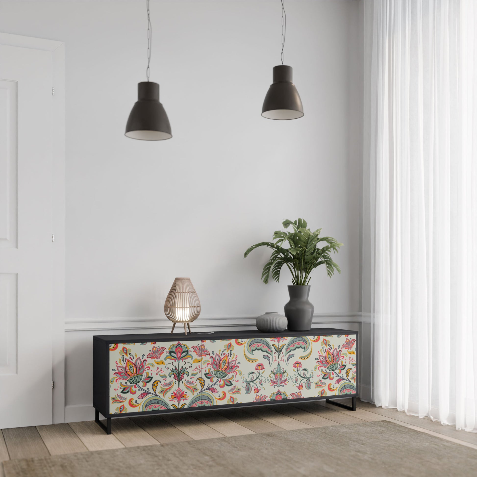 Il corpo nero del supporto crea un accento audace e moderno che si abbina magnificamente ad allestimenti industriali e minimalisti. I frontali con una stampa di design aggiungono carattere e unicità, rendendo questo pezzo non solo pratico ma anche un elemento decorativo di spicco.
