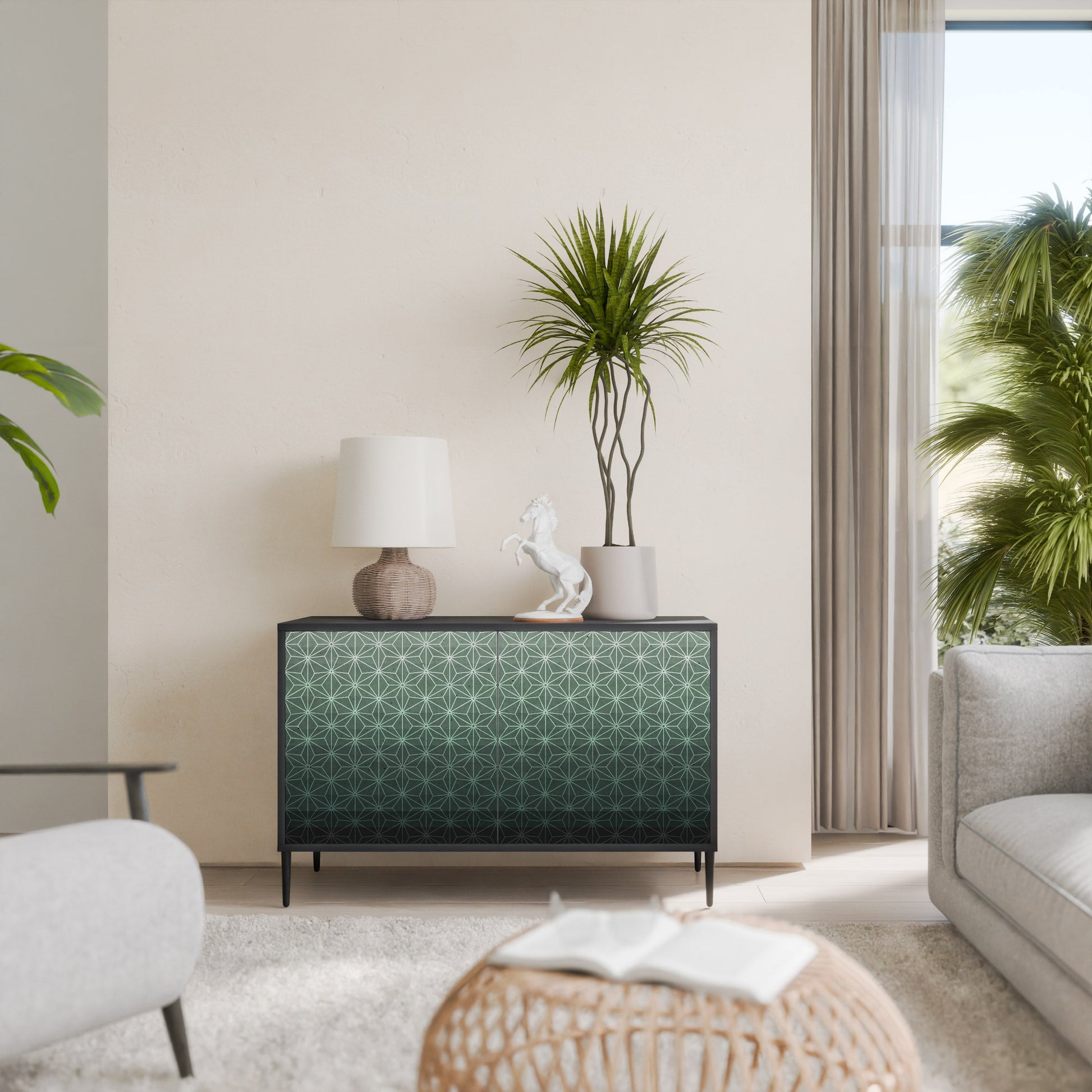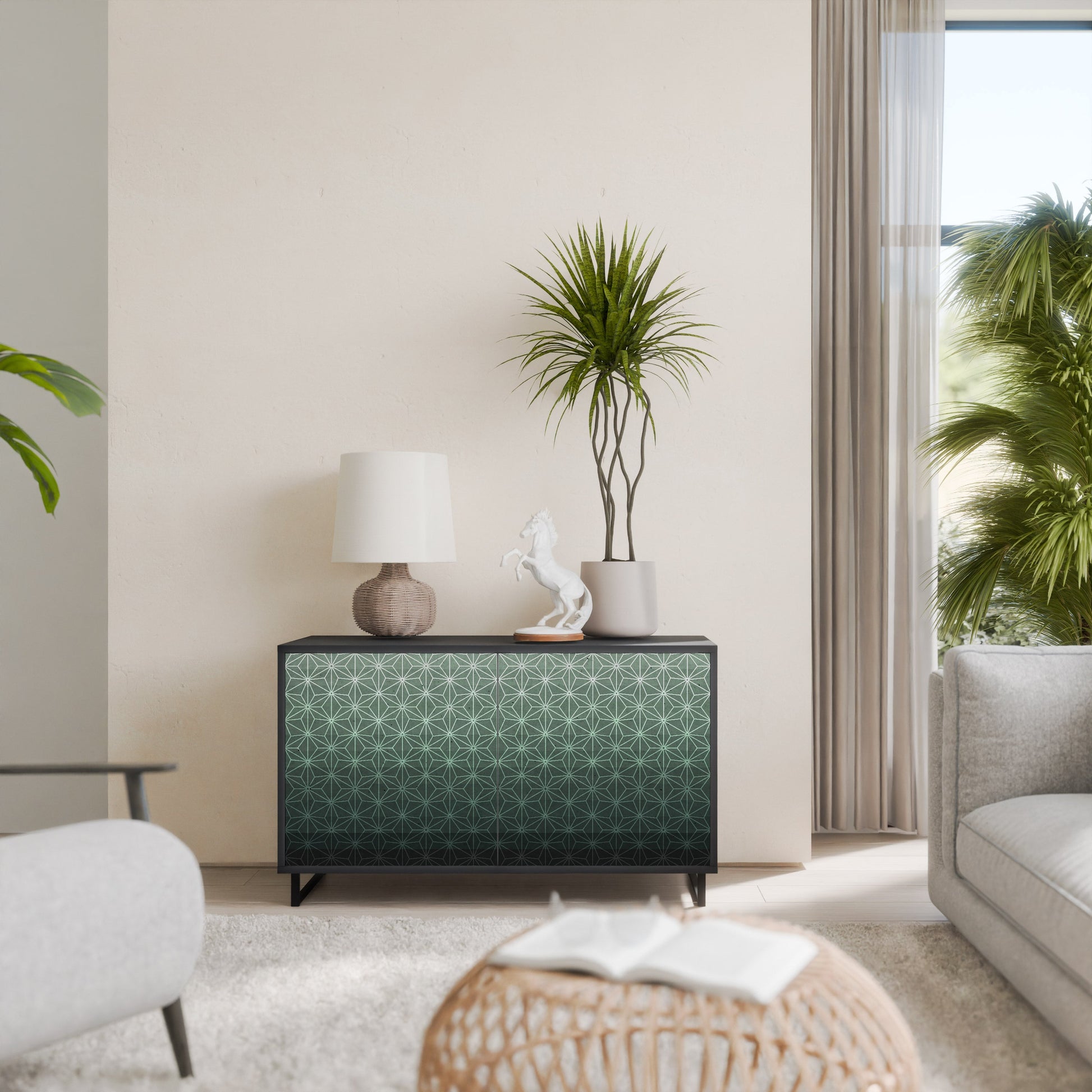 Eleganza e funzionalità in un unico mobile: la nostra credenza a 2 ante con corpo nero è la soluzione perfetta per gli amanti degli interni eleganti e moderni. Il corpo nero enfatizza il carattere audace del mobile, mentre i frontali con una stampa unica aggiungono un tocco artistico. Si adatta perfettamente al soggiorno, alla camera da letto o all'ufficio, completando sia gli arrangiamenti moderni che quelli industriali.