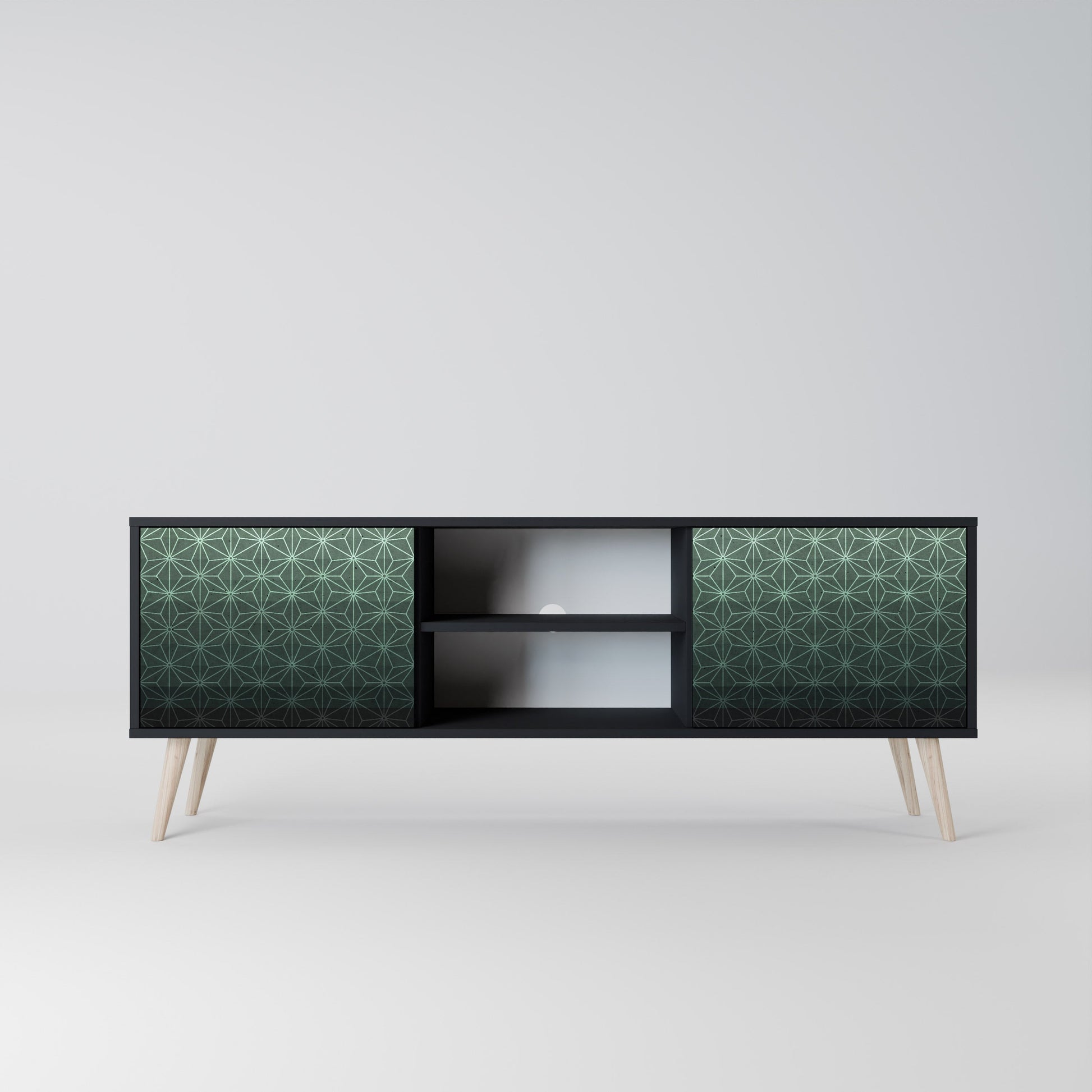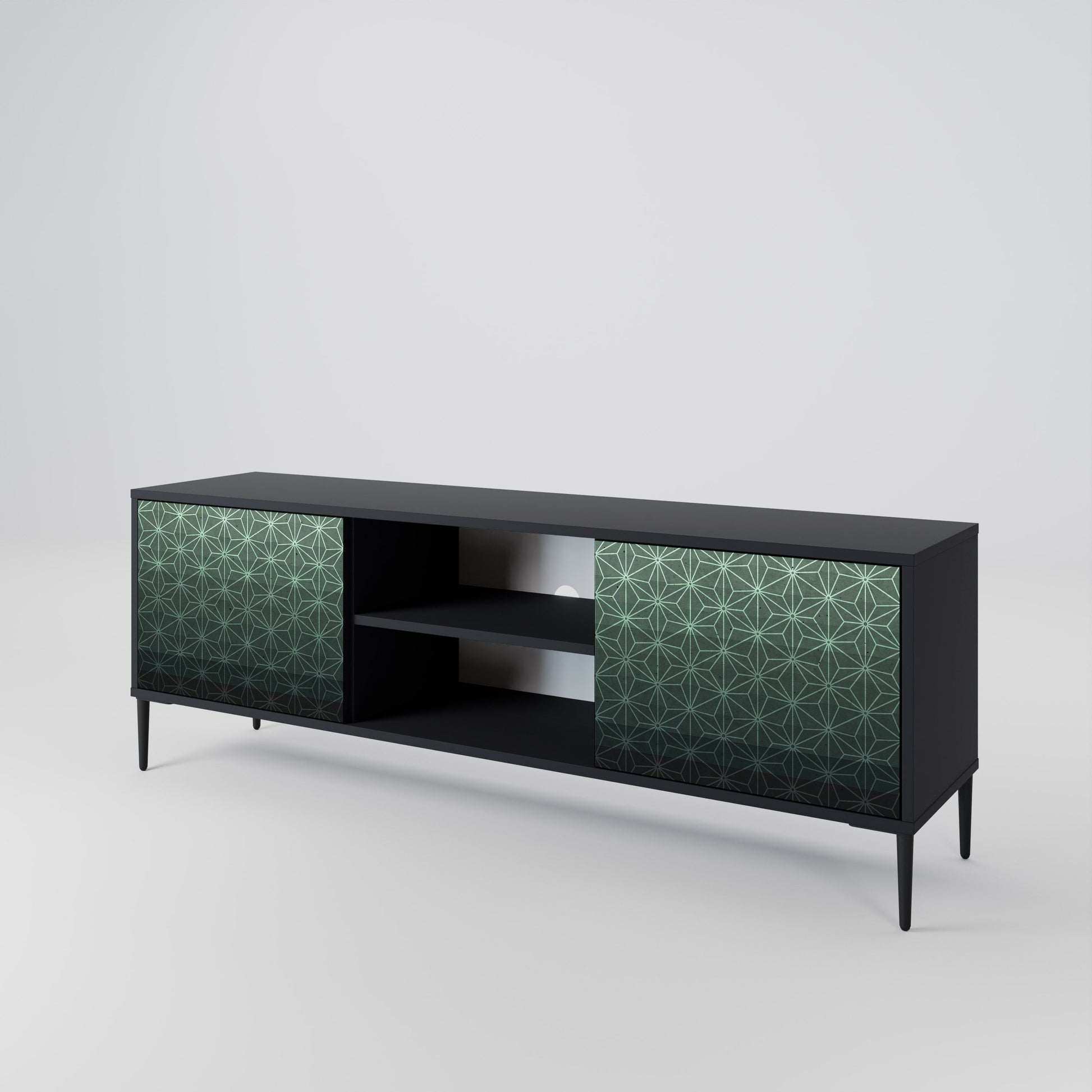 Il corpo nero conferisce al mobile TV un aspetto elegante e moderno, mentre i frontali con una stampa eccezionale attirano l'attenzione, rendendolo il punto focale di ogni stanza. L'interno spazioso offre spazio per dispositivi elettronici, cavi, telecomandi e altri accessori, aiutandoti a mantenere ordine e organizzazione.
