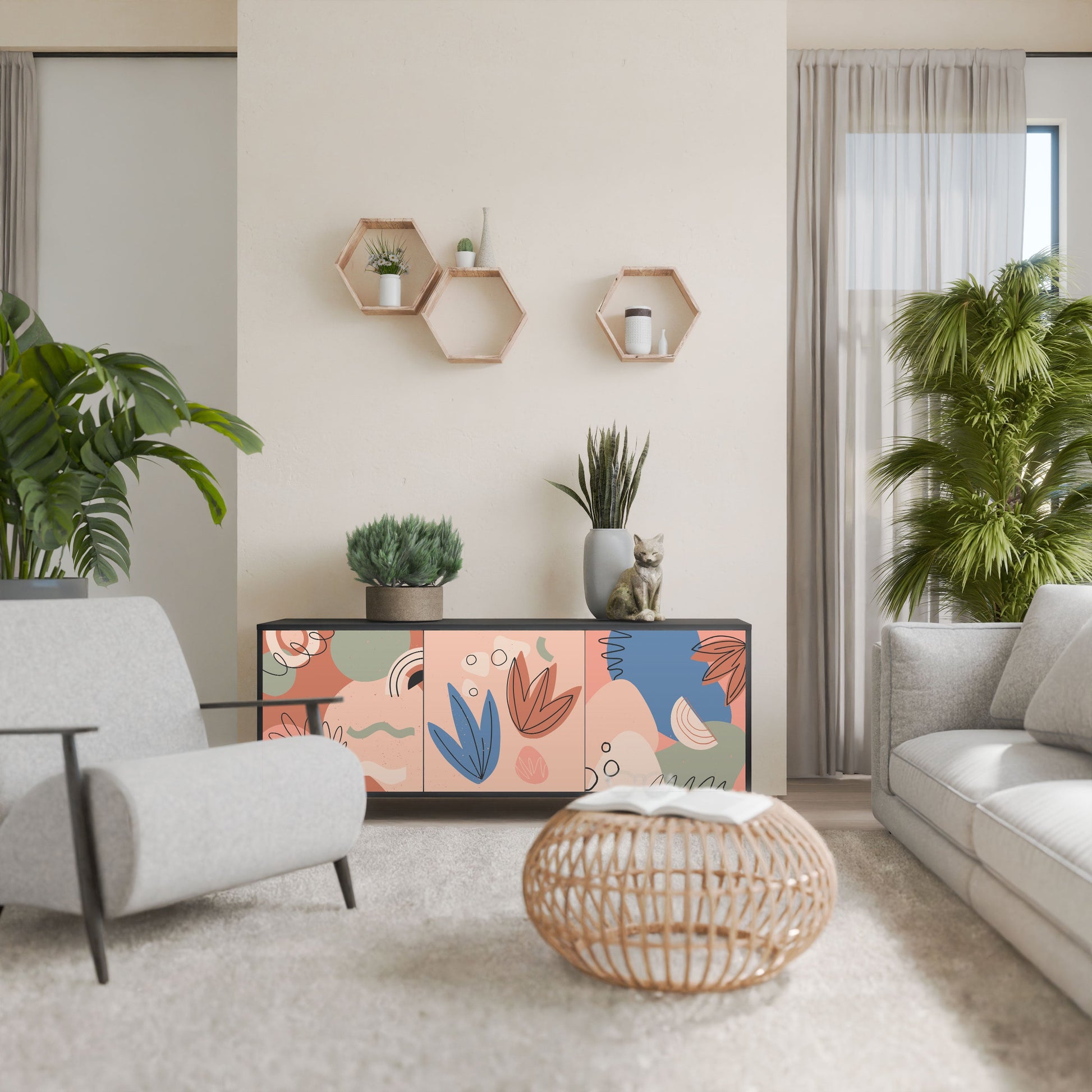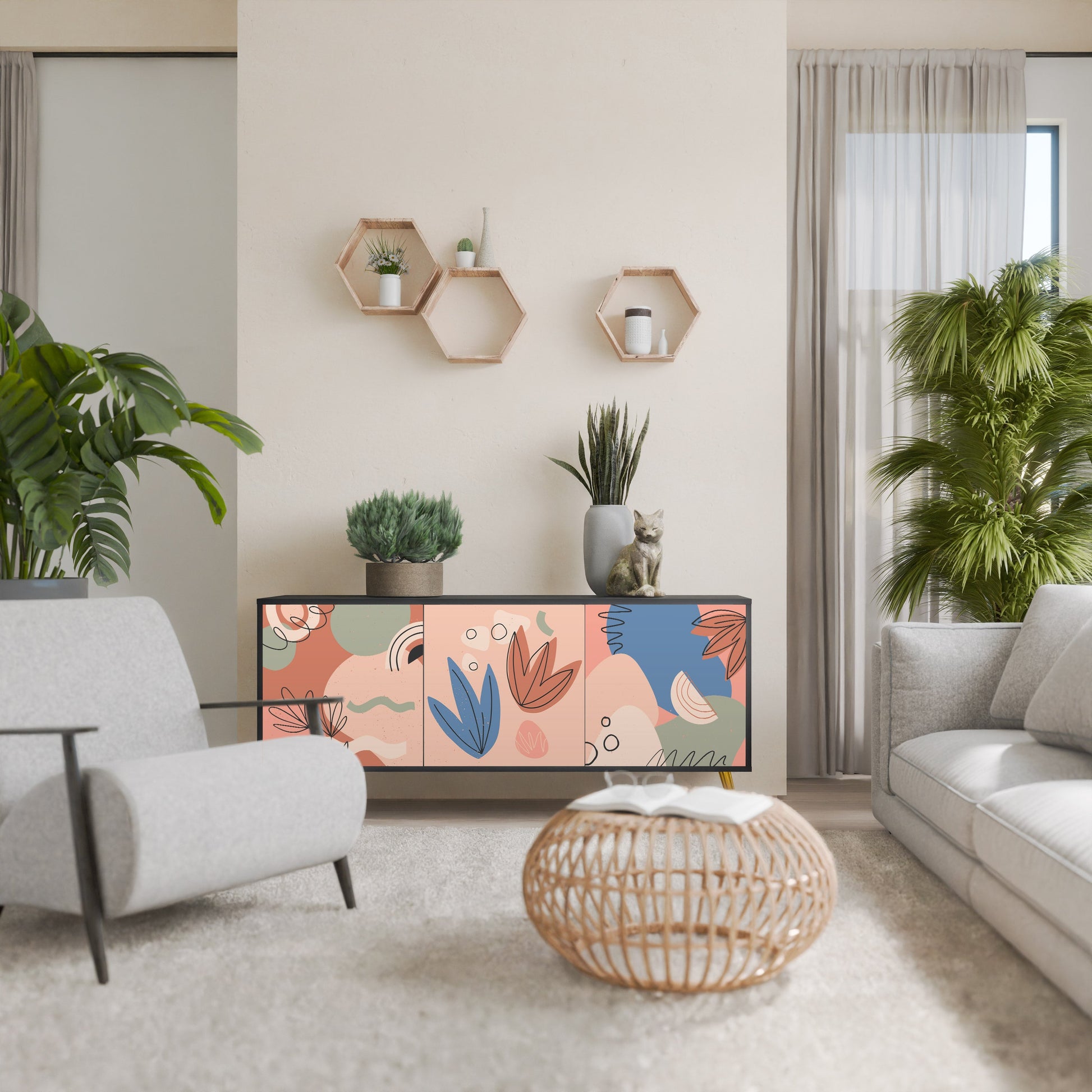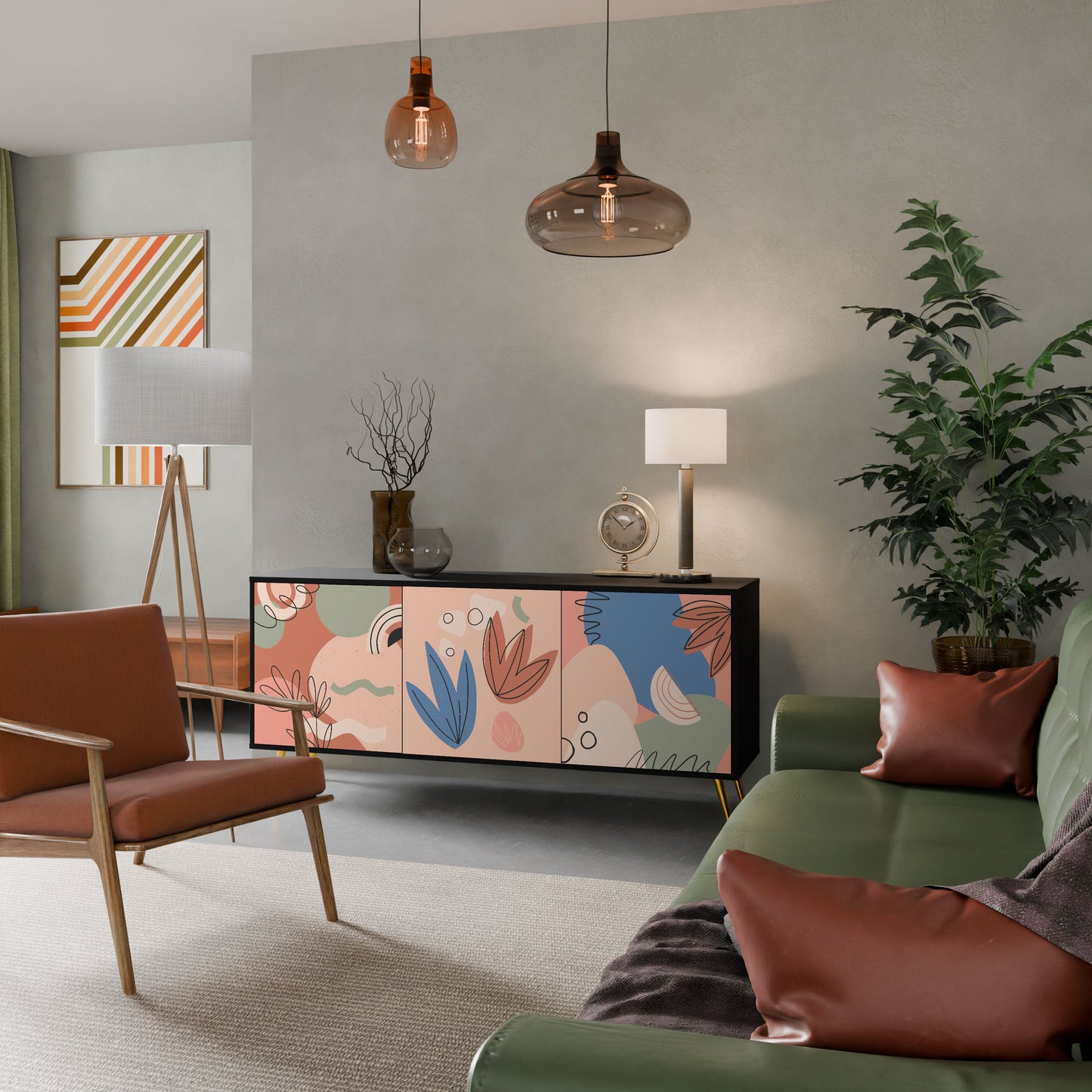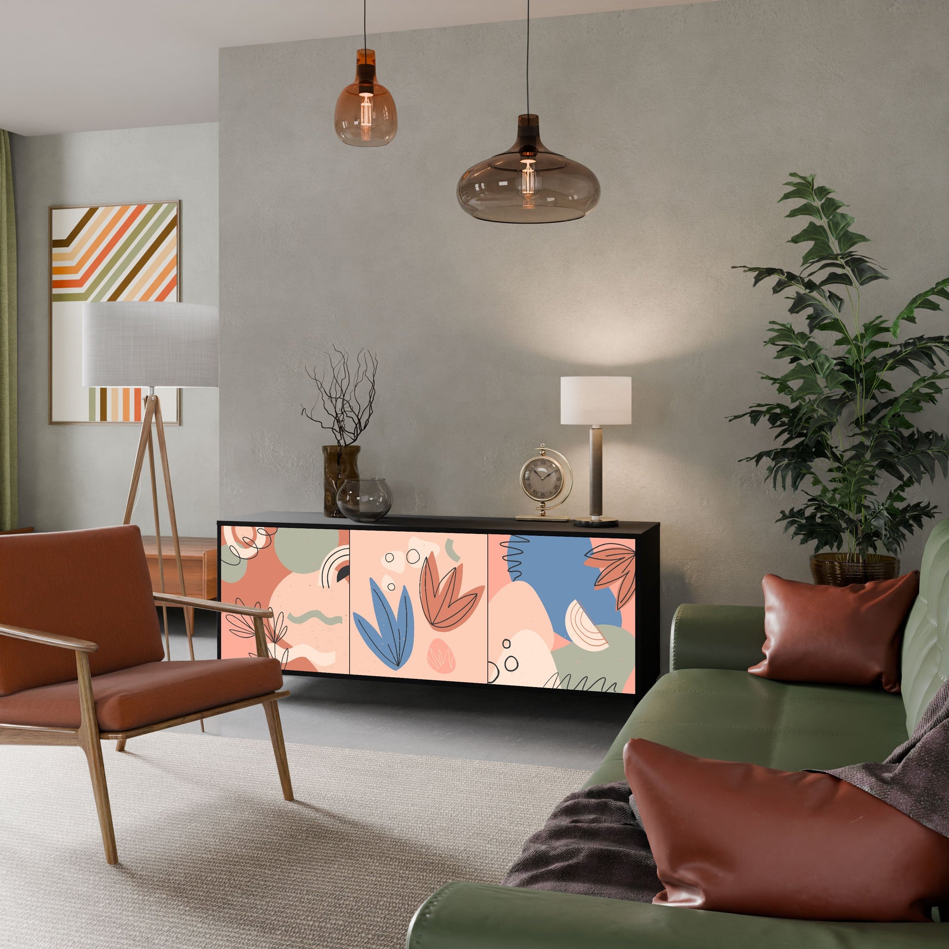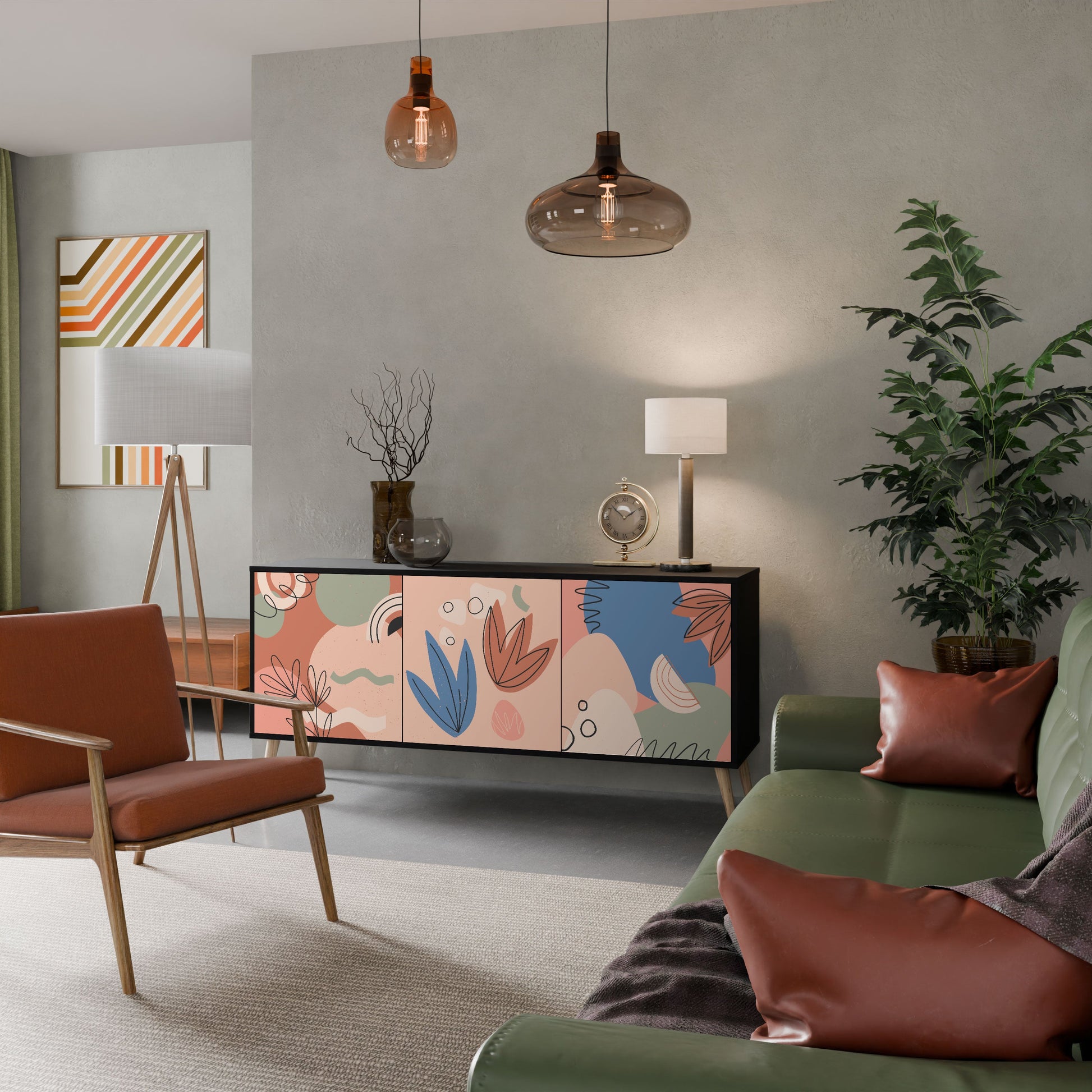 Eleganza e funzionalità in un unico mobile: la nostra credenza a 3 ante con corpo nero è la soluzione perfetta per gli amanti degli interni eleganti e moderni. Il corpo nero enfatizza il carattere audace del mobile, mentre i frontali con una stampa unica aggiungono un tocco artistico. Si adatta perfettamente al soggiorno, alla camera da letto o all'ufficio, completando sia gli arrangiamenti moderni che quelli industriali.