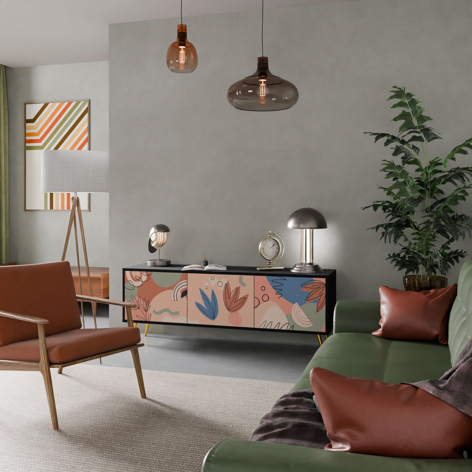 Il corpo nero del supporto crea un accento audace e moderno che si abbina magnificamente ad allestimenti industriali e minimalisti. I frontali con una stampa di design aggiungono carattere e unicità, rendendo questo pezzo non solo pratico ma anche un elemento decorativo di spicco.