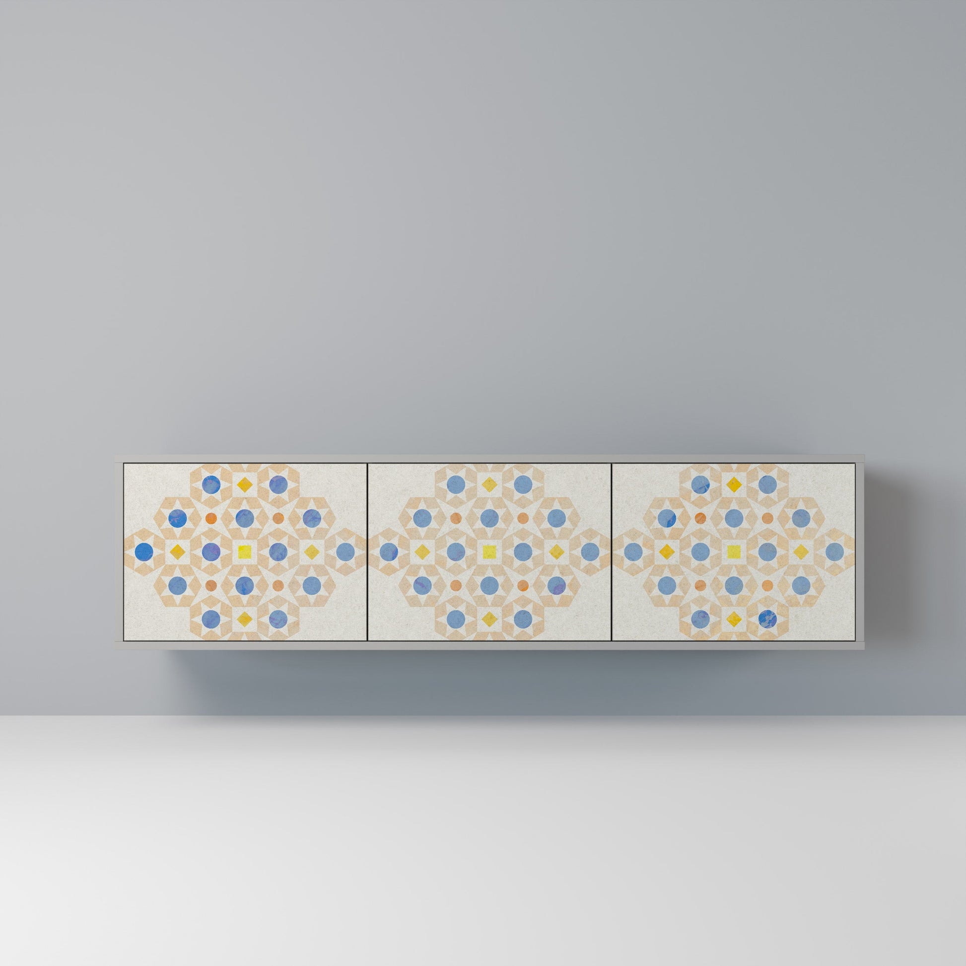 Il corpo grigio del mobile crea un accento raffinato e moderno che si abbina perfettamente ad arredi industriali e minimalisti. I frontali con stampa di design aggiungono carattere e unicità, rendendo questo pezzo non solo pratico, ma anche un elemento decorativo di spicco.