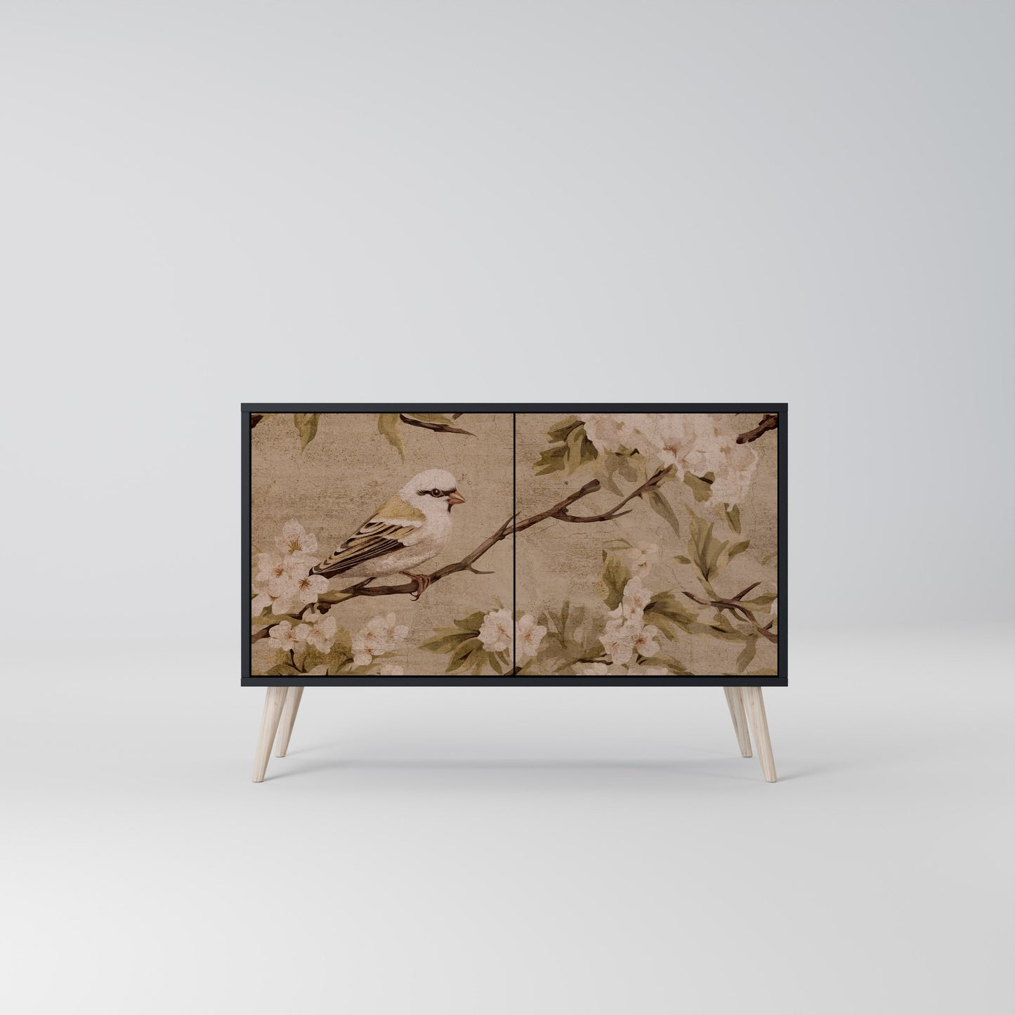 Eleganza e funzionalità in un unico mobile: la nostra credenza a 2 ante con corpo nero è la soluzione perfetta per gli amanti degli interni eleganti e moderni. Il corpo nero enfatizza il carattere audace del mobile, mentre i frontali con una stampa unica aggiungono un tocco artistico. Si adatta perfettamente al soggiorno, alla camera da letto o all'ufficio, completando sia gli arrangiamenti moderni che quelli industriali.