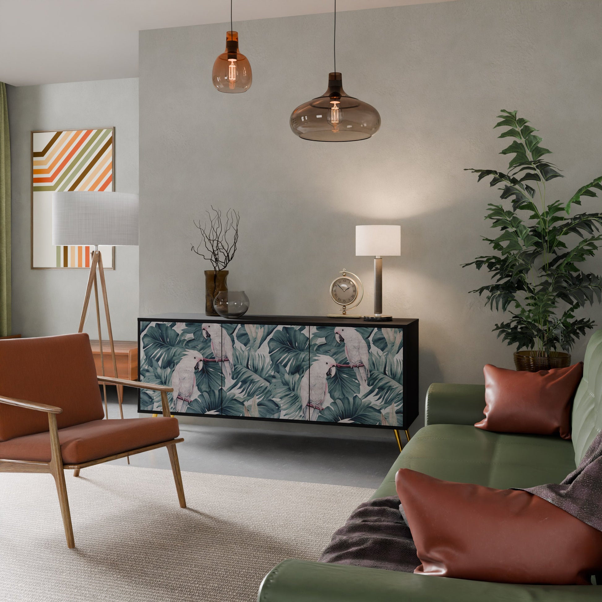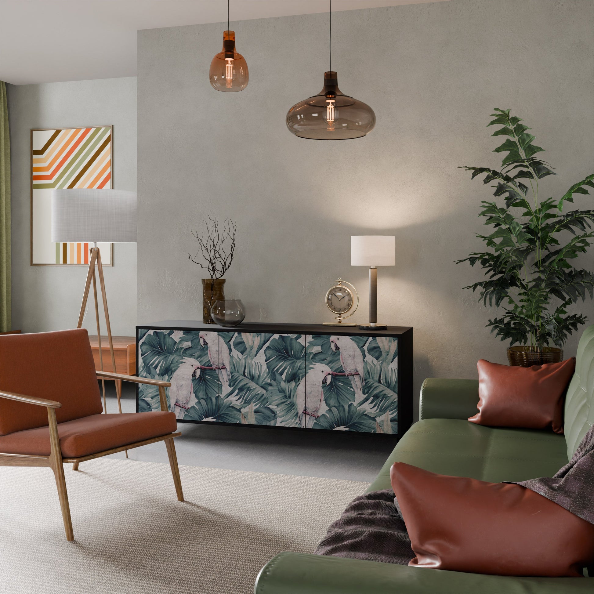 Eleganza e funzionalità in un unico mobile: la nostra credenza a 3 ante con corpo nero è la soluzione perfetta per gli amanti degli interni eleganti e moderni. Il corpo nero enfatizza il carattere audace del mobile, mentre i frontali con una stampa unica aggiungono un tocco artistico. Si adatta perfettamente al soggiorno, alla camera da letto o all'ufficio, completando sia gli arrangiamenti moderni che quelli industriali.