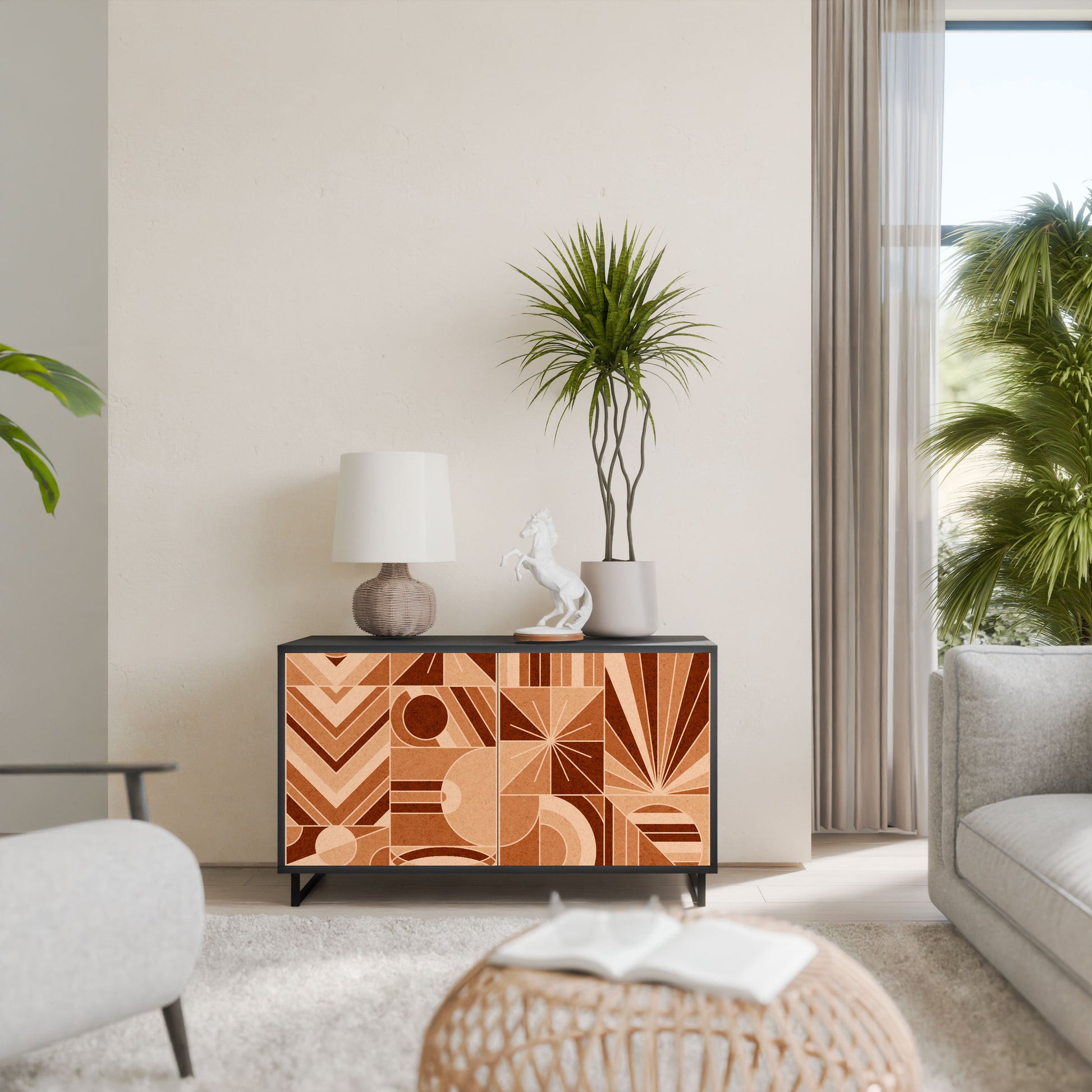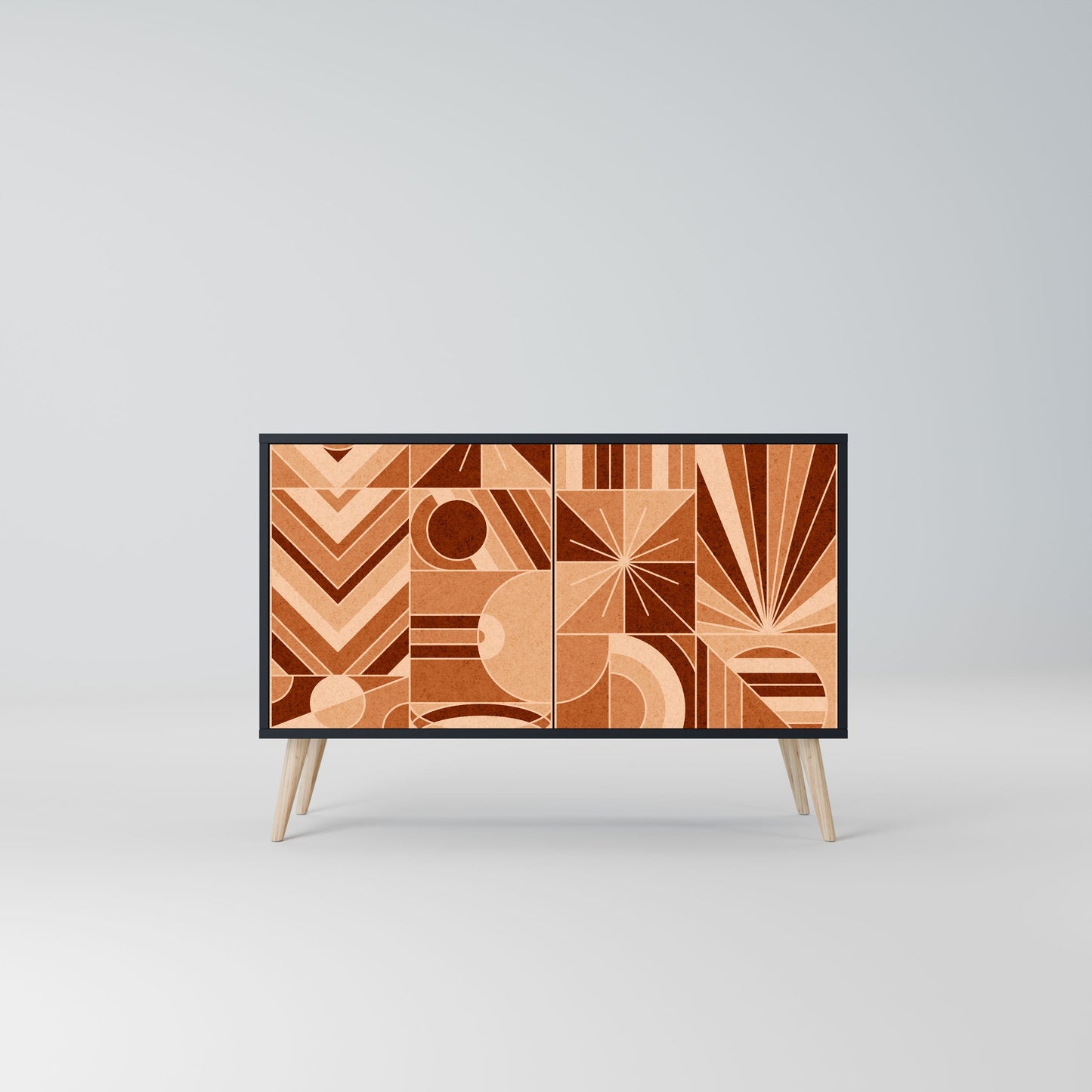 Eleganza e funzionalità in un unico mobile: la nostra credenza a 2 ante con corpo nero è la soluzione perfetta per gli amanti degli interni eleganti e moderni. Il corpo nero enfatizza il carattere audace del mobile, mentre i frontali con una stampa unica aggiungono un tocco artistico. Si adatta perfettamente al soggiorno, alla camera da letto o all'ufficio, completando sia gli arrangiamenti moderni che quelli industriali.