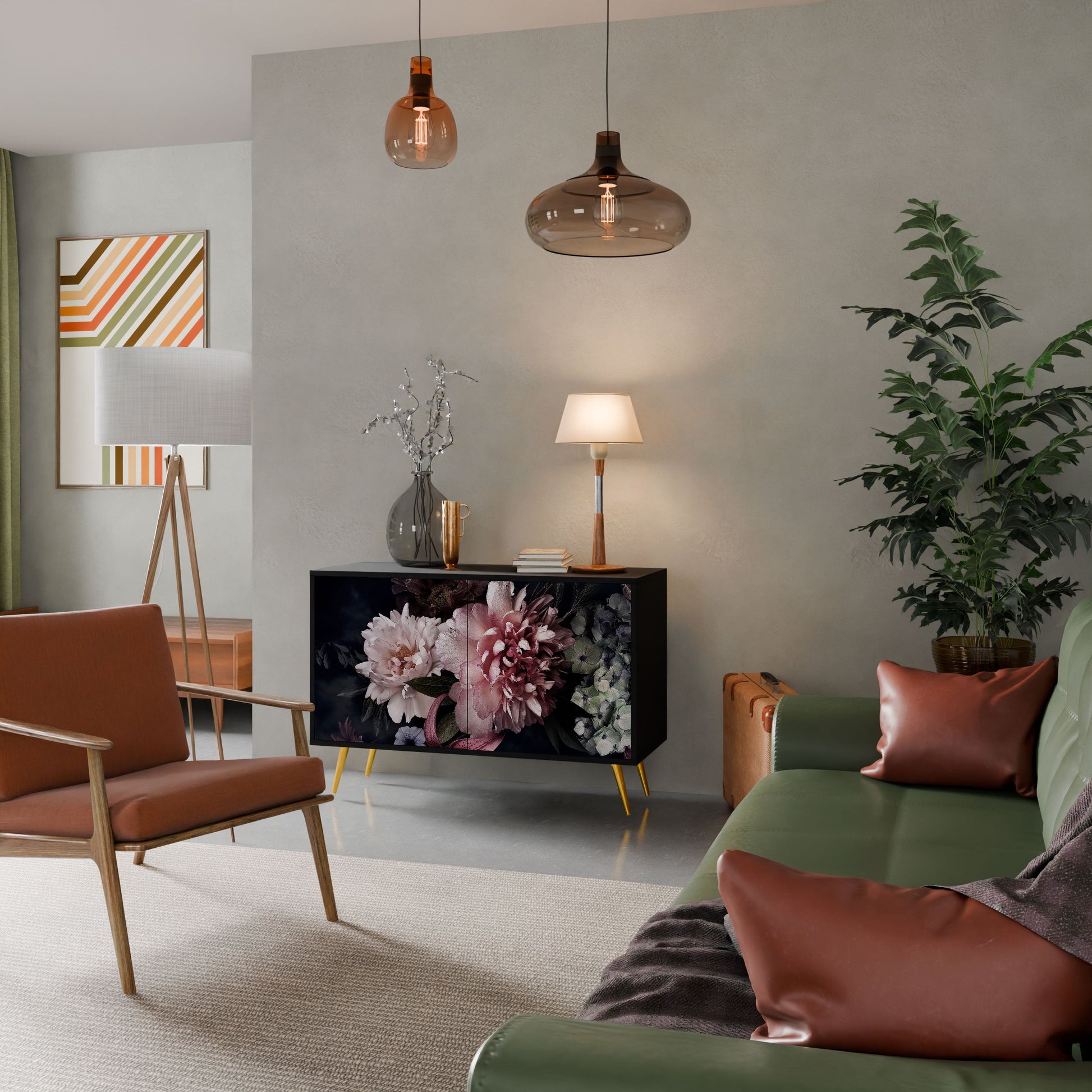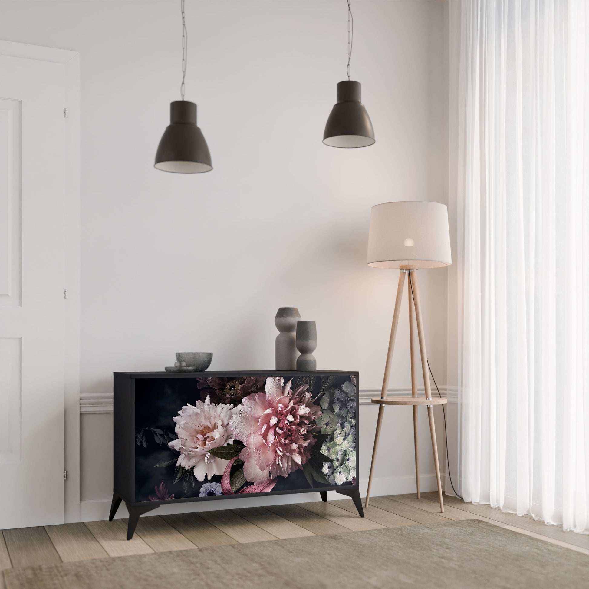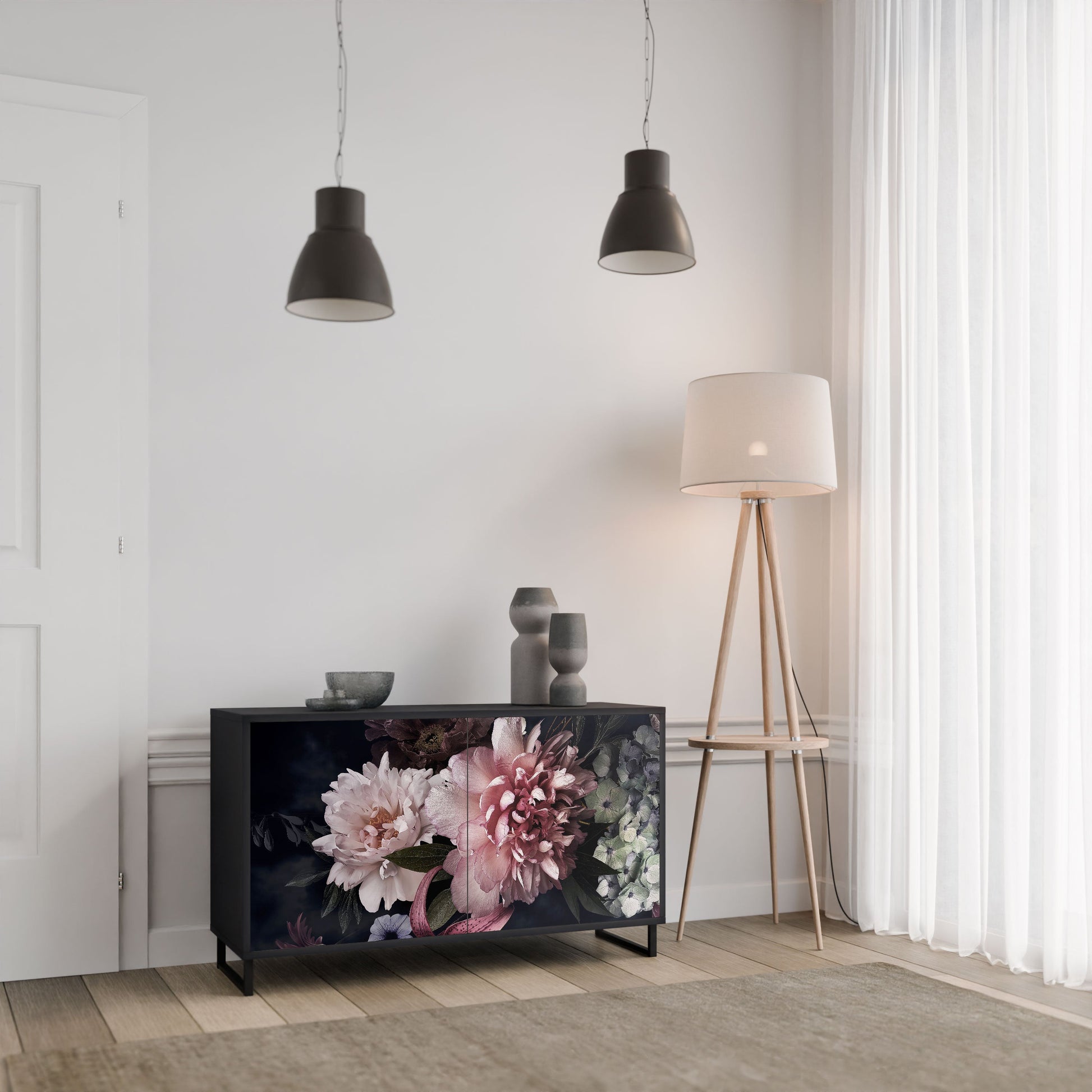 Eleganza e funzionalità in un unico mobile: la nostra credenza a 2 ante con corpo nero è la soluzione perfetta per gli amanti degli interni eleganti e moderni. Il corpo nero enfatizza il carattere audace del mobile, mentre i frontali con una stampa unica aggiungono un tocco artistico. Si adatta perfettamente al soggiorno, alla camera da letto o all'ufficio, completando sia gli arrangiamenti moderni che quelli industriali.