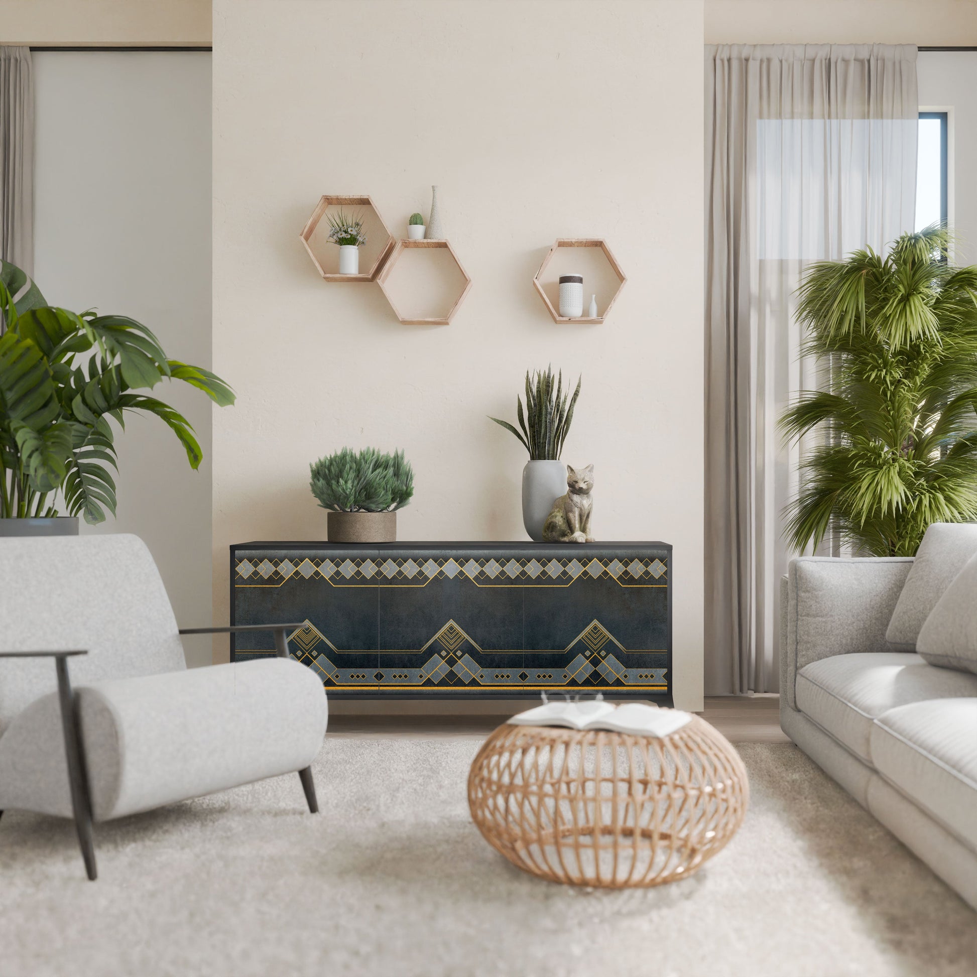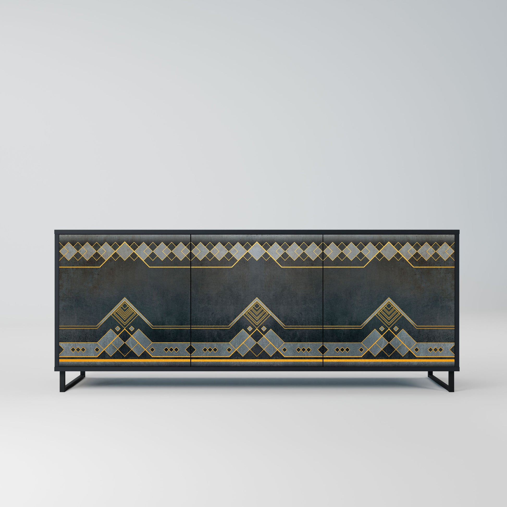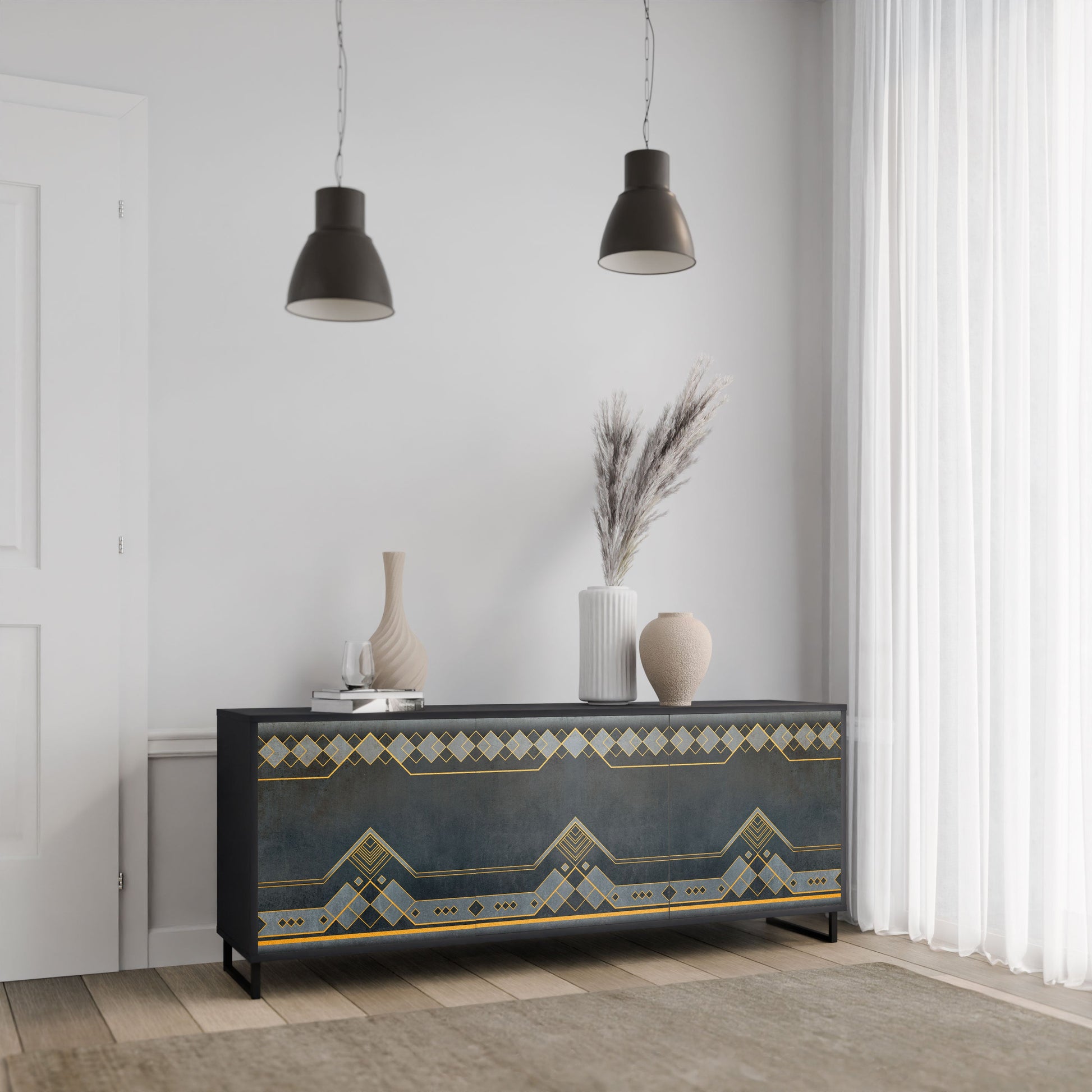 Eleganza e funzionalità in un unico mobile: la nostra credenza a 3 ante con corpo nero è la soluzione perfetta per gli amanti degli interni eleganti e moderni. Il corpo nero enfatizza il carattere audace del mobile, mentre i frontali con una stampa unica aggiungono un tocco artistico. Si adatta perfettamente al soggiorno, alla camera da letto o all'ufficio, completando sia gli arrangiamenti moderni che quelli industriali.