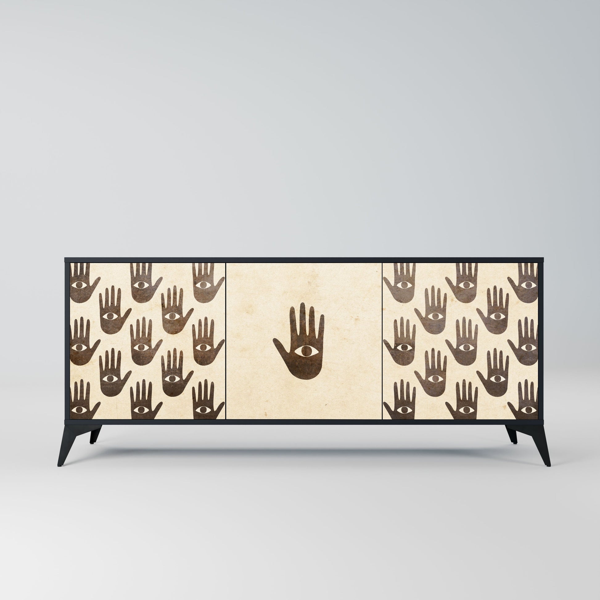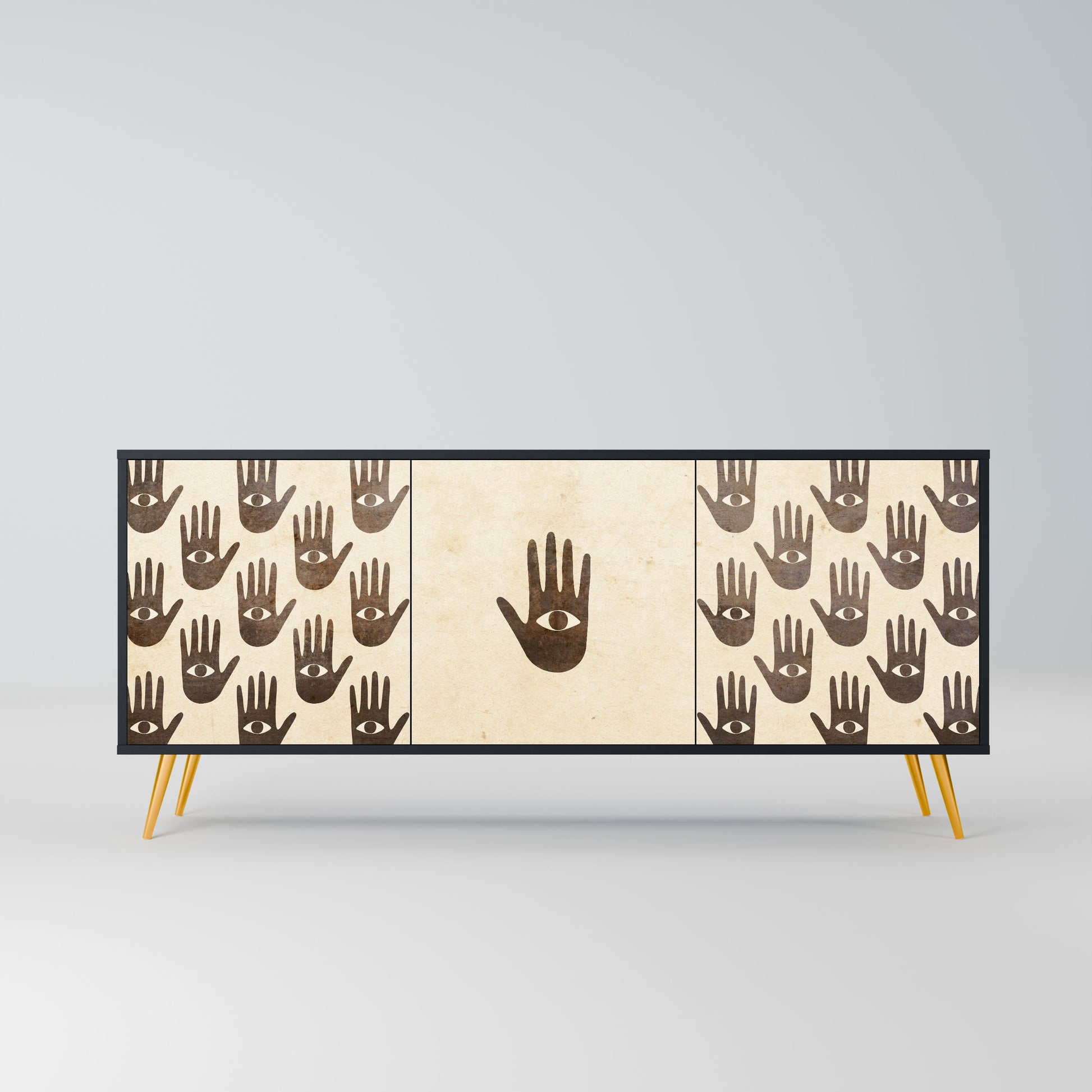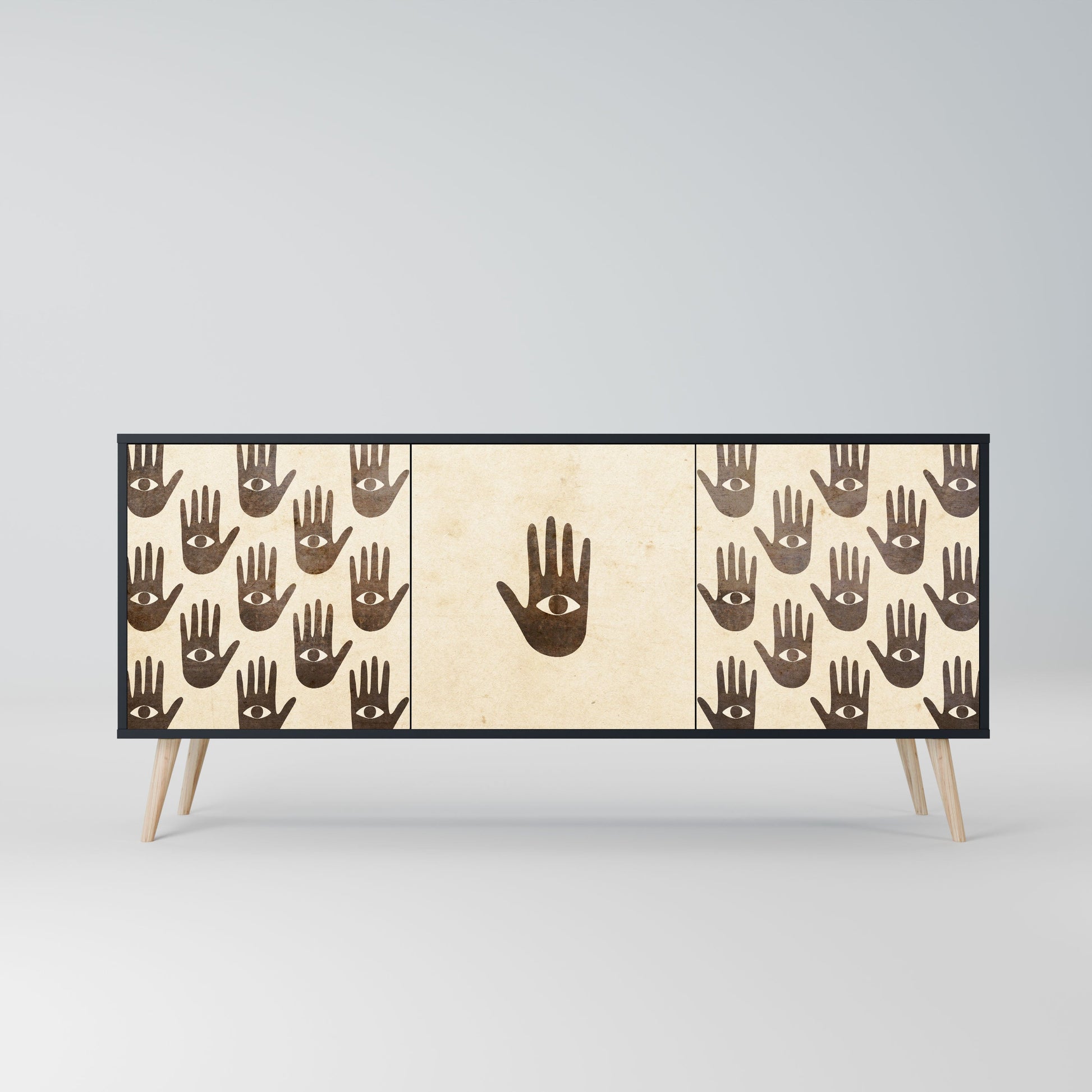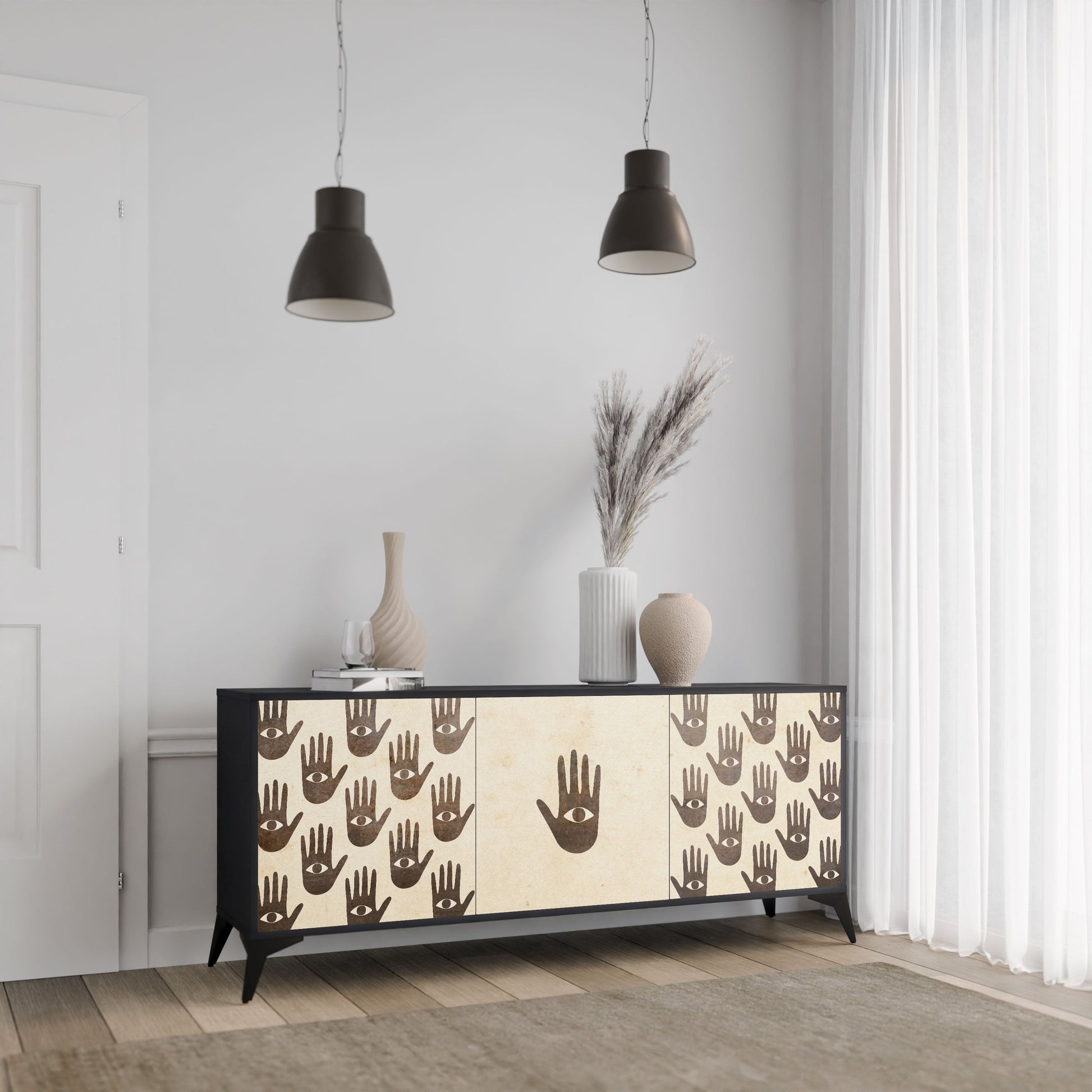 Eleganza e funzionalità in un unico mobile: la nostra credenza a 3 ante con corpo nero è la soluzione perfetta per gli amanti degli interni eleganti e moderni. Il corpo nero enfatizza il carattere audace del mobile, mentre i frontali con una stampa unica aggiungono un tocco artistico. Si adatta perfettamente al soggiorno, alla camera da letto o all'ufficio, completando sia gli arrangiamenti moderni che quelli industriali.
