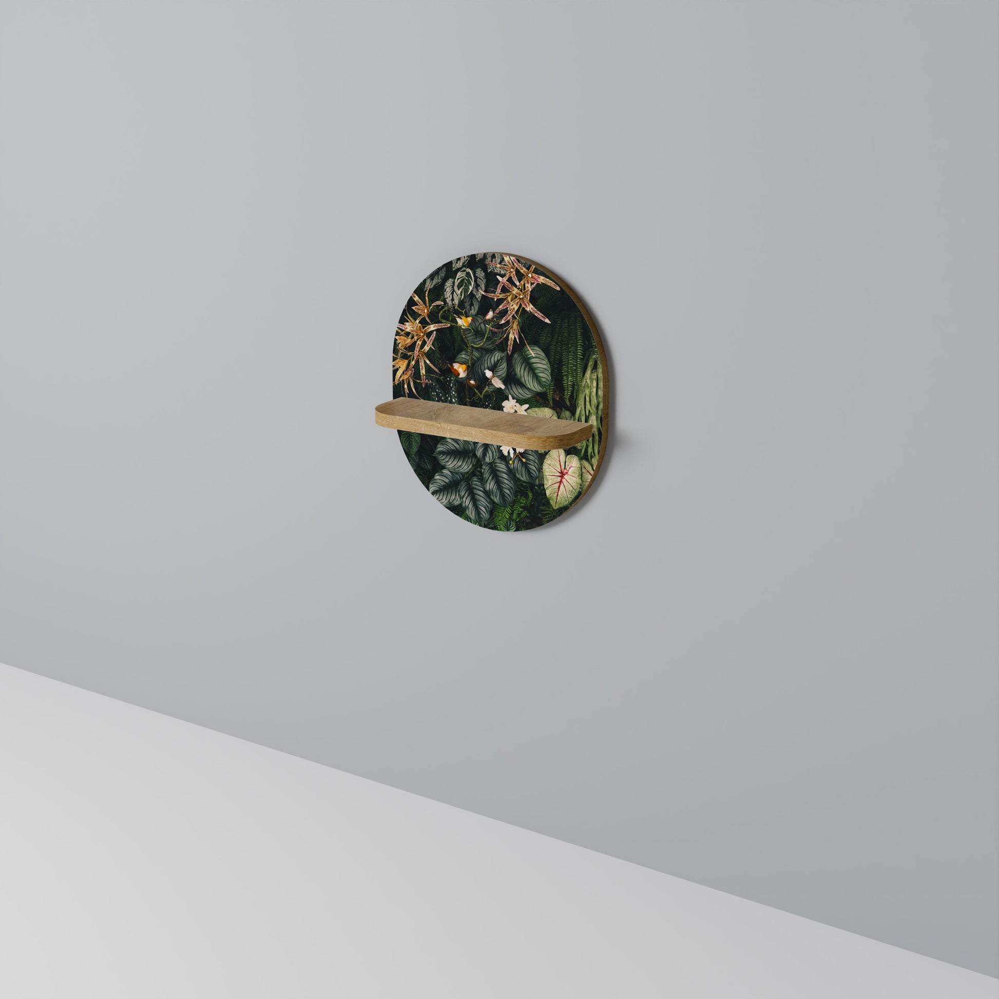 La mensola si distingue per la sua forma ovale unica che si allinea perfettamente alle tendenze moderne dell'interior design, pur mantenendo un fascino universale che si adatta a qualsiasi stanza. L'arredamento in rovere naturale le conferisce un aspetto caldo e organico, fondendosi perfettamente con composizioni sia classiche che moderne.
