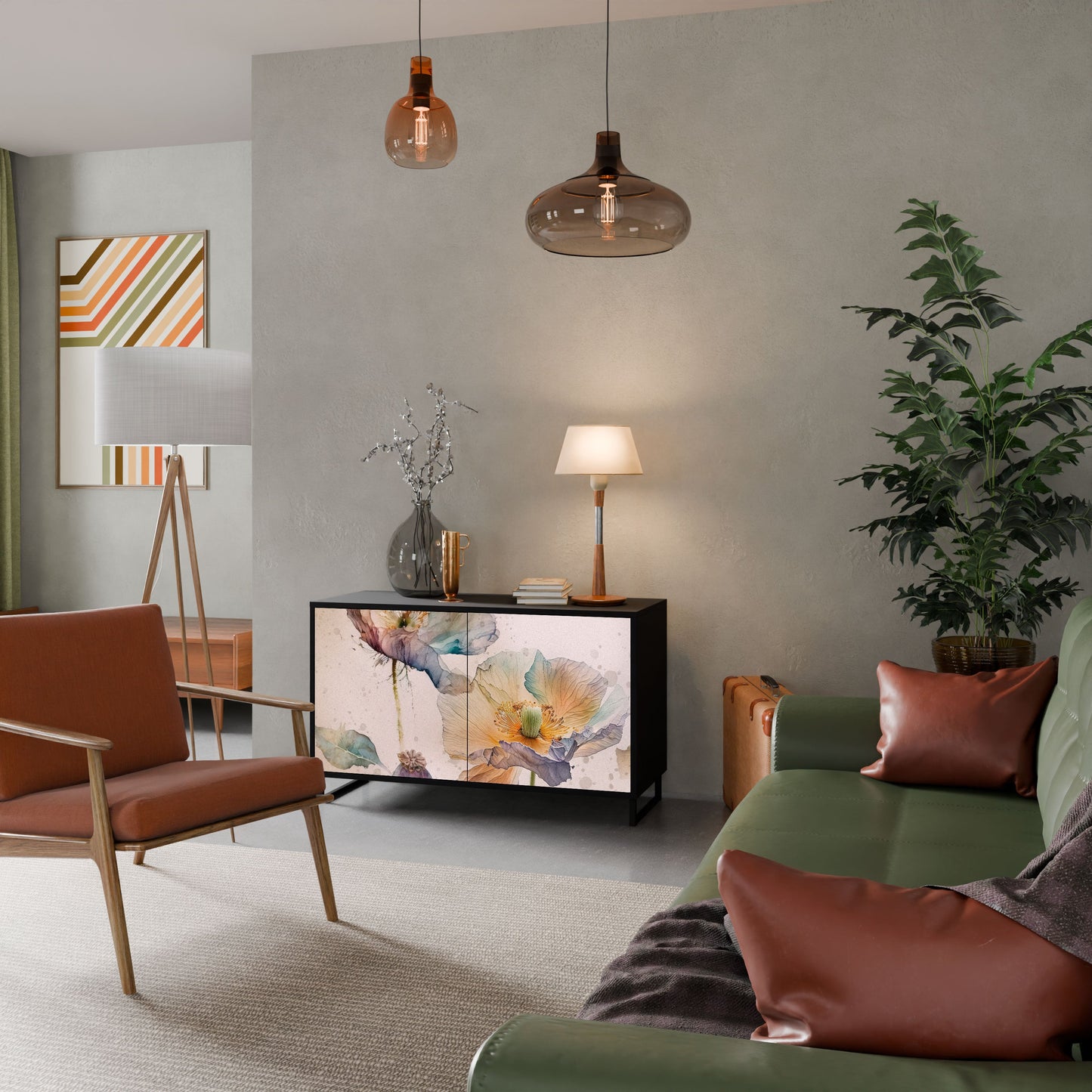 Eleganza e funzionalità in un unico mobile: la nostra credenza a 2 ante con corpo nero è la soluzione perfetta per gli amanti degli interni eleganti e moderni. Il corpo nero enfatizza il carattere audace del mobile, mentre i frontali con una stampa unica aggiungono un tocco artistico. Si adatta perfettamente al soggiorno, alla camera da letto o all'ufficio, completando sia gli arrangiamenti moderni che quelli industriali.