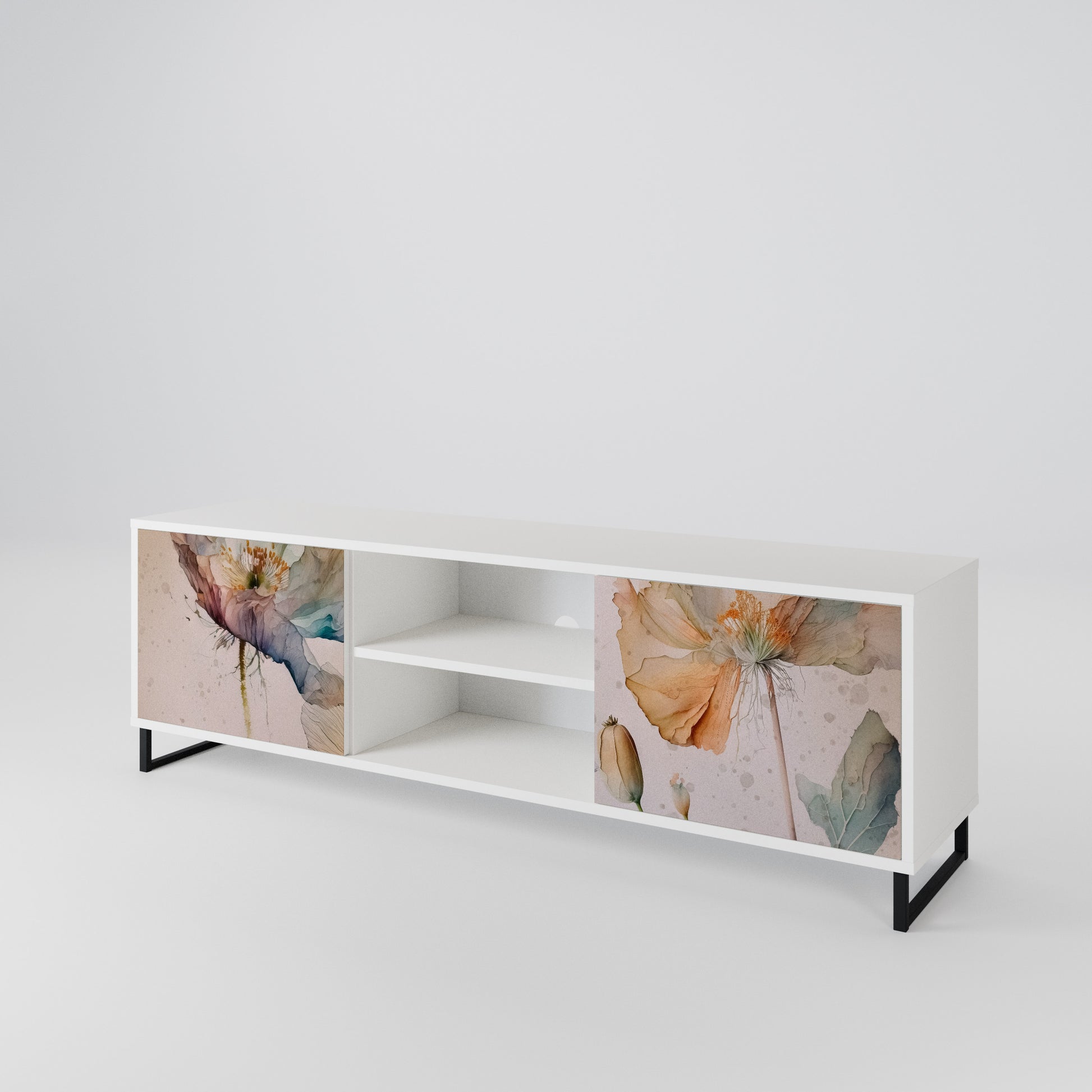 Il corpo bianco conferisce al mobile TV un aspetto luminoso e raffinato, mentre i frontali con una stampa eccezionale catturano l'attenzione, diventando il punto focale di qualsiasi stanza. Lo spazioso interno offre spazio per dispositivi elettronici, cavi, telecomandi e altri accessori, aiutandoti a mantenere ordine e organizzazione.
