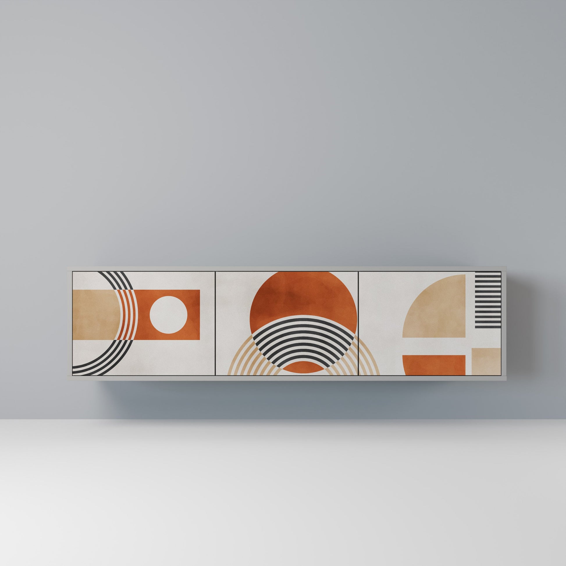 Il corpo grigio del mobile crea un accento raffinato e moderno che si abbina perfettamente ad arredi industriali e minimalisti. I frontali con stampa di design aggiungono carattere e unicità, rendendo questo pezzo non solo pratico, ma anche un elemento decorativo di spicco.
