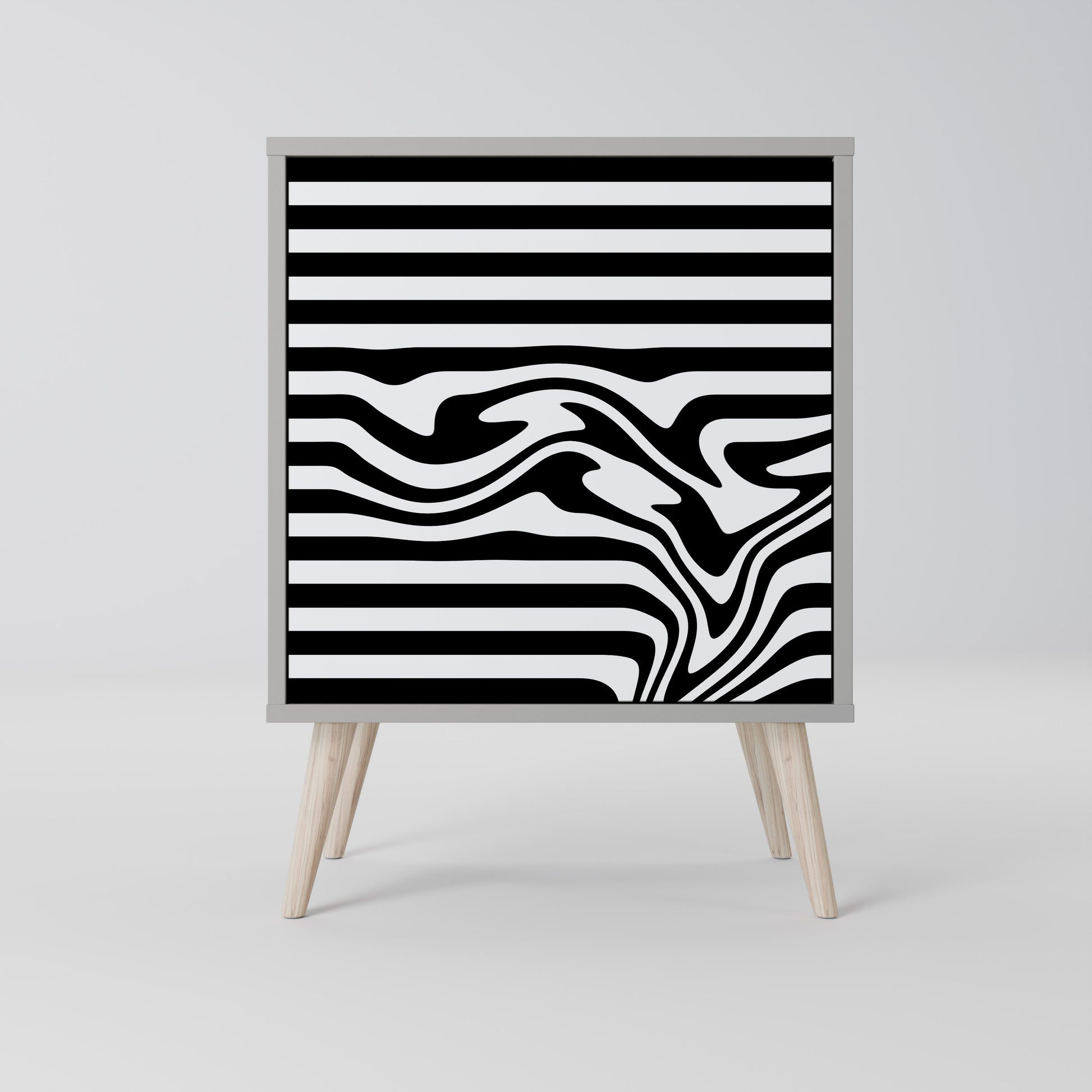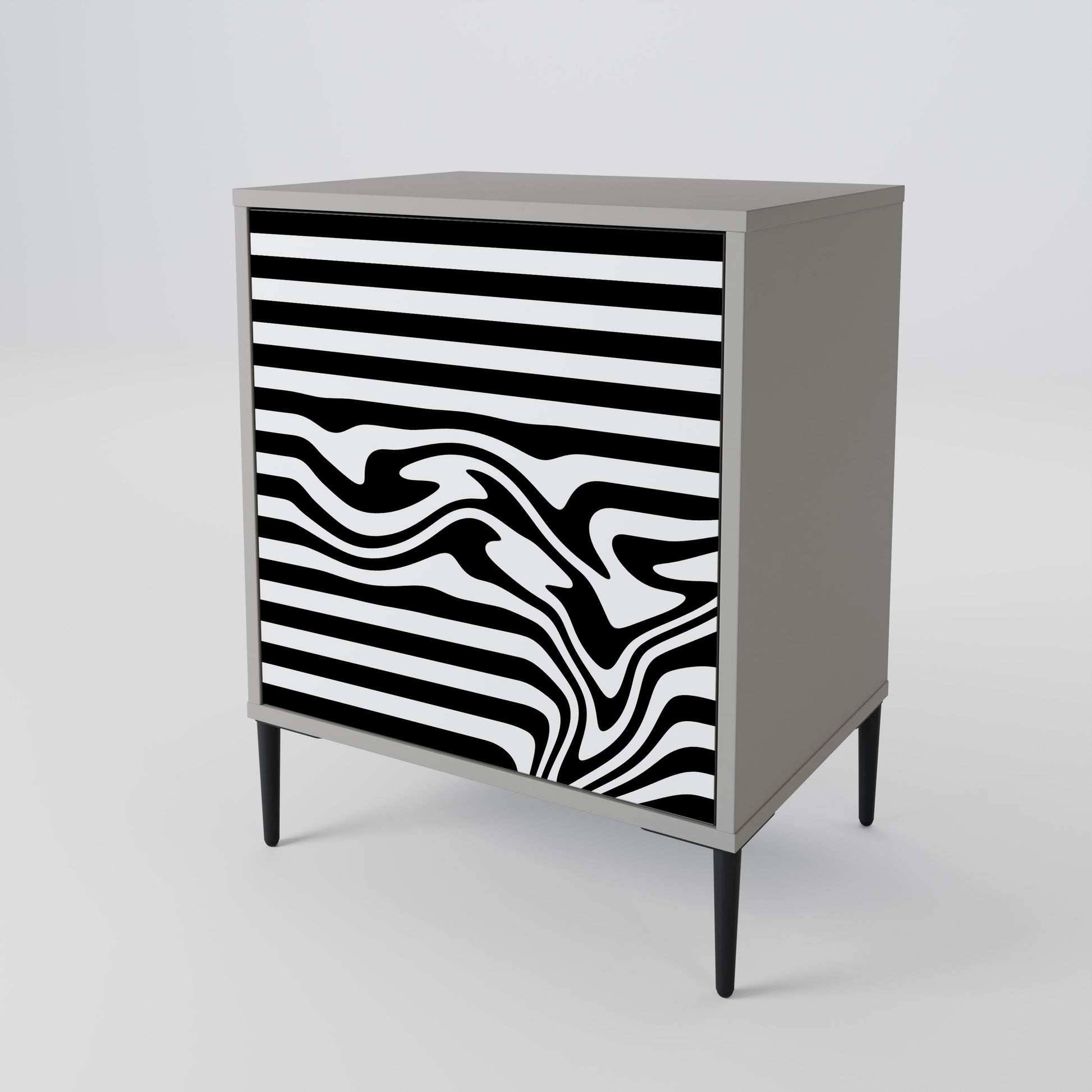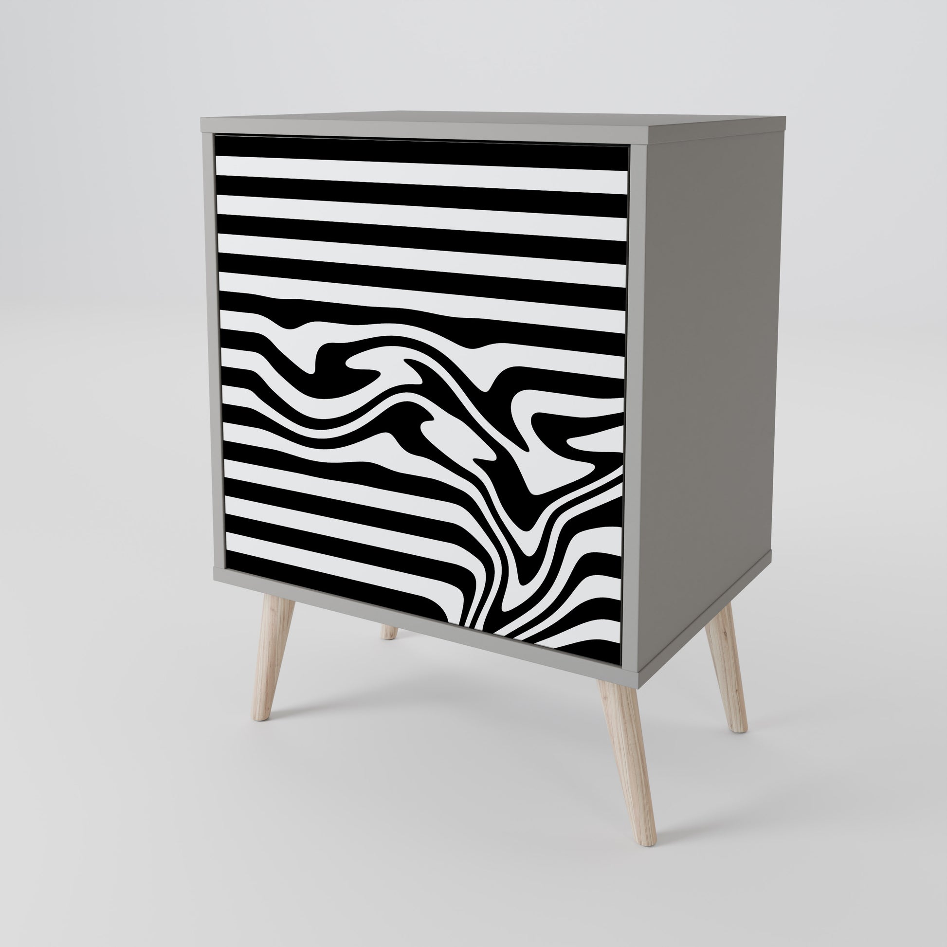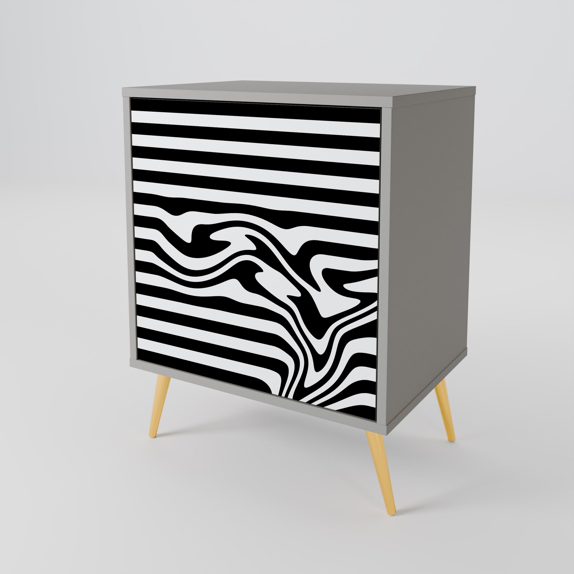 Questo mobile compatto ma straordinariamente elegante colpisce per il suo design minimalista, che si adatta perfettamente sia agli interni moderni che a quelli classici. Il tenue colore grigio della struttura conferisce al mobile un carattere discreto ma distintivo, mentre i frontali con una stampa esclusiva aggiungono un tocco artistico.