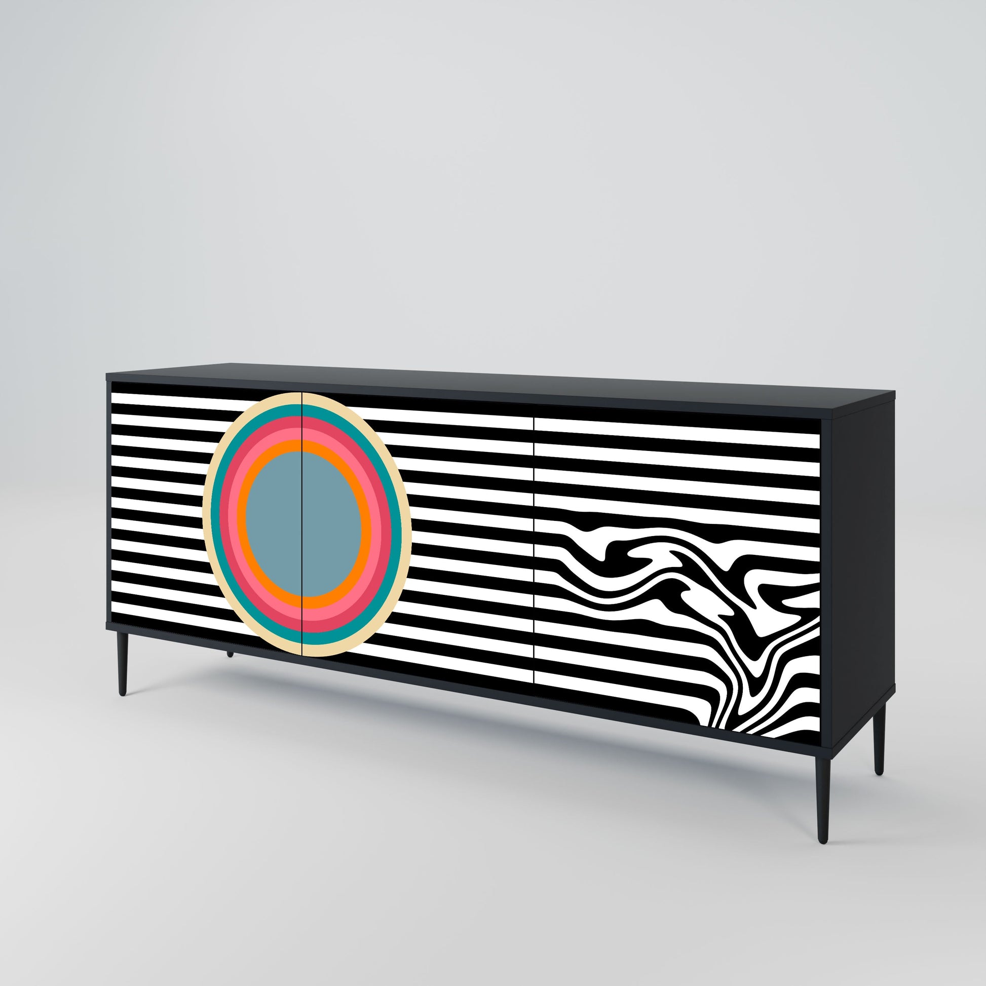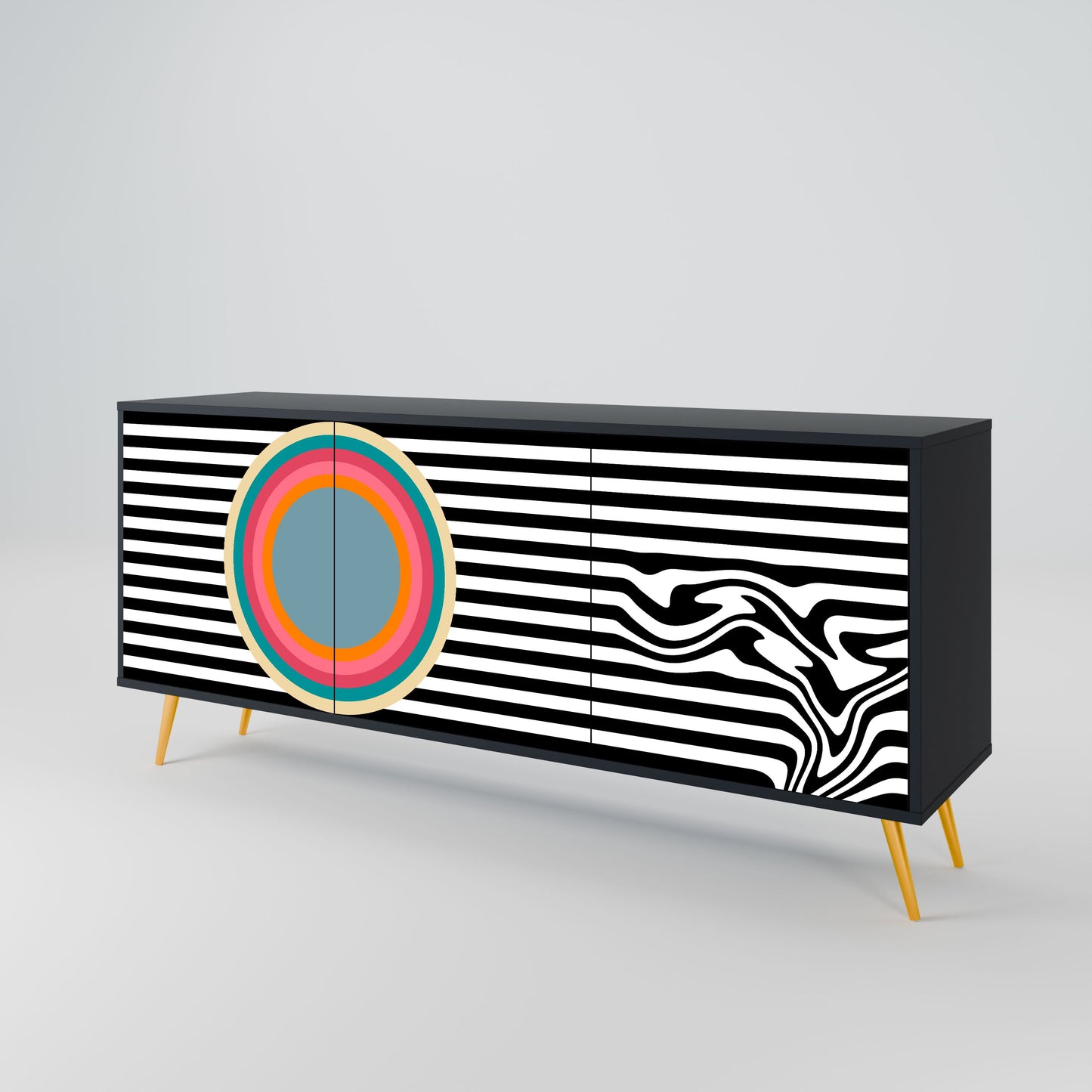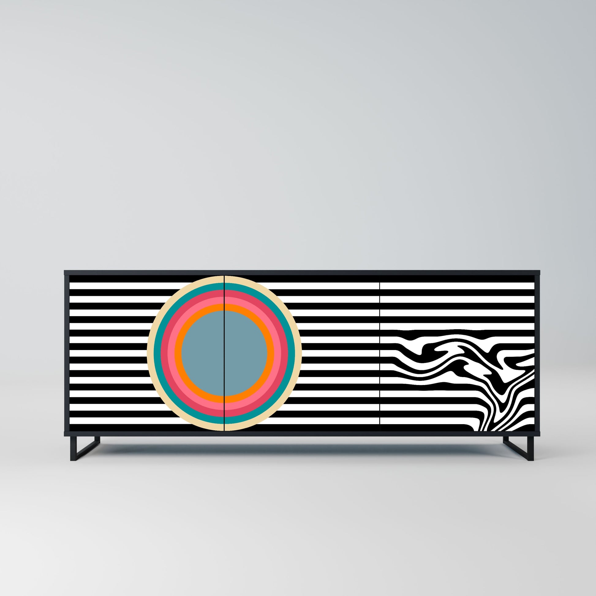 Eleganza e funzionalità in un unico mobile: la nostra credenza a 3 ante con corpo nero è la soluzione perfetta per gli amanti degli interni eleganti e moderni. Il corpo nero enfatizza il carattere audace del mobile, mentre i frontali con una stampa unica aggiungono un tocco artistico. Si adatta perfettamente al soggiorno, alla camera da letto o all'ufficio, completando sia gli arrangiamenti moderni che quelli industriali.