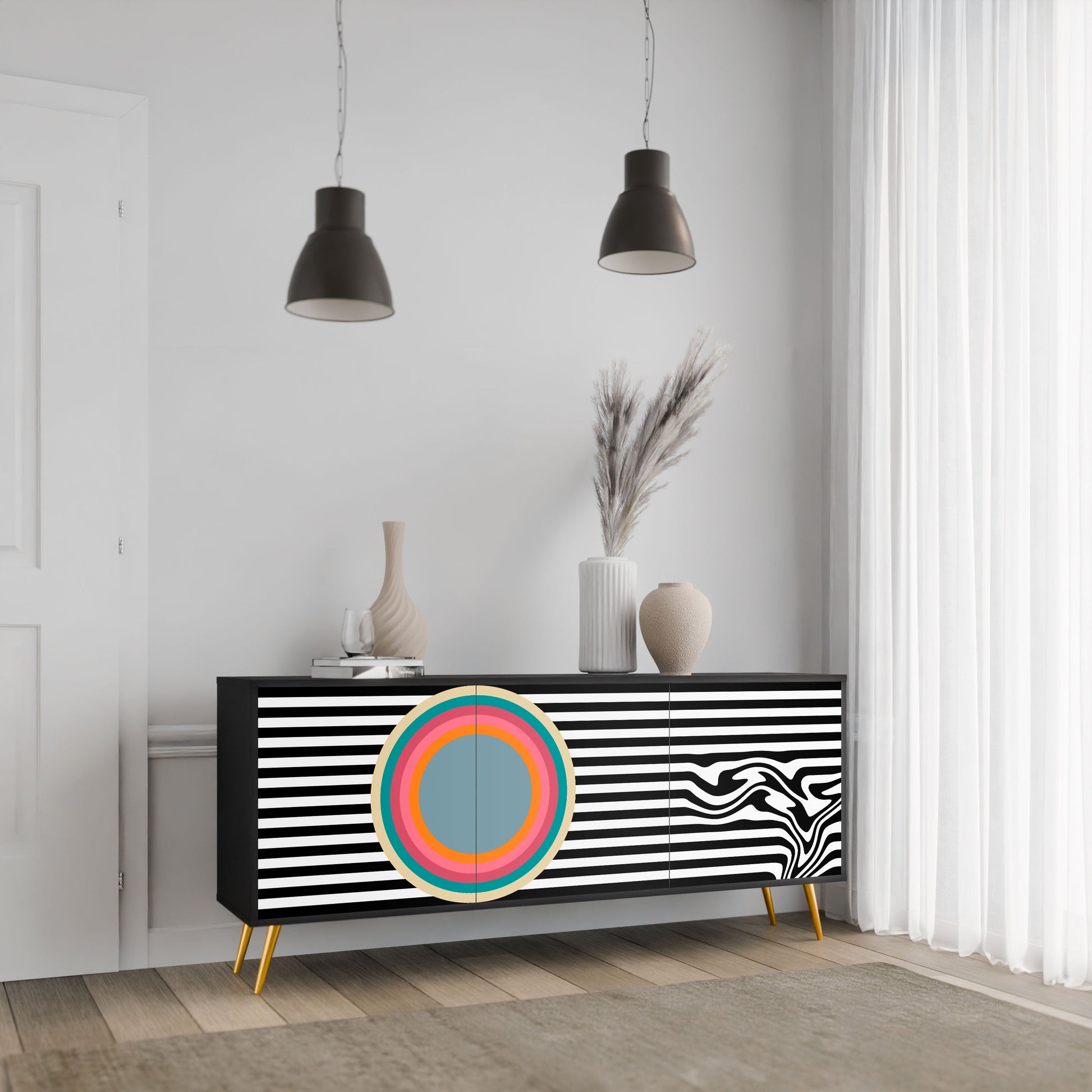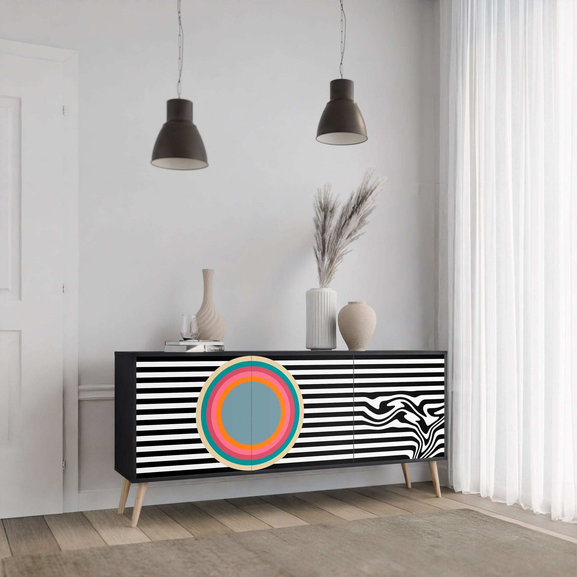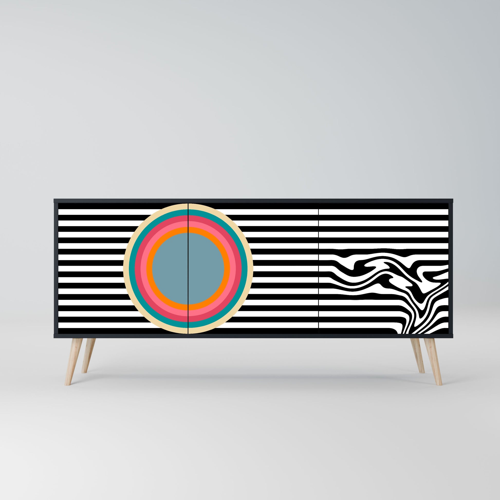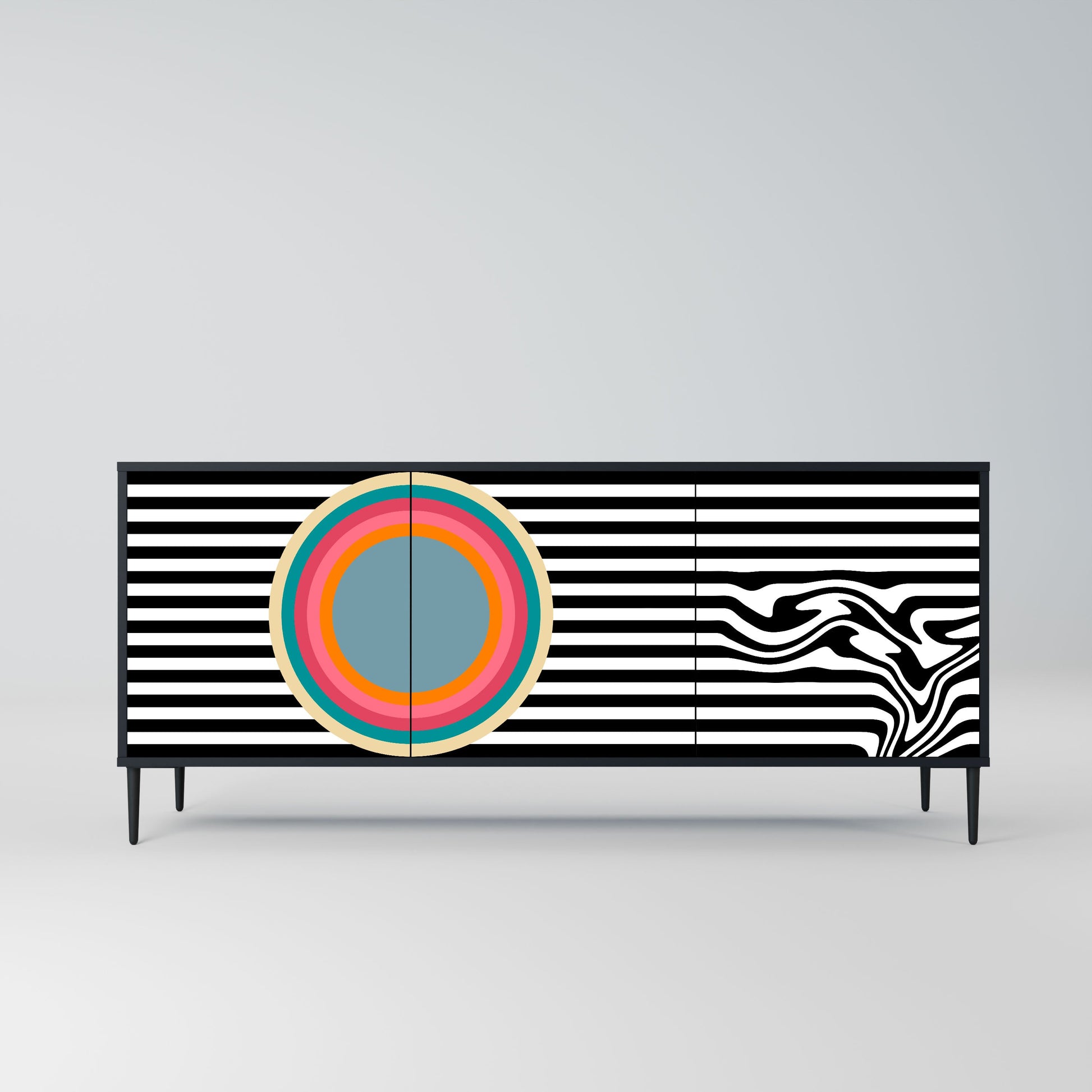 Eleganza e funzionalità in un unico mobile: la nostra credenza a 3 ante con corpo nero è la soluzione perfetta per gli amanti degli interni eleganti e moderni. Il corpo nero enfatizza il carattere audace del mobile, mentre i frontali con una stampa unica aggiungono un tocco artistico. Si adatta perfettamente al soggiorno, alla camera da letto o all'ufficio, completando sia gli arrangiamenti moderni che quelli industriali.