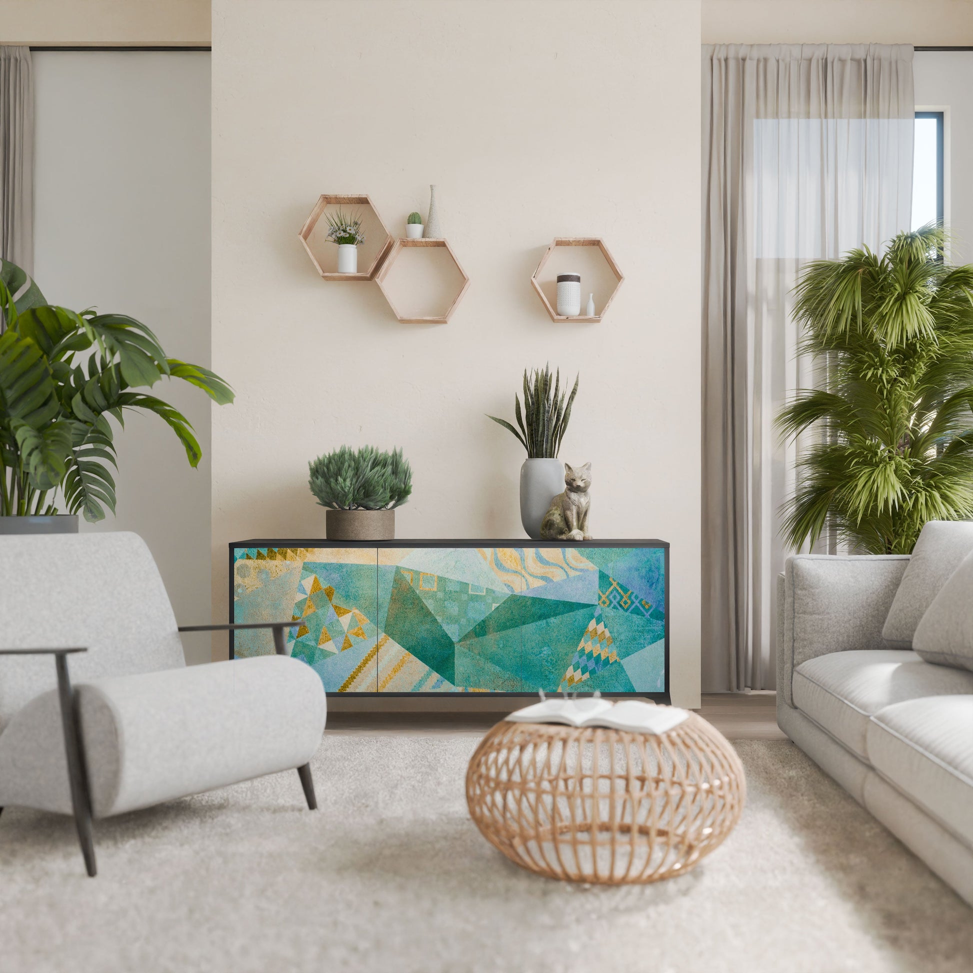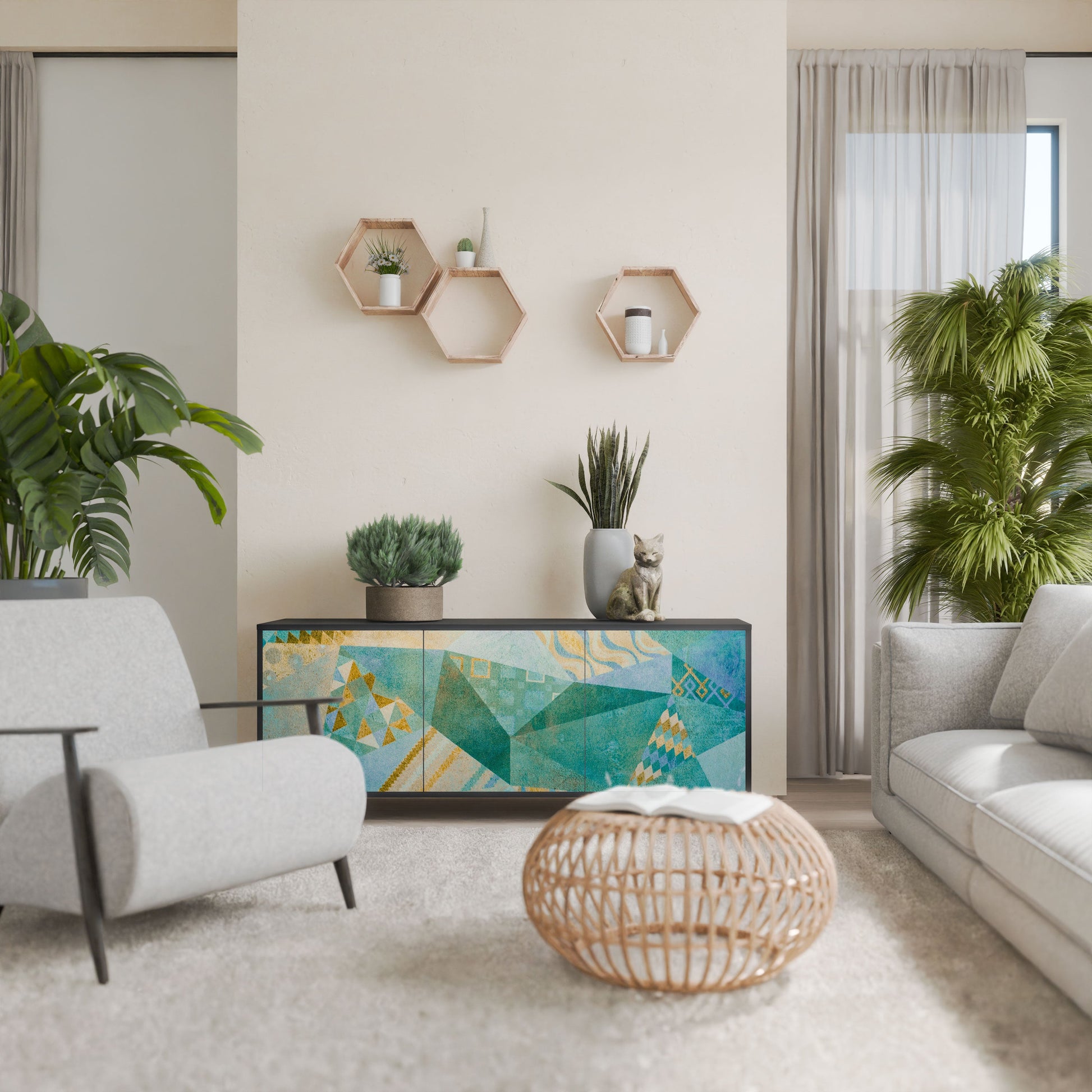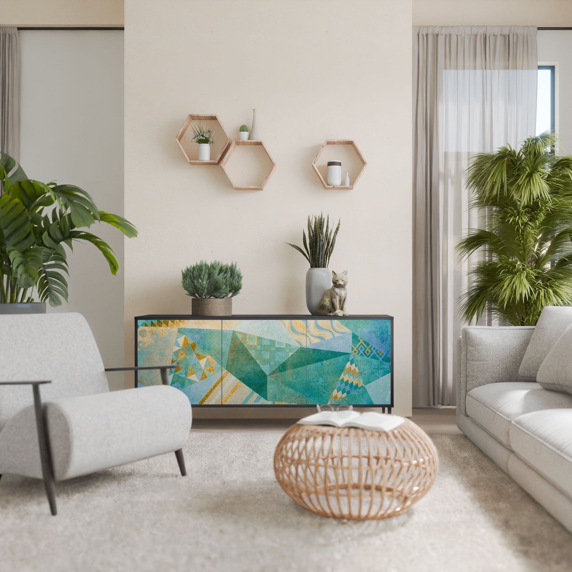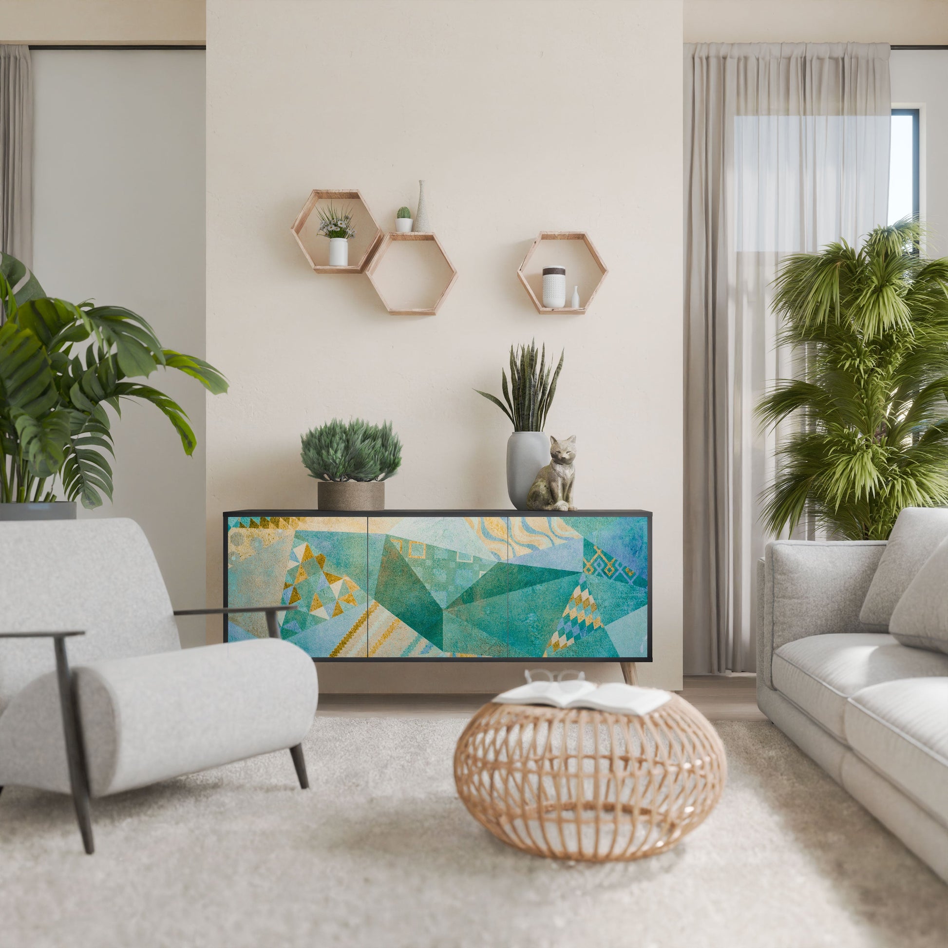 Eleganza e funzionalità in un unico mobile: la nostra credenza a 3 ante con corpo nero è la soluzione perfetta per gli amanti degli interni eleganti e moderni. Il corpo nero enfatizza il carattere audace del mobile, mentre i frontali con una stampa unica aggiungono un tocco artistico. Si adatta perfettamente al soggiorno, alla camera da letto o all'ufficio, completando sia gli arrangiamenti moderni che quelli industriali.