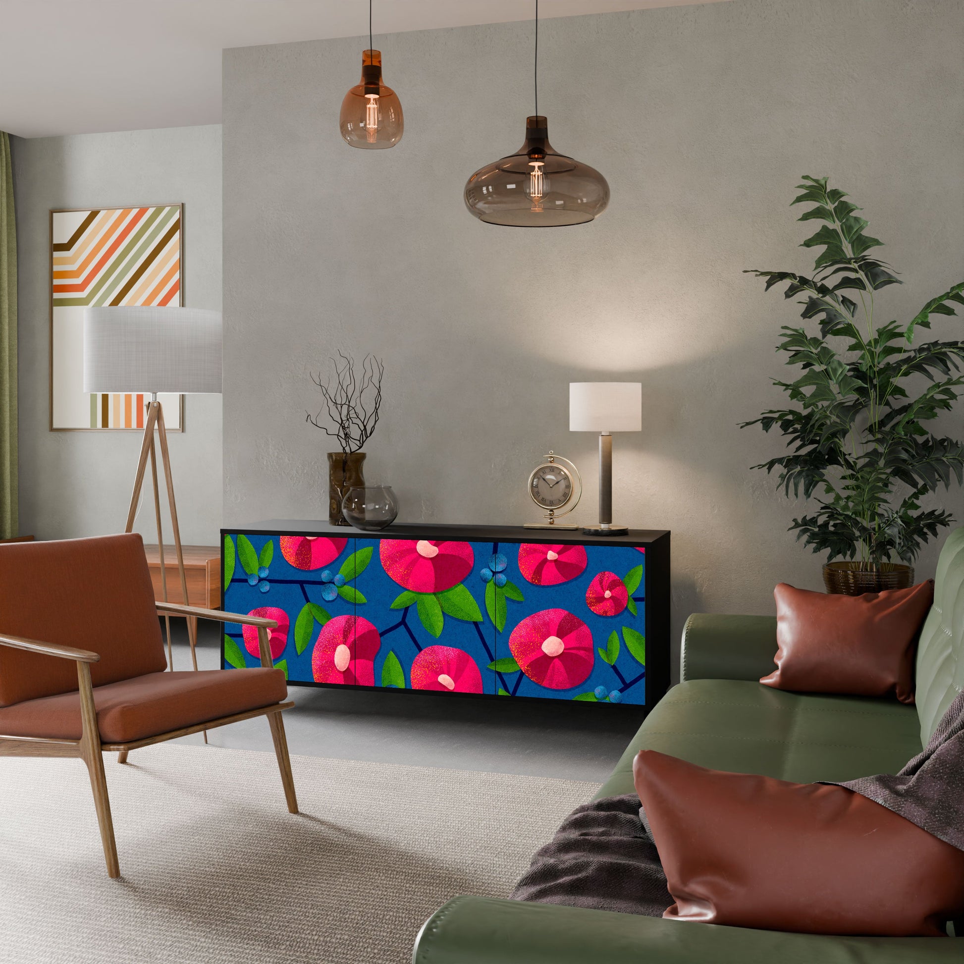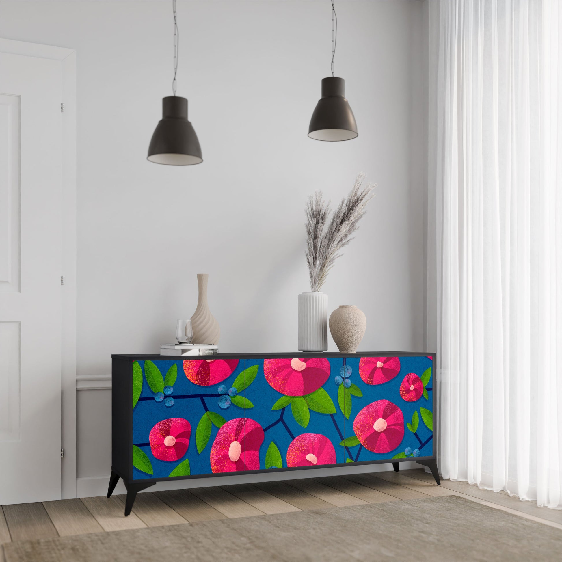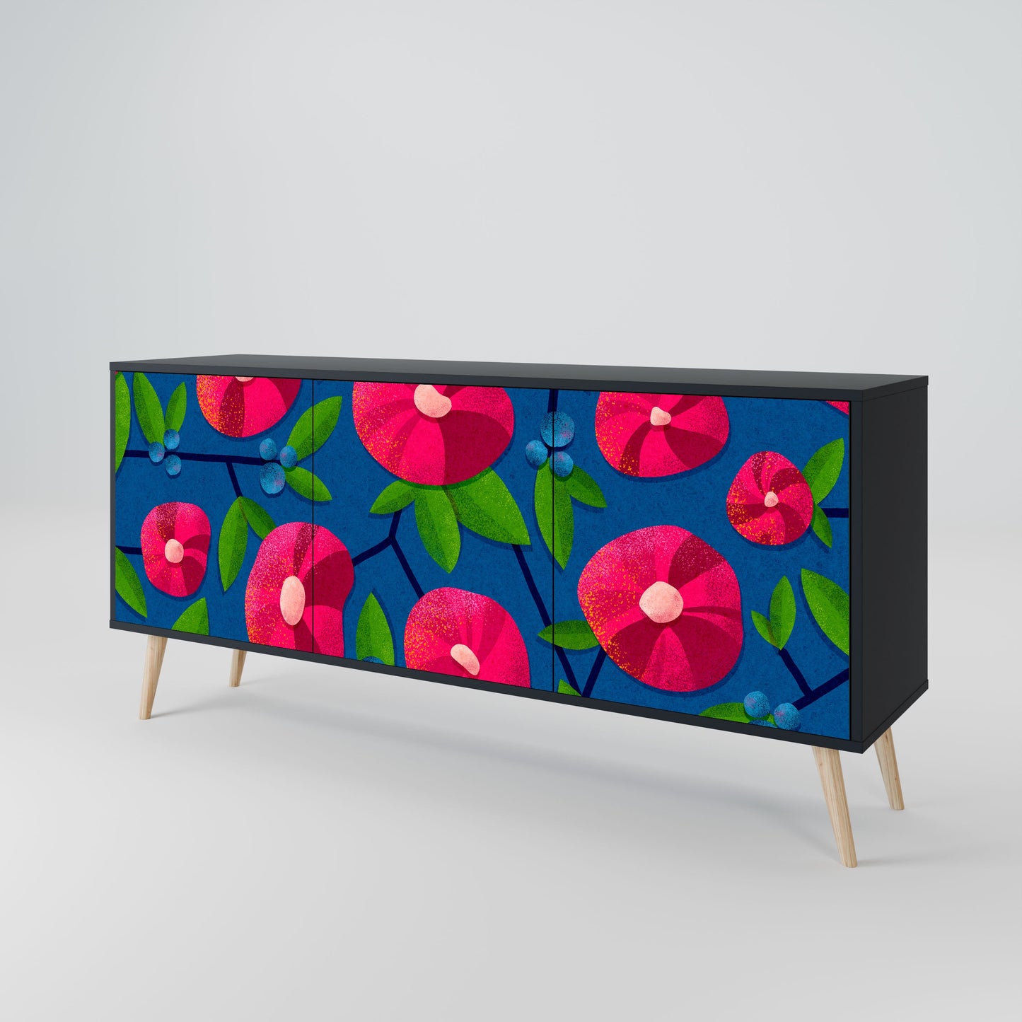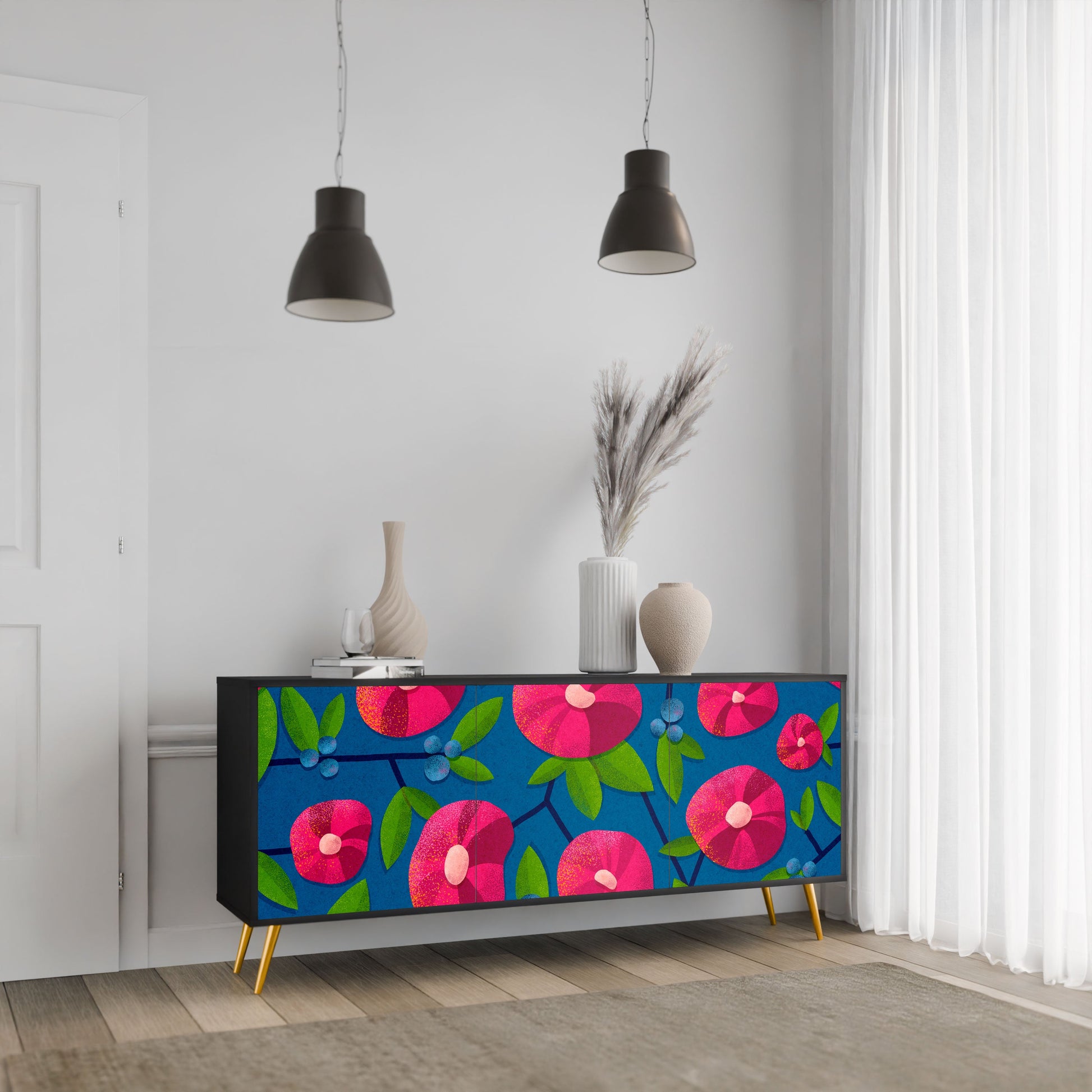 Eleganza e funzionalità in un unico mobile: la nostra credenza a 3 ante con corpo nero è la soluzione perfetta per gli amanti degli interni eleganti e moderni. Il corpo nero enfatizza il carattere audace del mobile, mentre i frontali con una stampa unica aggiungono un tocco artistico. Si adatta perfettamente al soggiorno, alla camera da letto o all'ufficio, completando sia gli arrangiamenti moderni che quelli industriali.