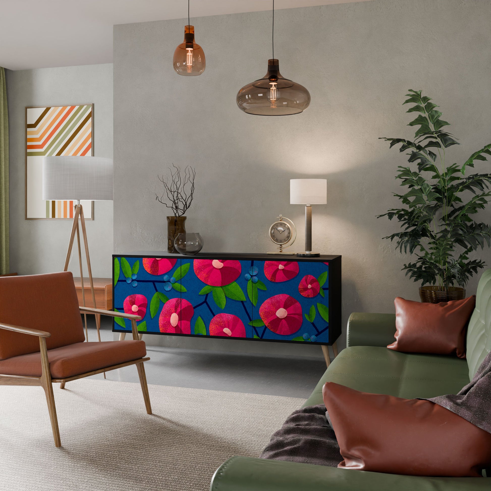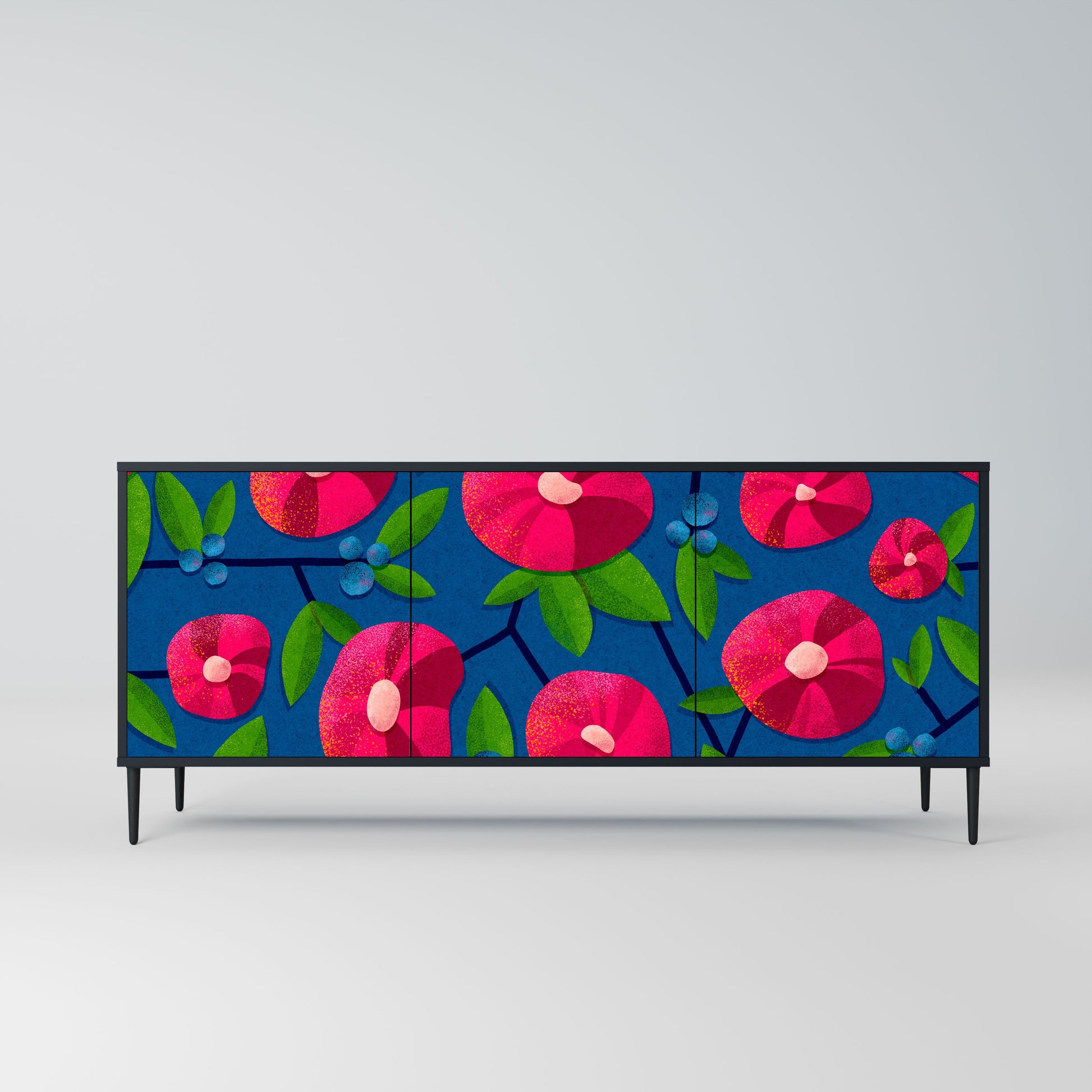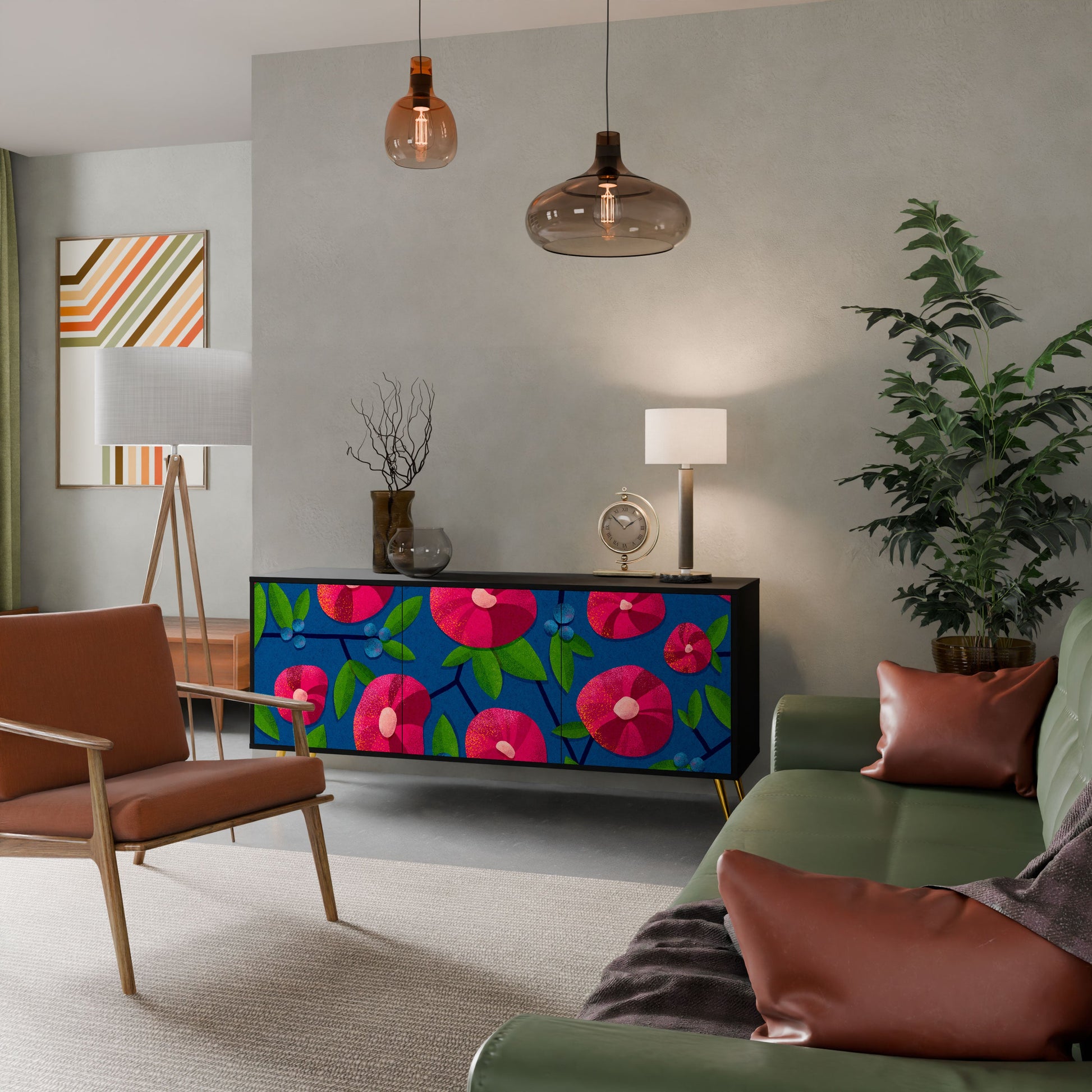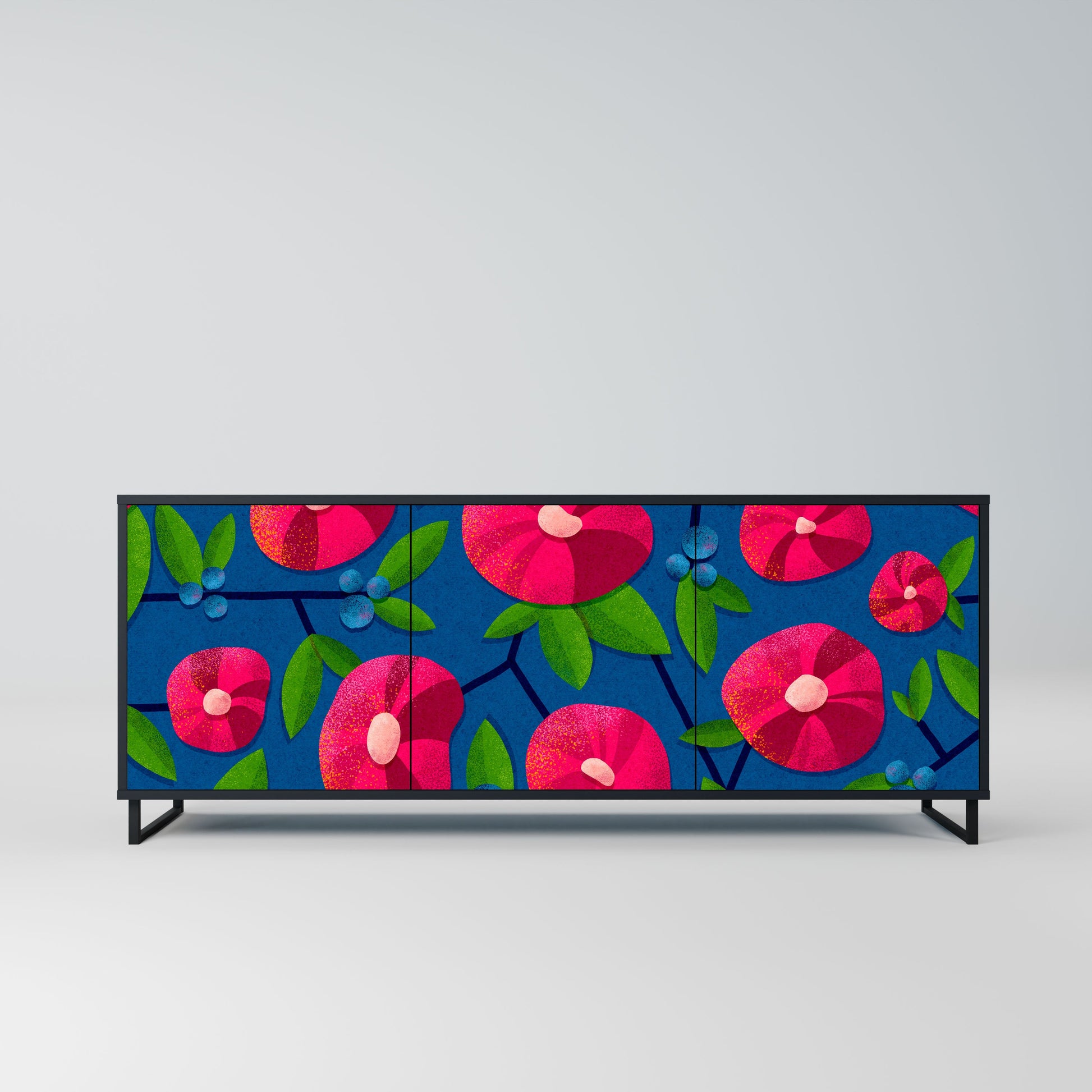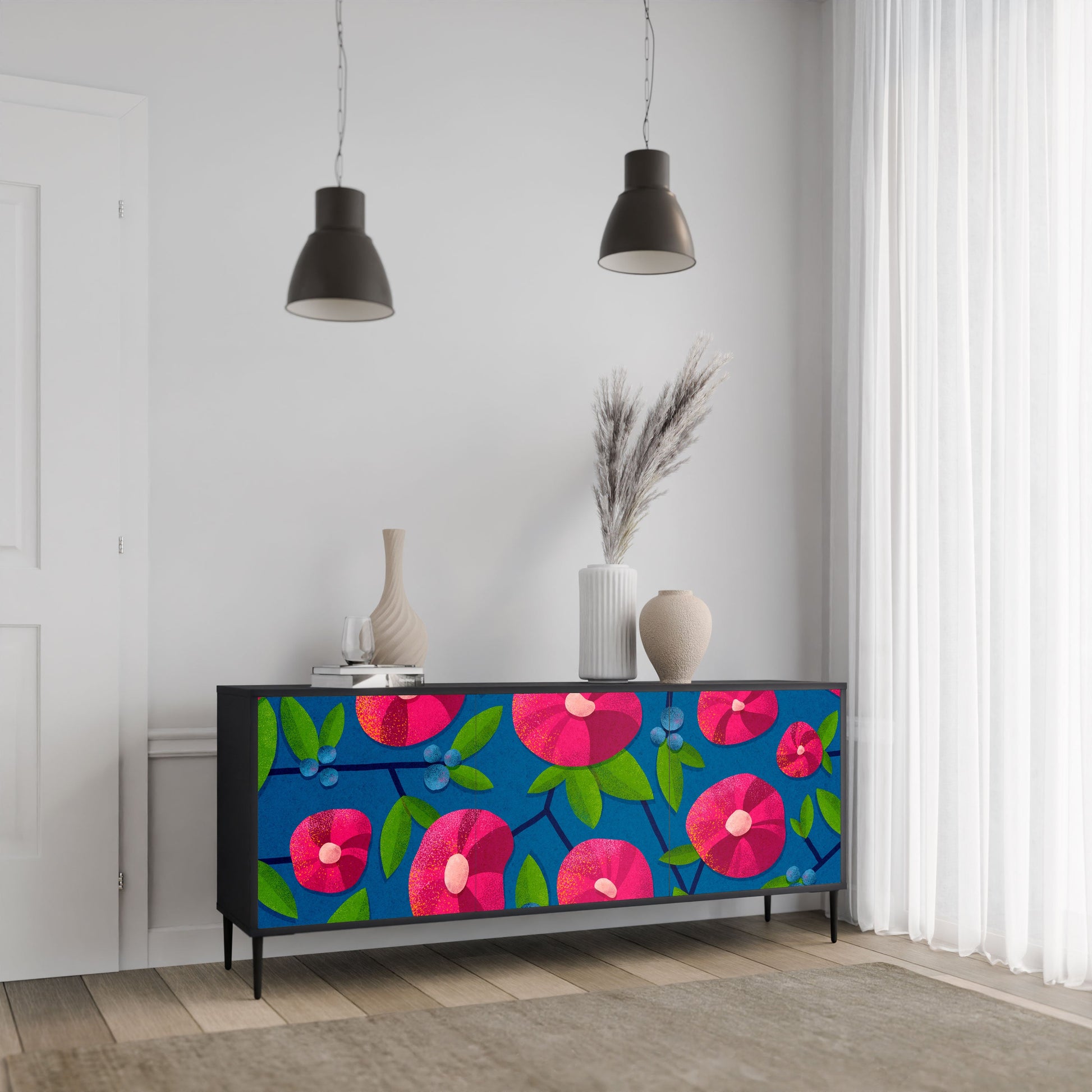 Eleganza e funzionalità in un unico mobile: la nostra credenza a 3 ante con corpo nero è la soluzione perfetta per gli amanti degli interni eleganti e moderni. Il corpo nero enfatizza il carattere audace del mobile, mentre i frontali con una stampa unica aggiungono un tocco artistico. Si adatta perfettamente al soggiorno, alla camera da letto o all'ufficio, completando sia gli arrangiamenti moderni che quelli industriali.