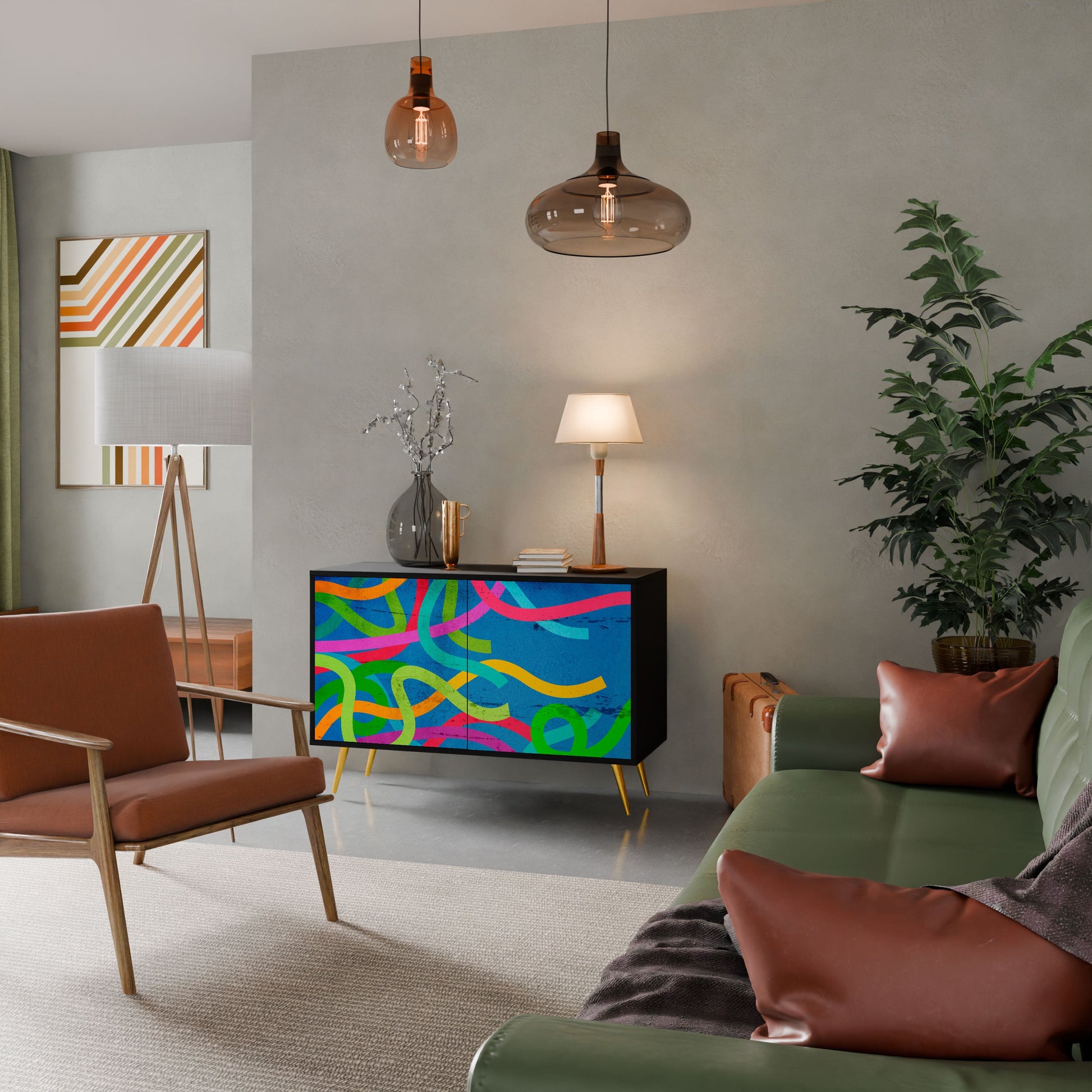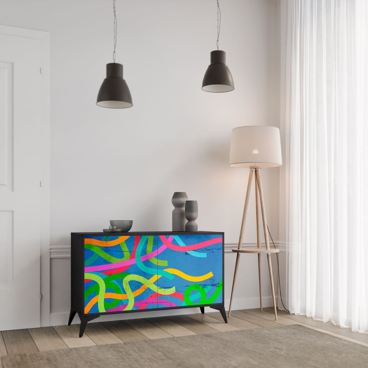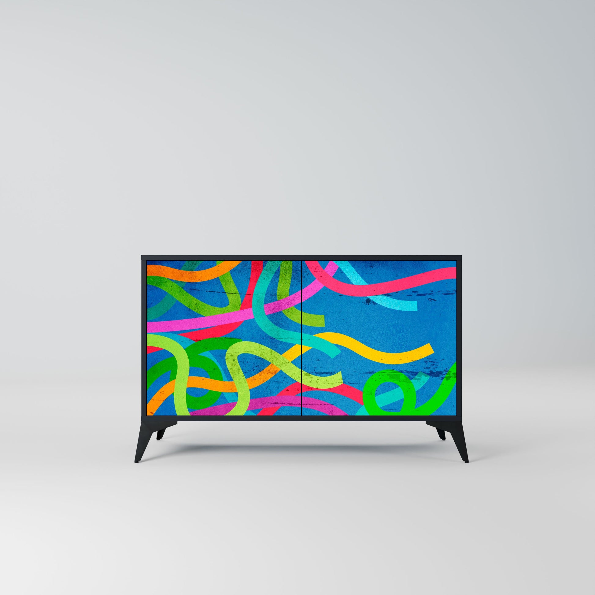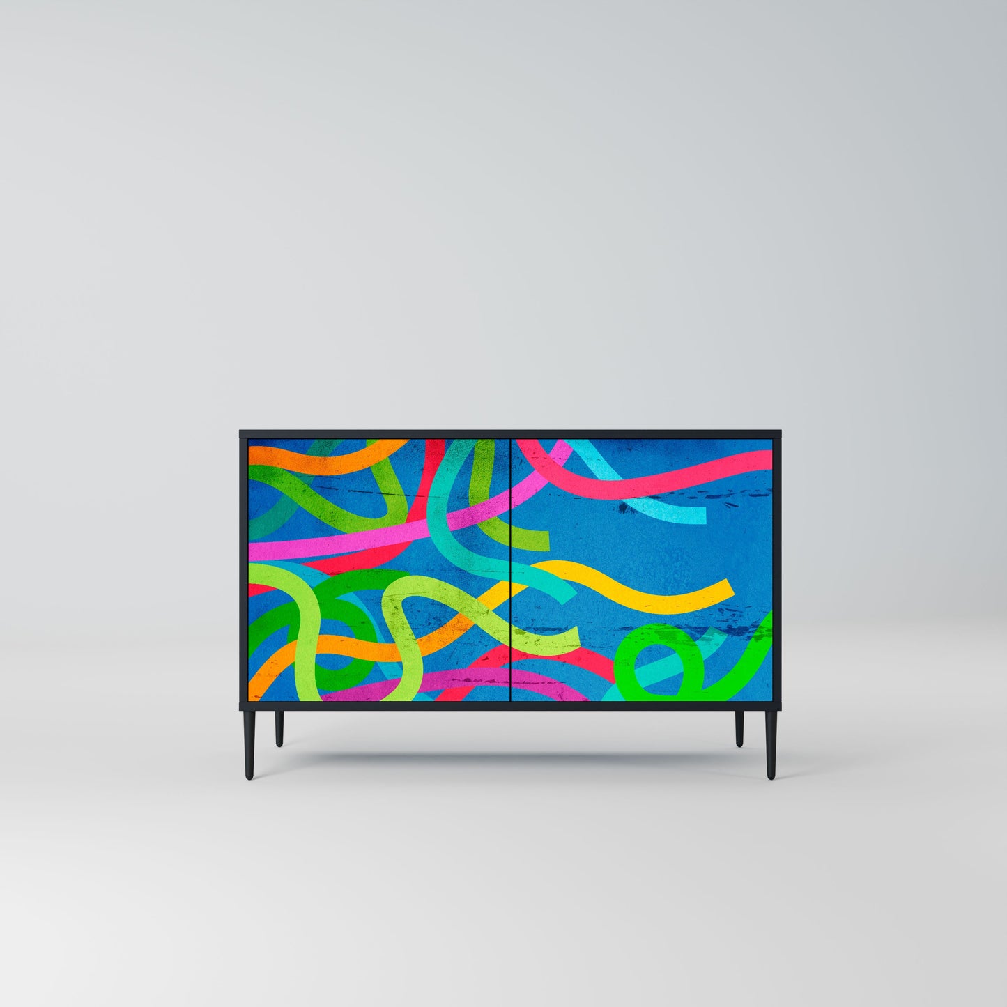 Eleganza e funzionalità in un unico mobile: la nostra credenza a 2 ante con corpo nero è la soluzione perfetta per gli amanti degli interni eleganti e moderni. Il corpo nero enfatizza il carattere audace del mobile, mentre i frontali con una stampa unica aggiungono un tocco artistico. Si adatta perfettamente al soggiorno, alla camera da letto o all'ufficio, completando sia gli arrangiamenti moderni che quelli industriali.