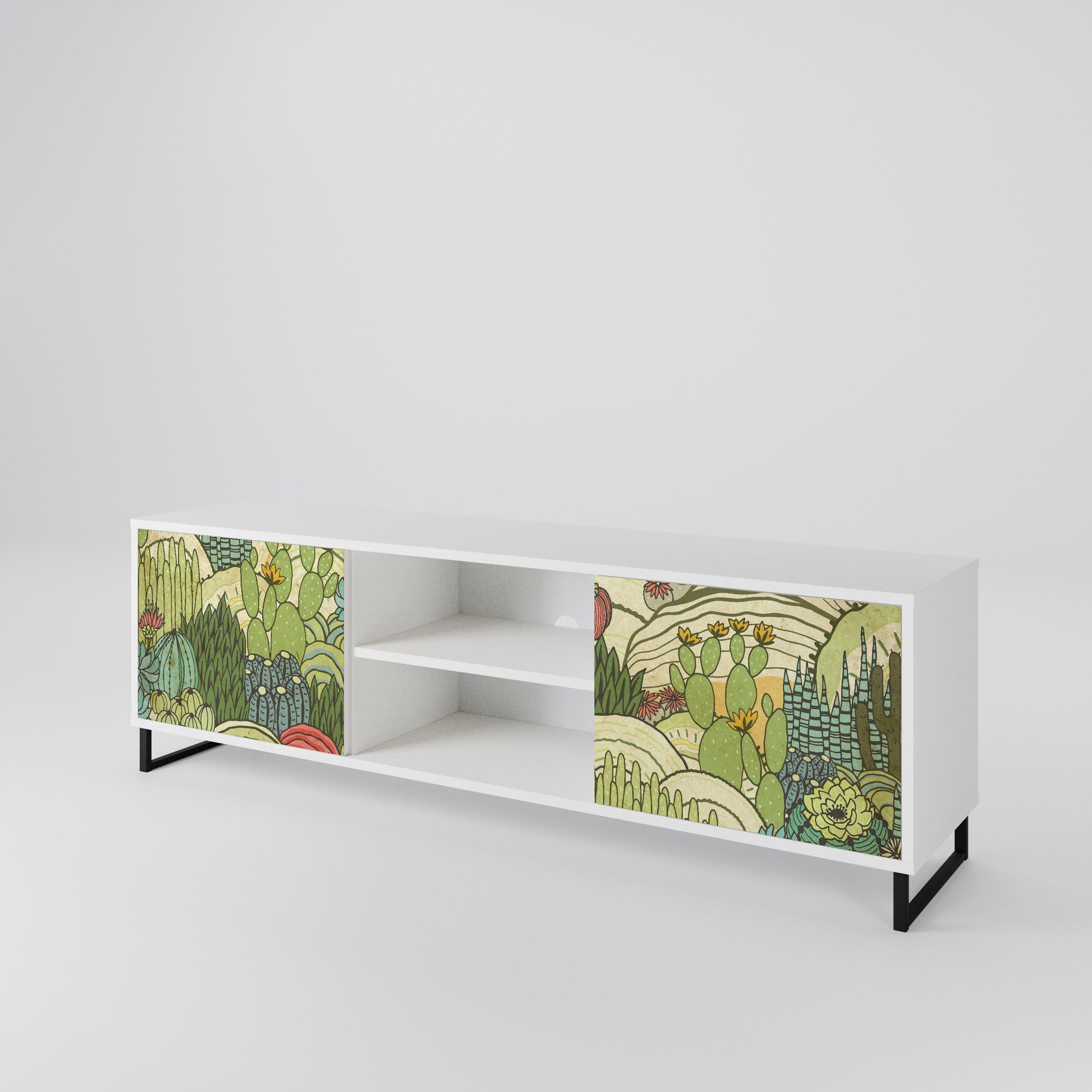 Il corpo bianco conferisce al mobile TV un aspetto luminoso e raffinato, mentre i frontali con una stampa eccezionale catturano l'attenzione, diventando il punto focale di qualsiasi stanza. Lo spazioso interno offre spazio per dispositivi elettronici, cavi, telecomandi e altri accessori, aiutandoti a mantenere ordine e organizzazione.