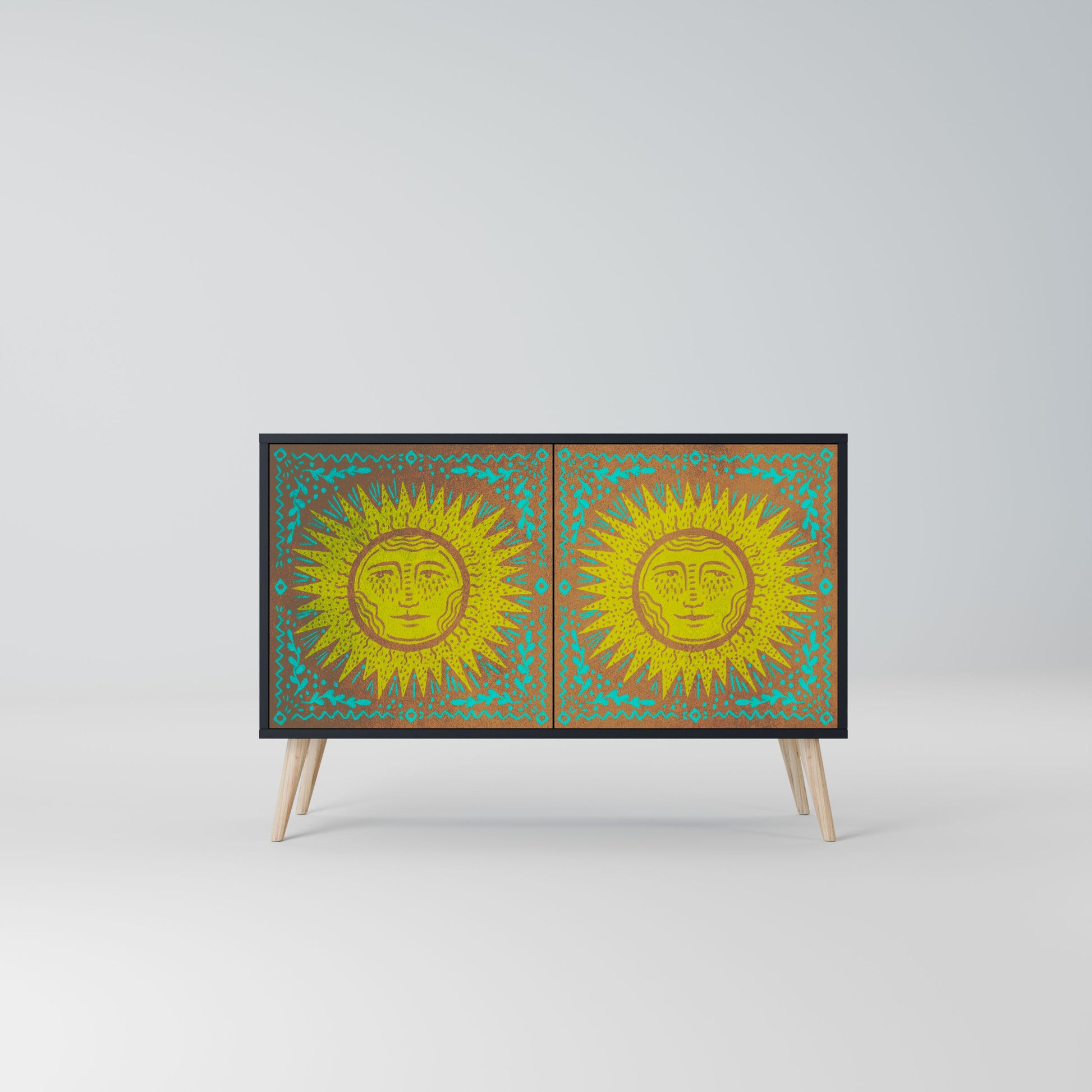 Eleganza e funzionalità in un unico mobile: la nostra credenza a 2 ante con corpo nero è la soluzione perfetta per gli amanti degli interni eleganti e moderni. Il corpo nero enfatizza il carattere audace del mobile, mentre i frontali con una stampa unica aggiungono un tocco artistico. Si adatta perfettamente al soggiorno, alla camera da letto o all'ufficio, completando sia gli arrangiamenti moderni che quelli industriali.