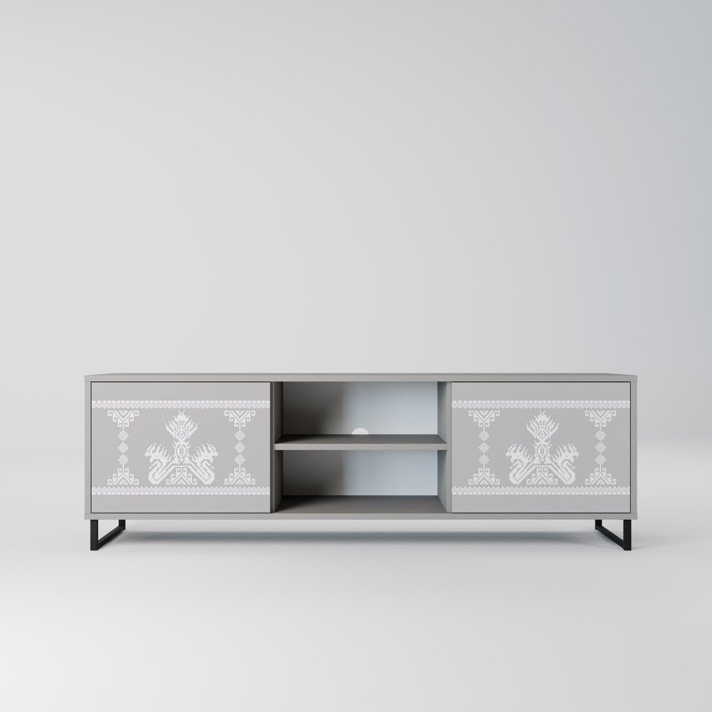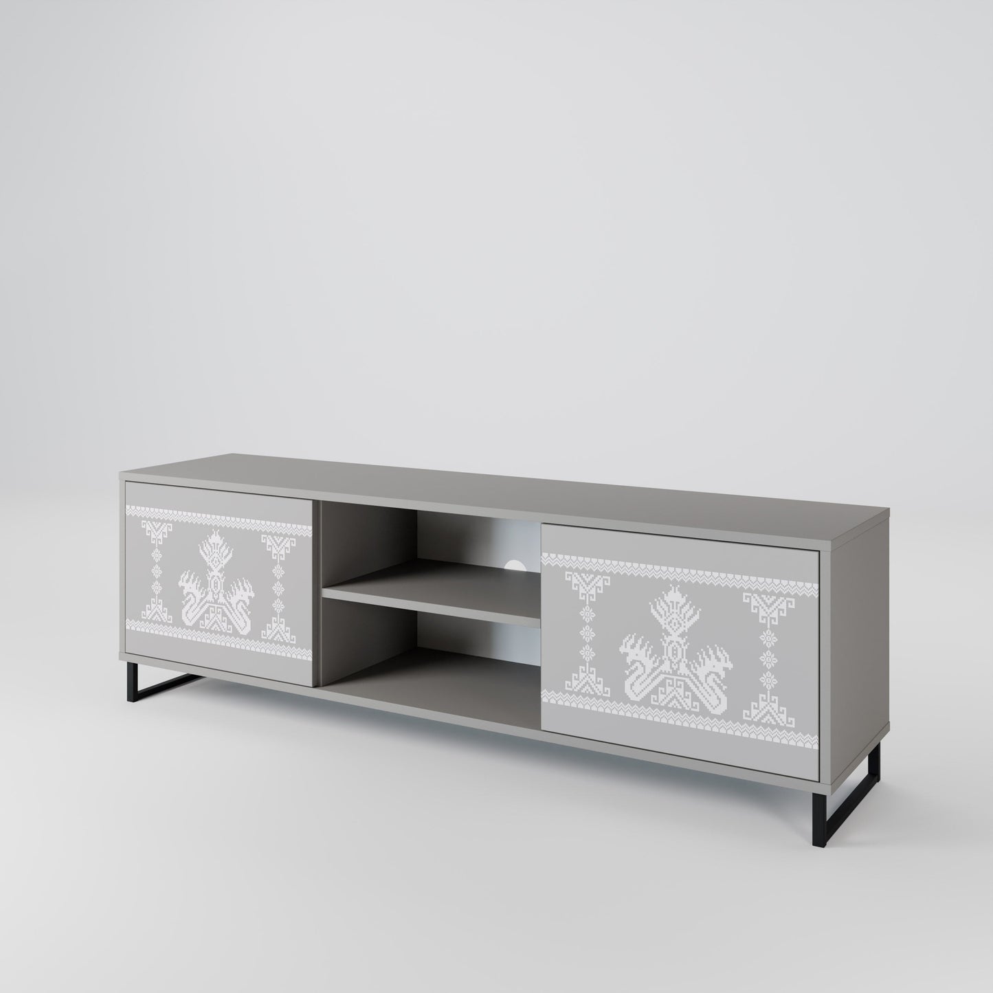 La struttura grigia conferisce al mobile TV un aspetto contemporaneo e raffinato, mentre i frontali con una stampa eccezionale catturano l'attenzione, diventando il punto focale di ogni stanza. L'ampio spazio interno offre spazio per dispositivi elettronici, cavi, telecomandi e altri accessori, aiutando a mantenere ordine e organizzazione.