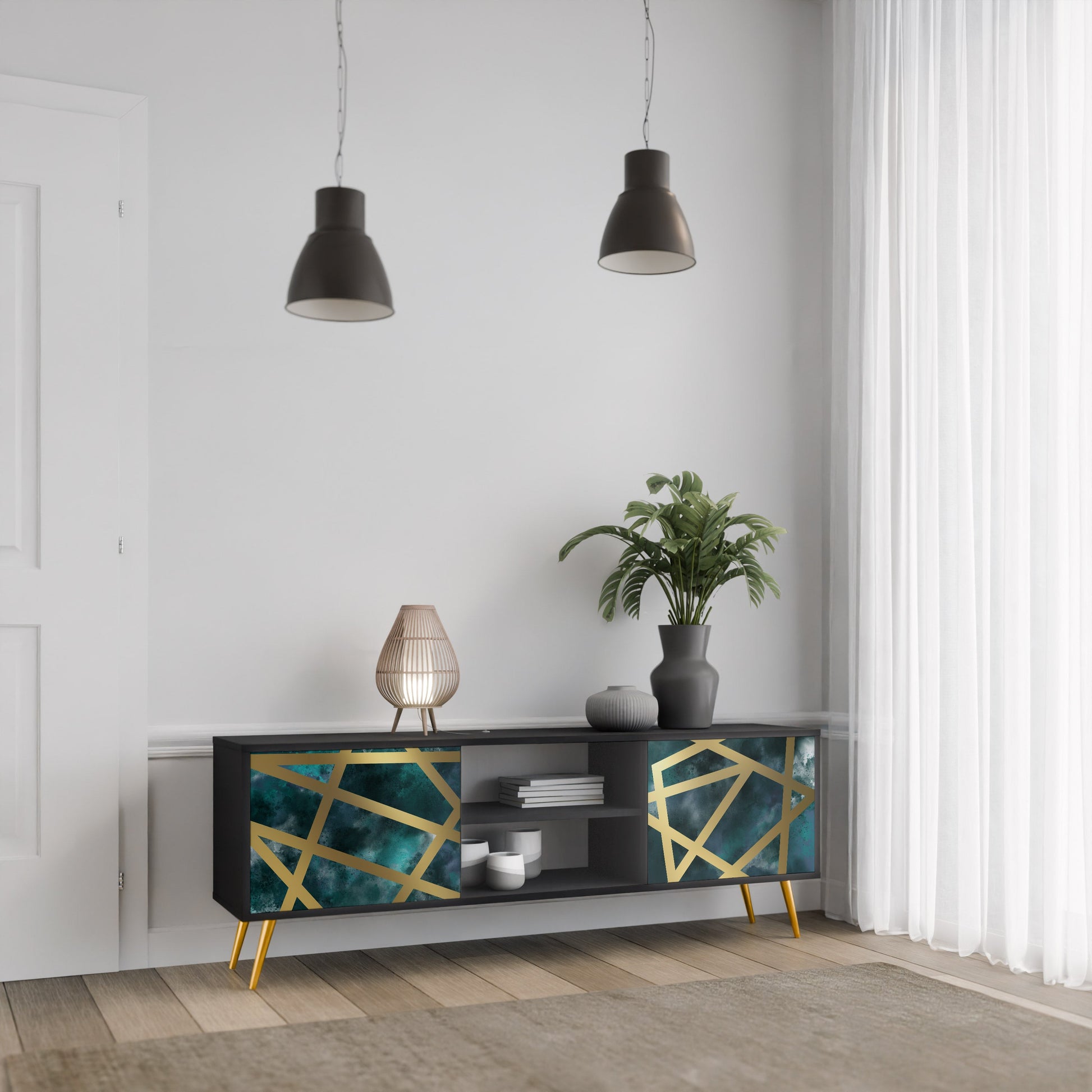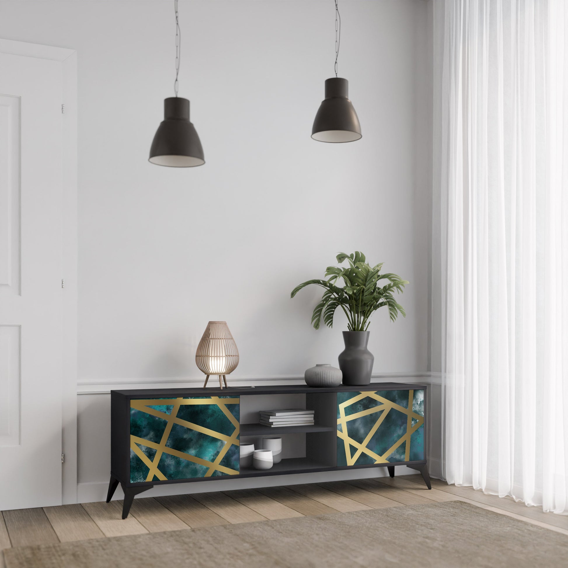 Il corpo nero conferisce al mobile TV un aspetto elegante e moderno, mentre i frontali con una stampa eccezionale attirano l'attenzione, rendendolo il punto focale di ogni stanza. L'interno spazioso offre spazio per dispositivi elettronici, cavi, telecomandi e altri accessori, aiutandoti a mantenere ordine e organizzazione.