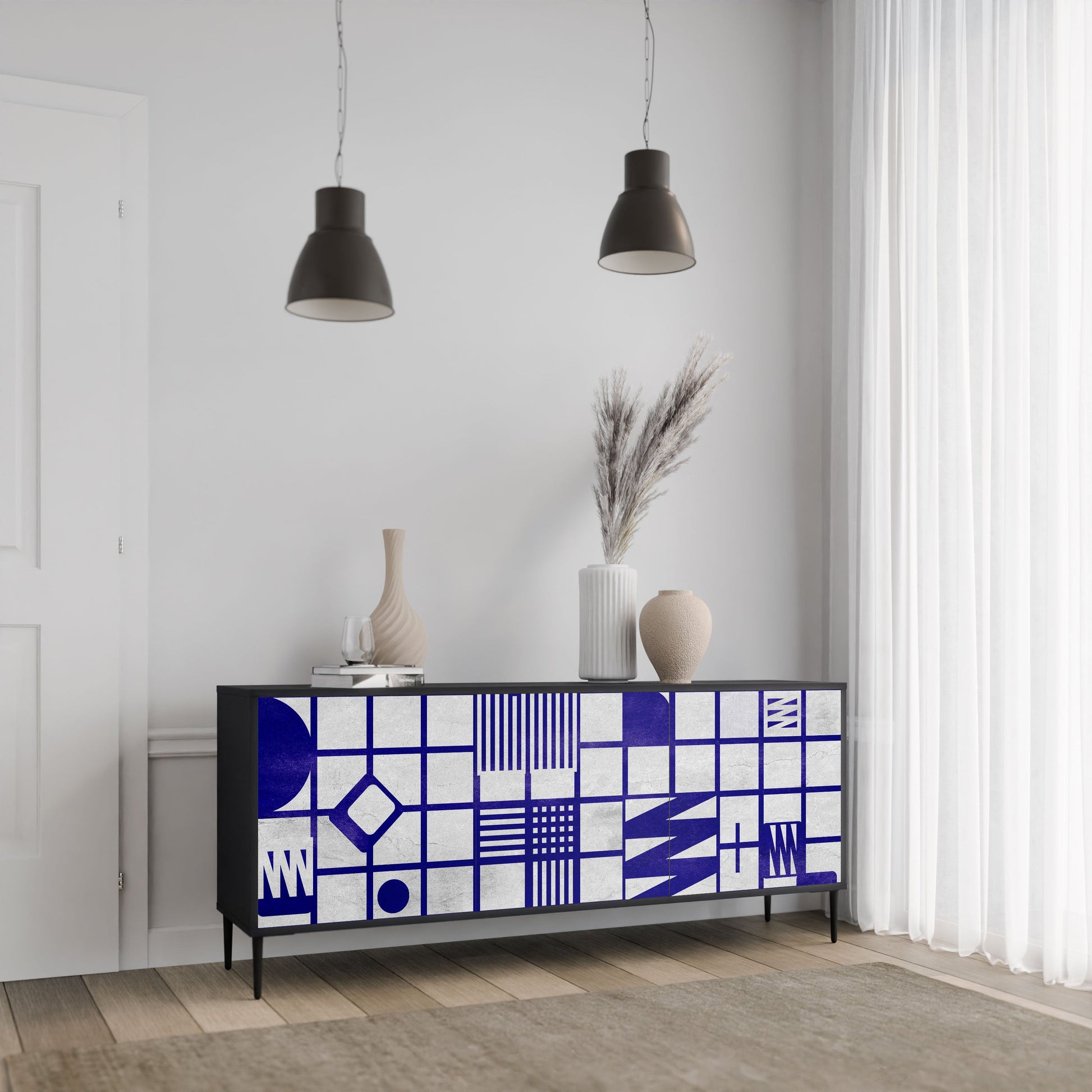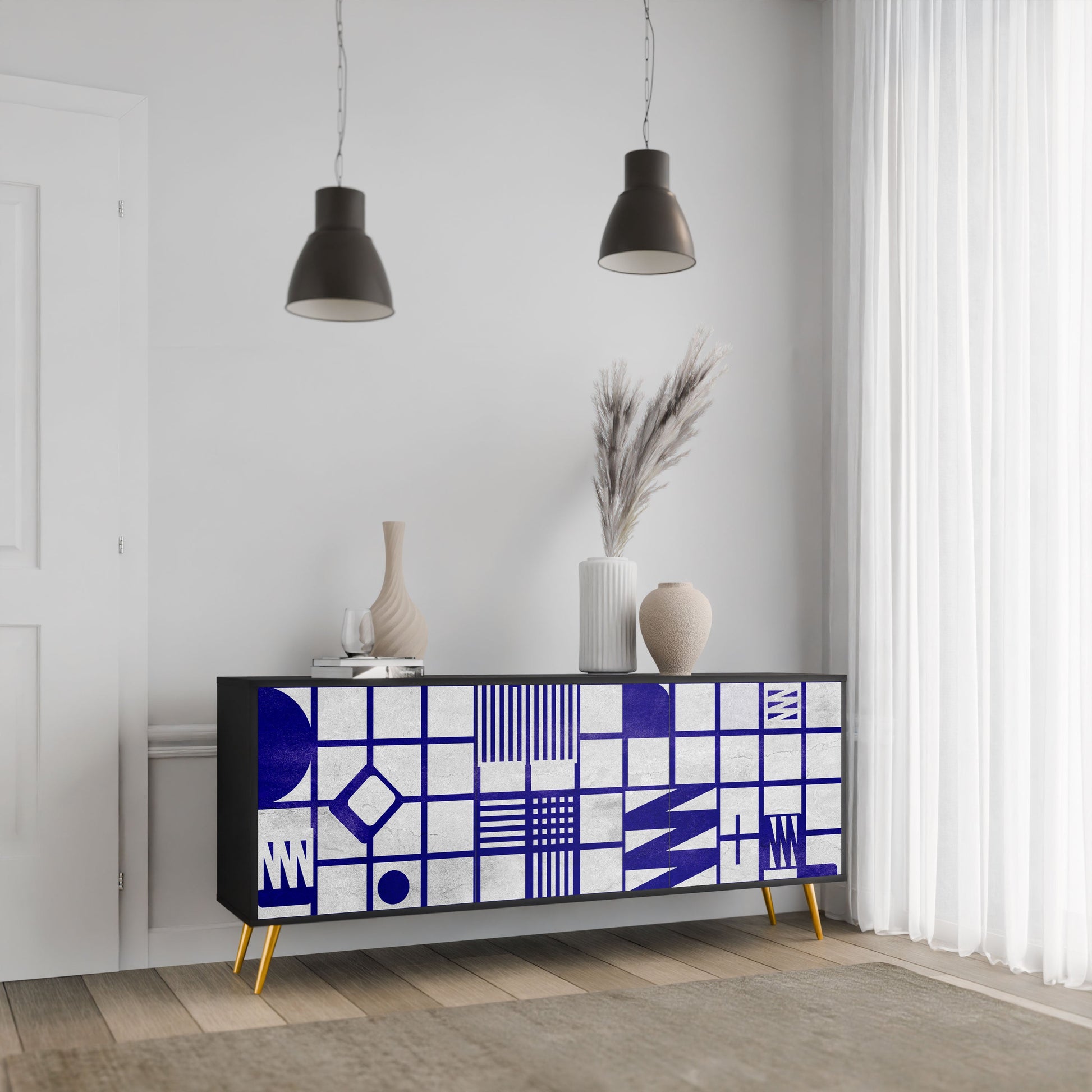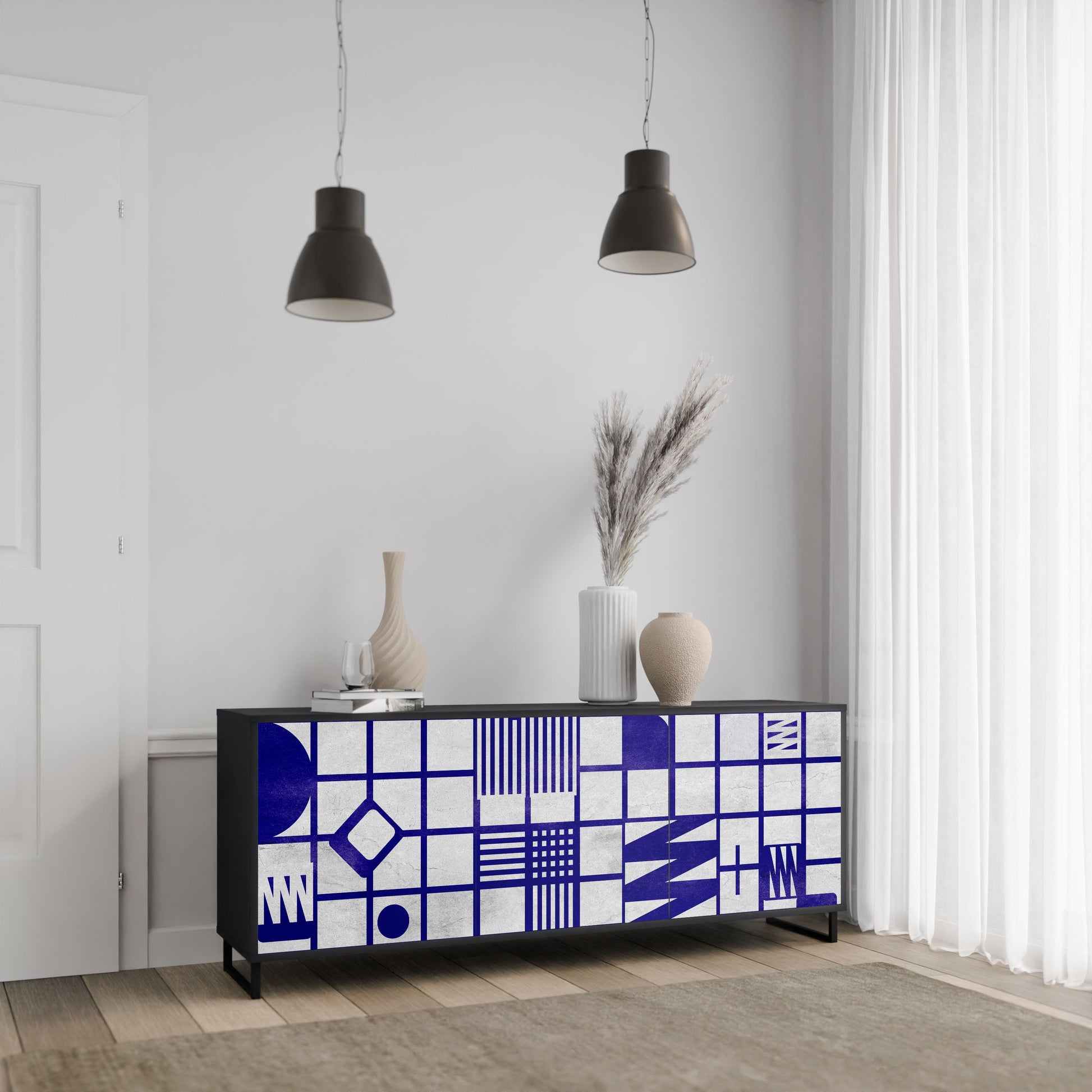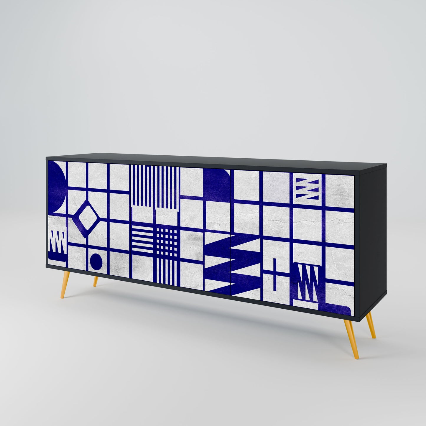Eleganza e funzionalità in un unico mobile: la nostra credenza a 3 ante con corpo nero è la soluzione perfetta per gli amanti degli interni eleganti e moderni. Il corpo nero enfatizza il carattere audace del mobile, mentre i frontali con una stampa unica aggiungono un tocco artistico. Si adatta perfettamente al soggiorno, alla camera da letto o all'ufficio, completando sia gli arrangiamenti moderni che quelli industriali.