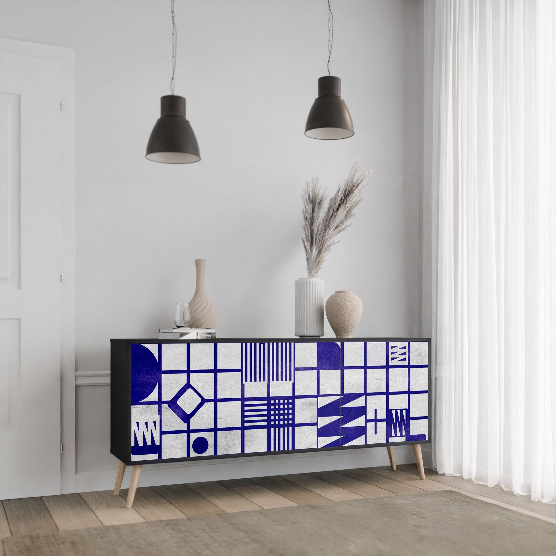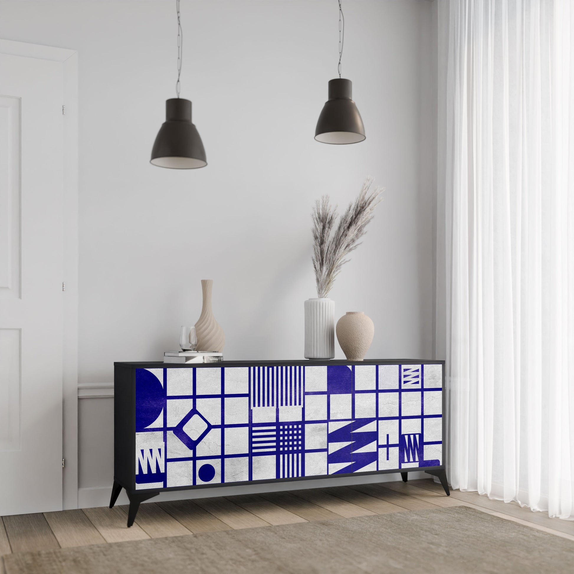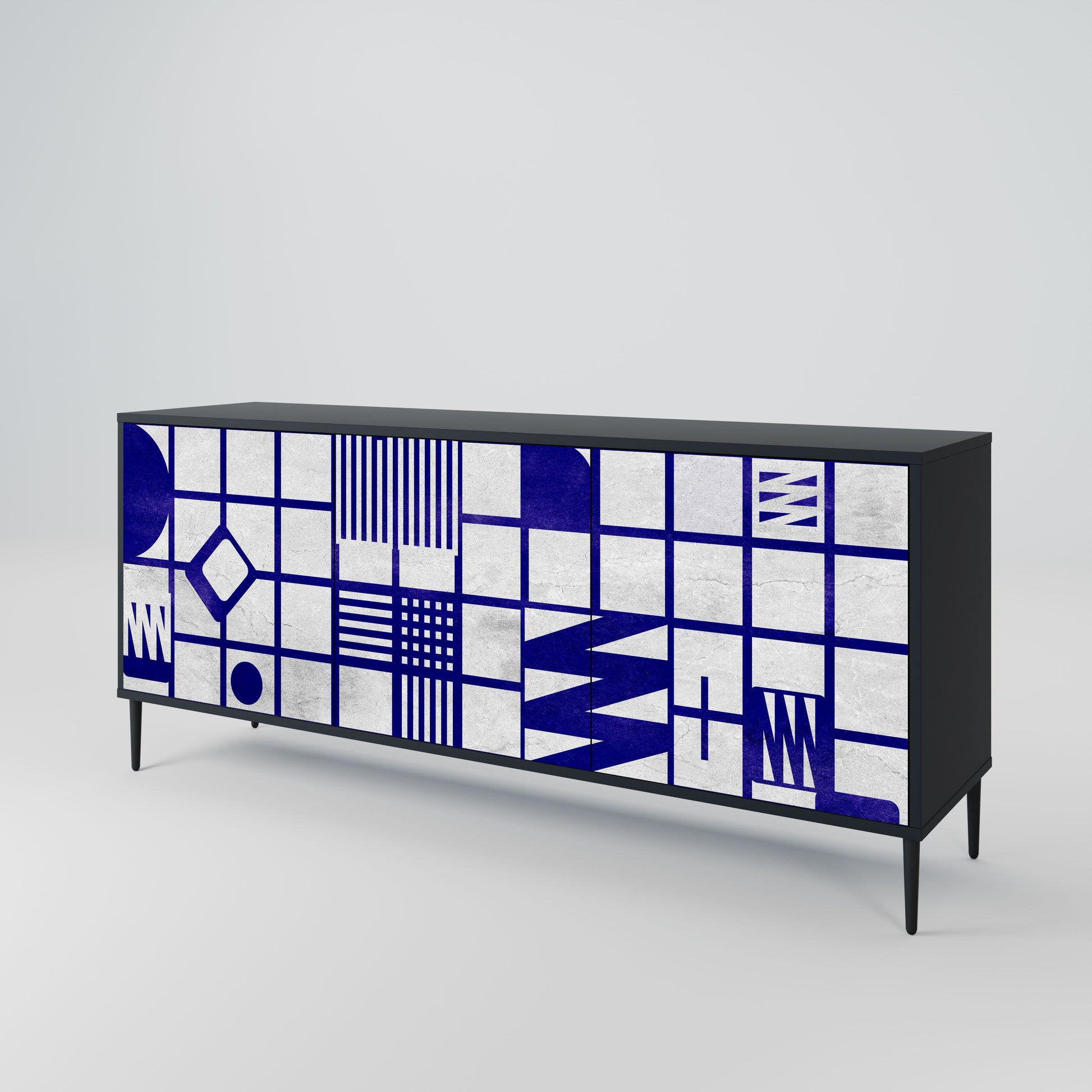 Eleganza e funzionalità in un unico mobile: la nostra credenza a 3 ante con corpo nero è la soluzione perfetta per gli amanti degli interni eleganti e moderni. Il corpo nero enfatizza il carattere audace del mobile, mentre i frontali con una stampa unica aggiungono un tocco artistico. Si adatta perfettamente al soggiorno, alla camera da letto o all'ufficio, completando sia gli arrangiamenti moderni che quelli industriali.