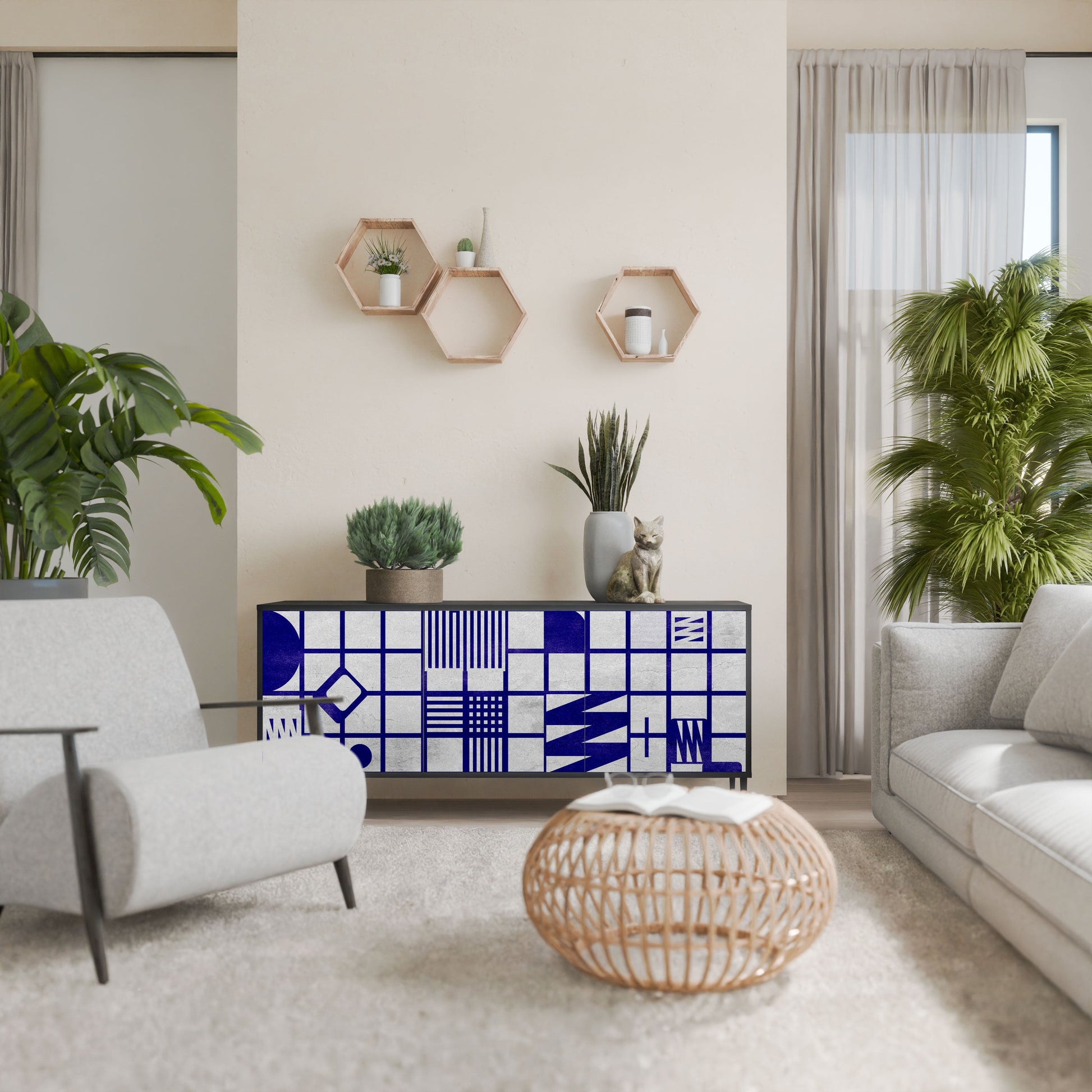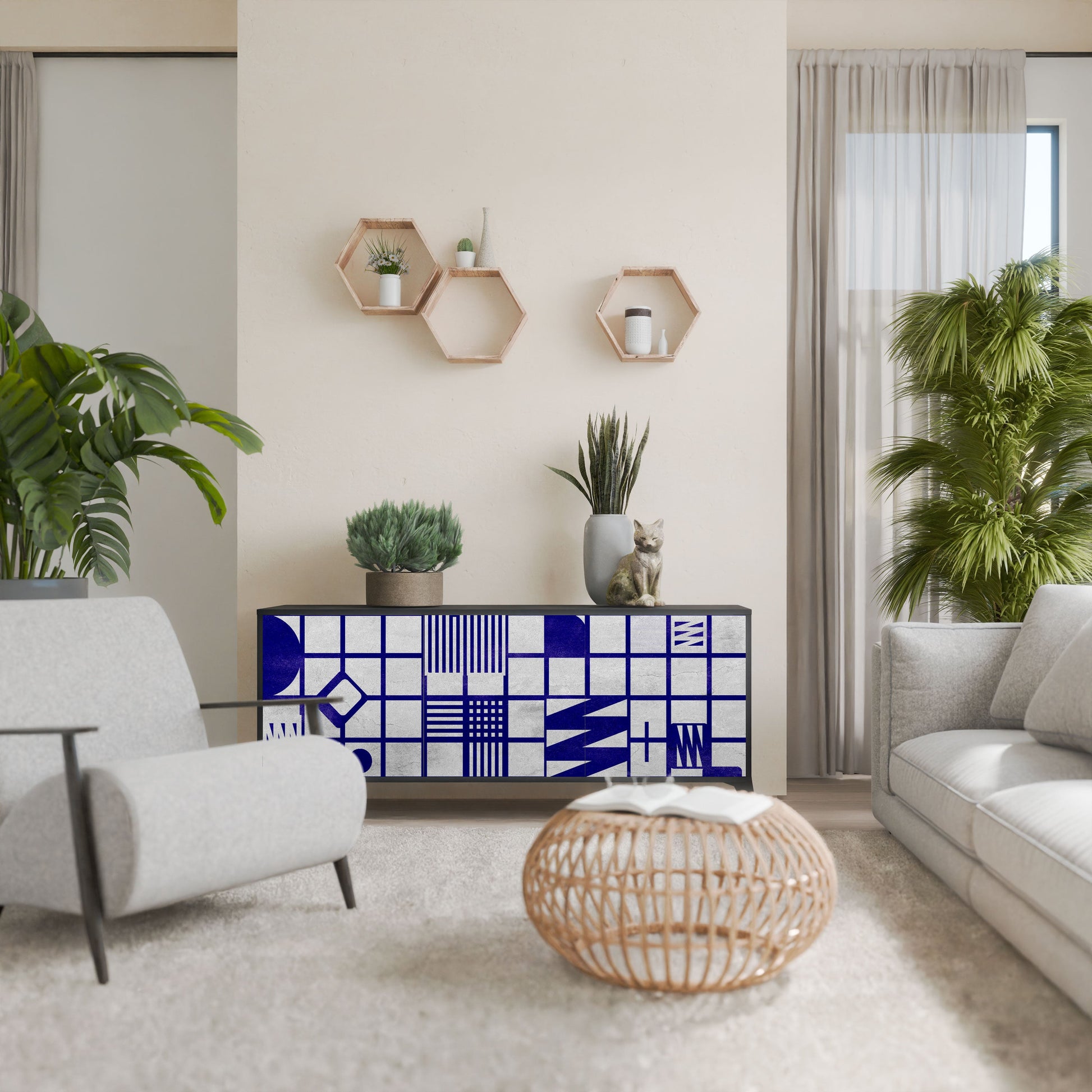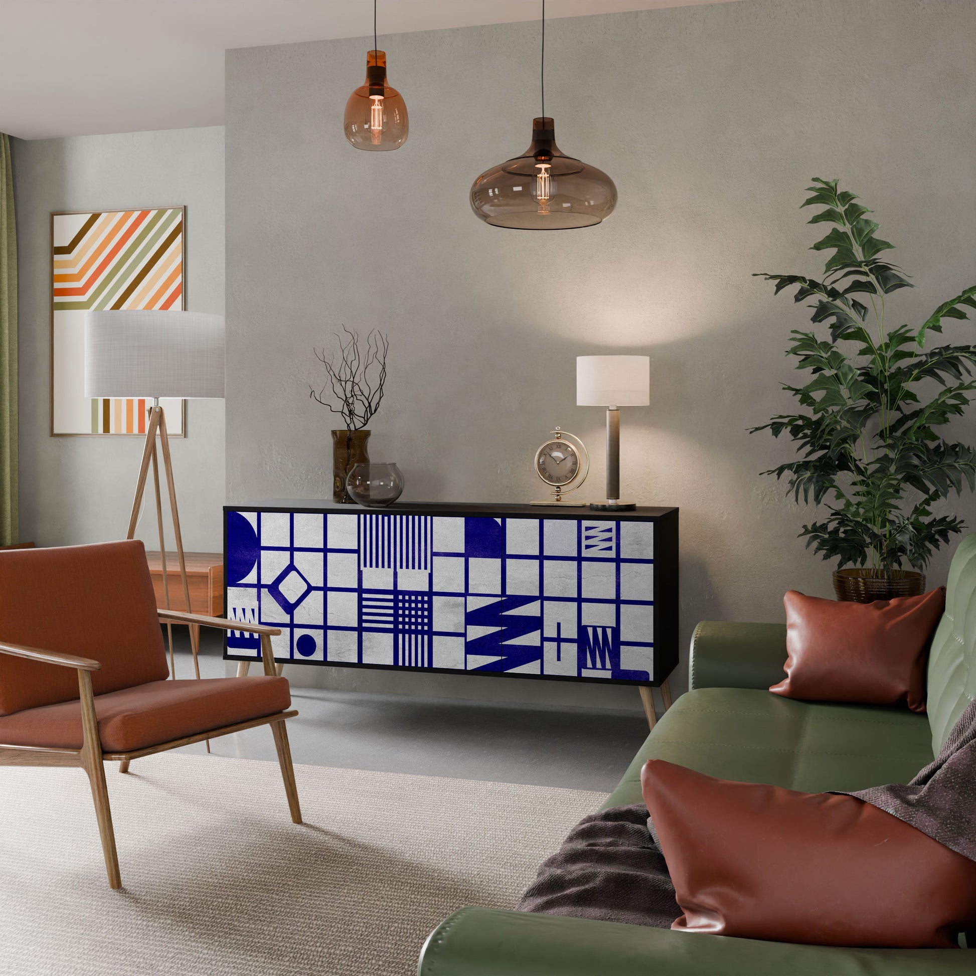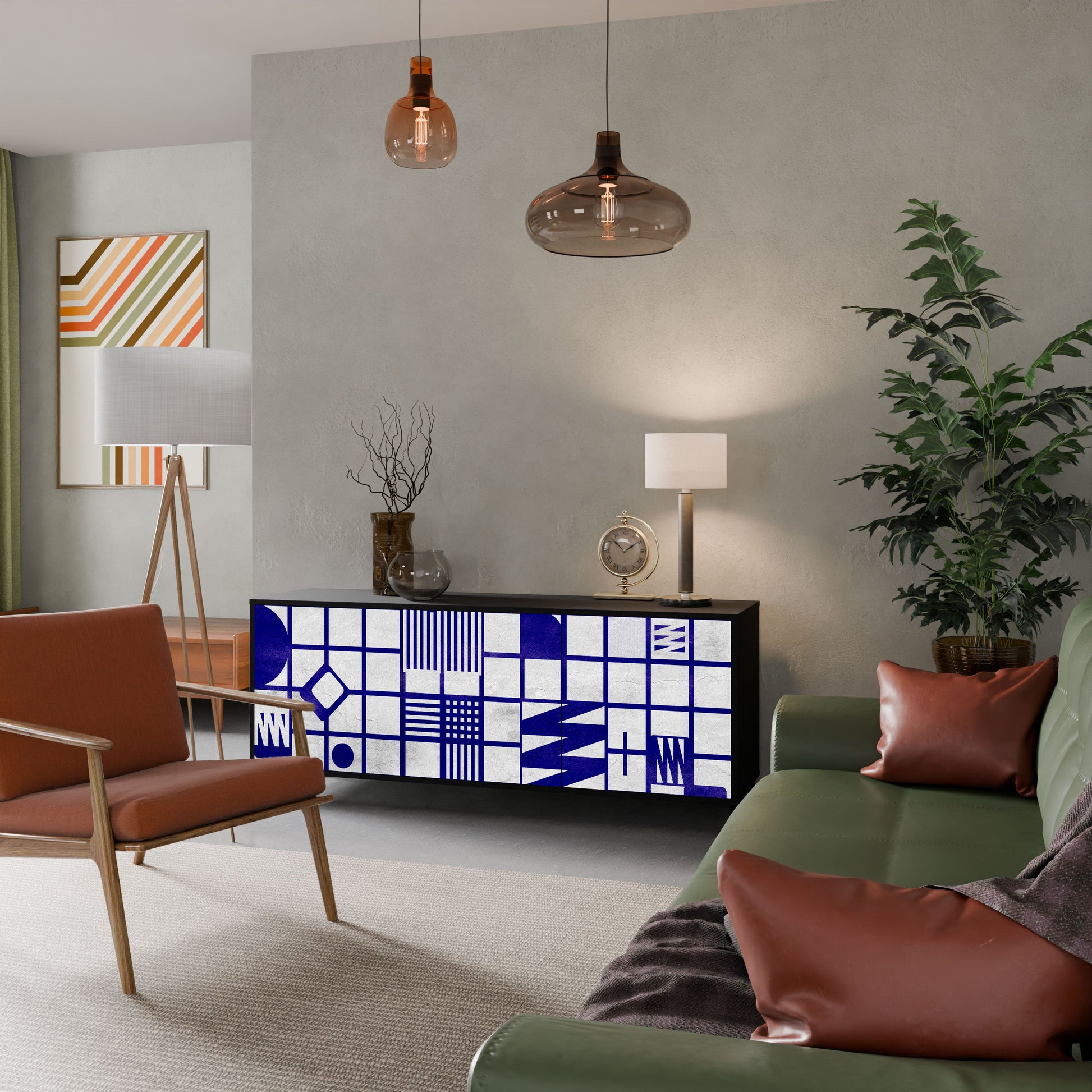 Eleganza e funzionalità in un unico mobile: la nostra credenza a 3 ante con corpo nero è la soluzione perfetta per gli amanti degli interni eleganti e moderni. Il corpo nero enfatizza il carattere audace del mobile, mentre i frontali con una stampa unica aggiungono un tocco artistico. Si adatta perfettamente al soggiorno, alla camera da letto o all'ufficio, completando sia gli arrangiamenti moderni che quelli industriali.