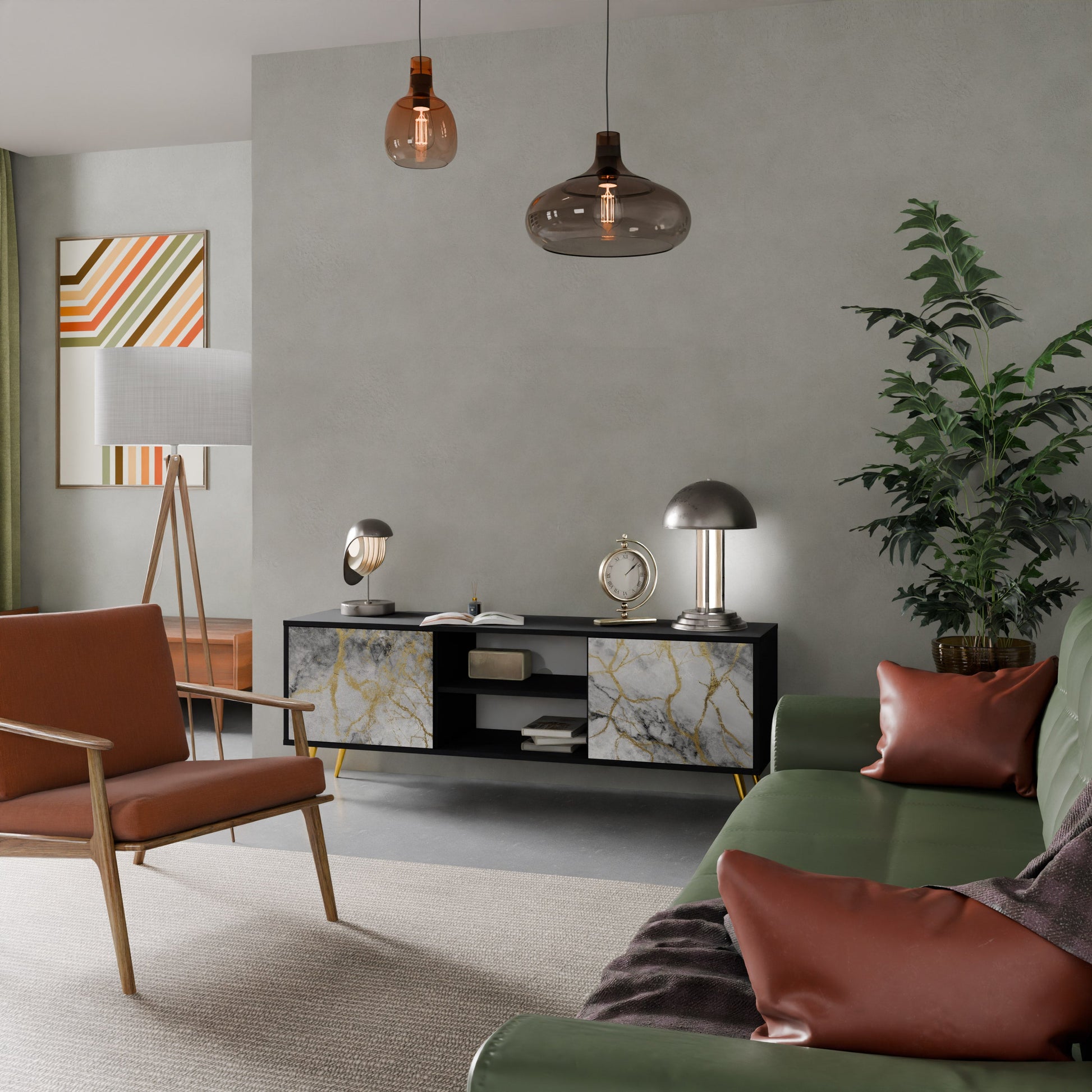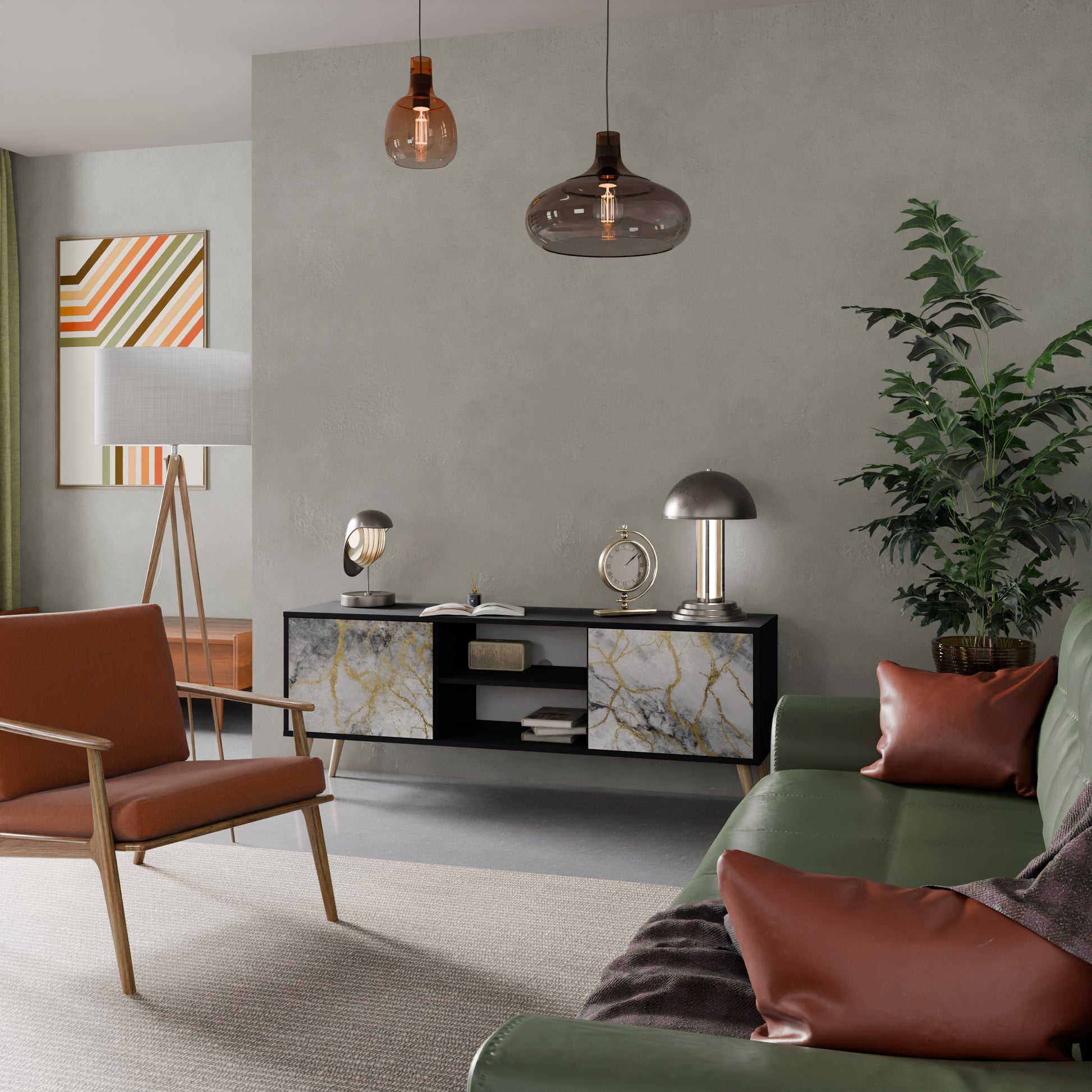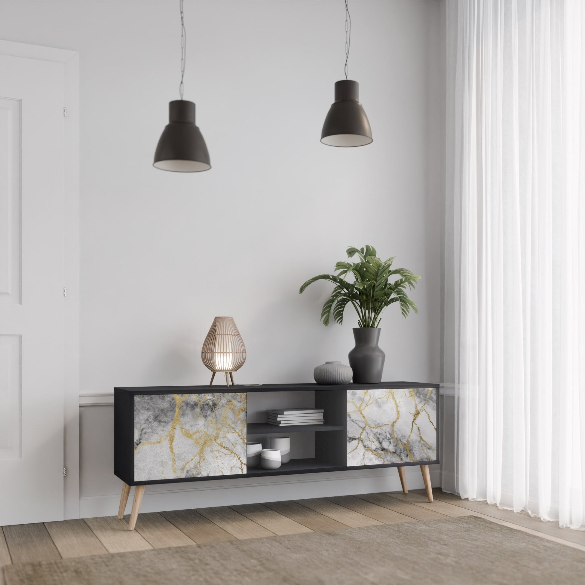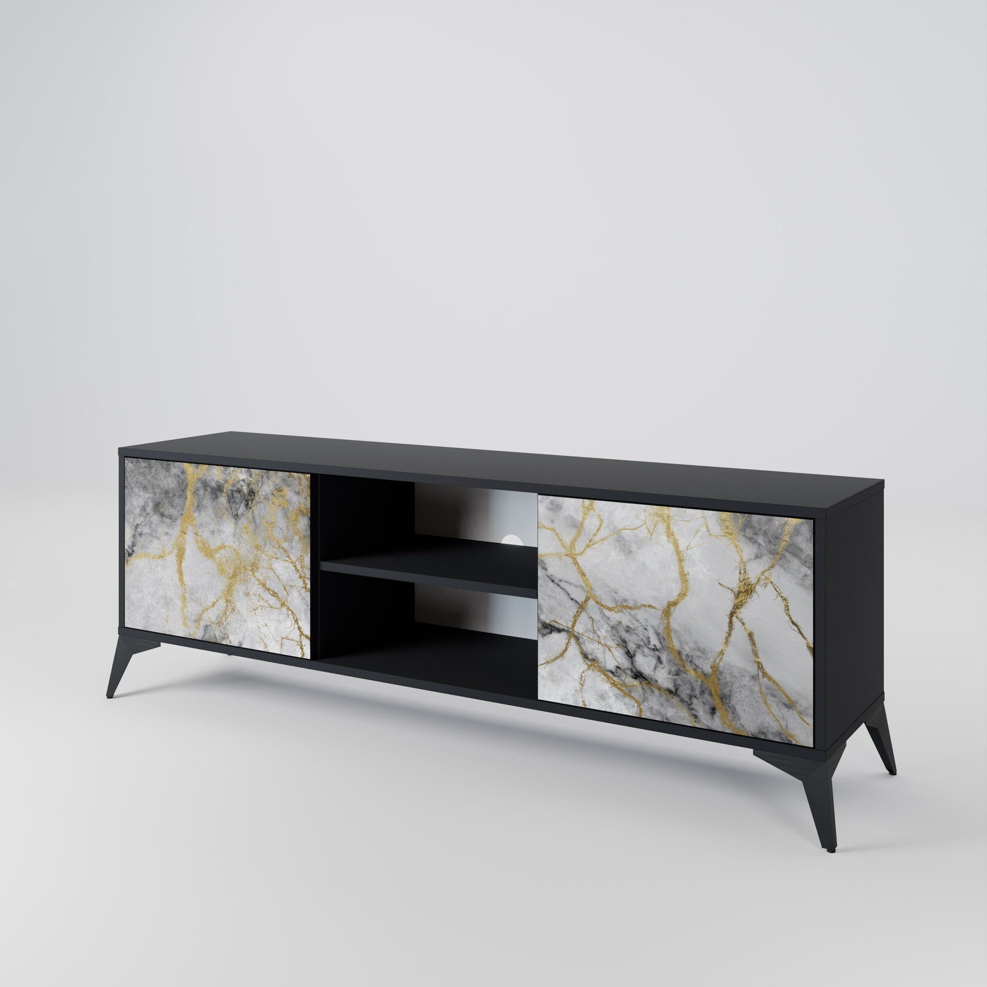 Il corpo nero conferisce al mobile TV un aspetto elegante e moderno, mentre i frontali con una stampa eccezionale attirano l'attenzione, rendendolo il punto focale di ogni stanza. L'interno spazioso offre spazio per dispositivi elettronici, cavi, telecomandi e altri accessori, aiutandoti a mantenere ordine e organizzazione.