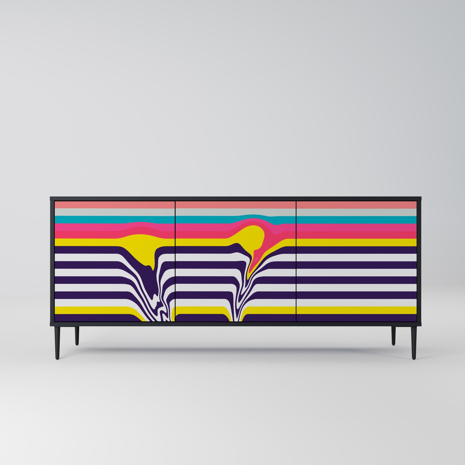 Eleganza e funzionalità in un unico mobile: la nostra credenza a 3 ante con corpo nero è la soluzione perfetta per gli amanti degli interni eleganti e moderni. Il corpo nero enfatizza il carattere audace del mobile, mentre i frontali con una stampa unica aggiungono un tocco artistico. Si adatta perfettamente al soggiorno, alla camera da letto o all'ufficio, completando sia gli arrangiamenti moderni che quelli industriali.
