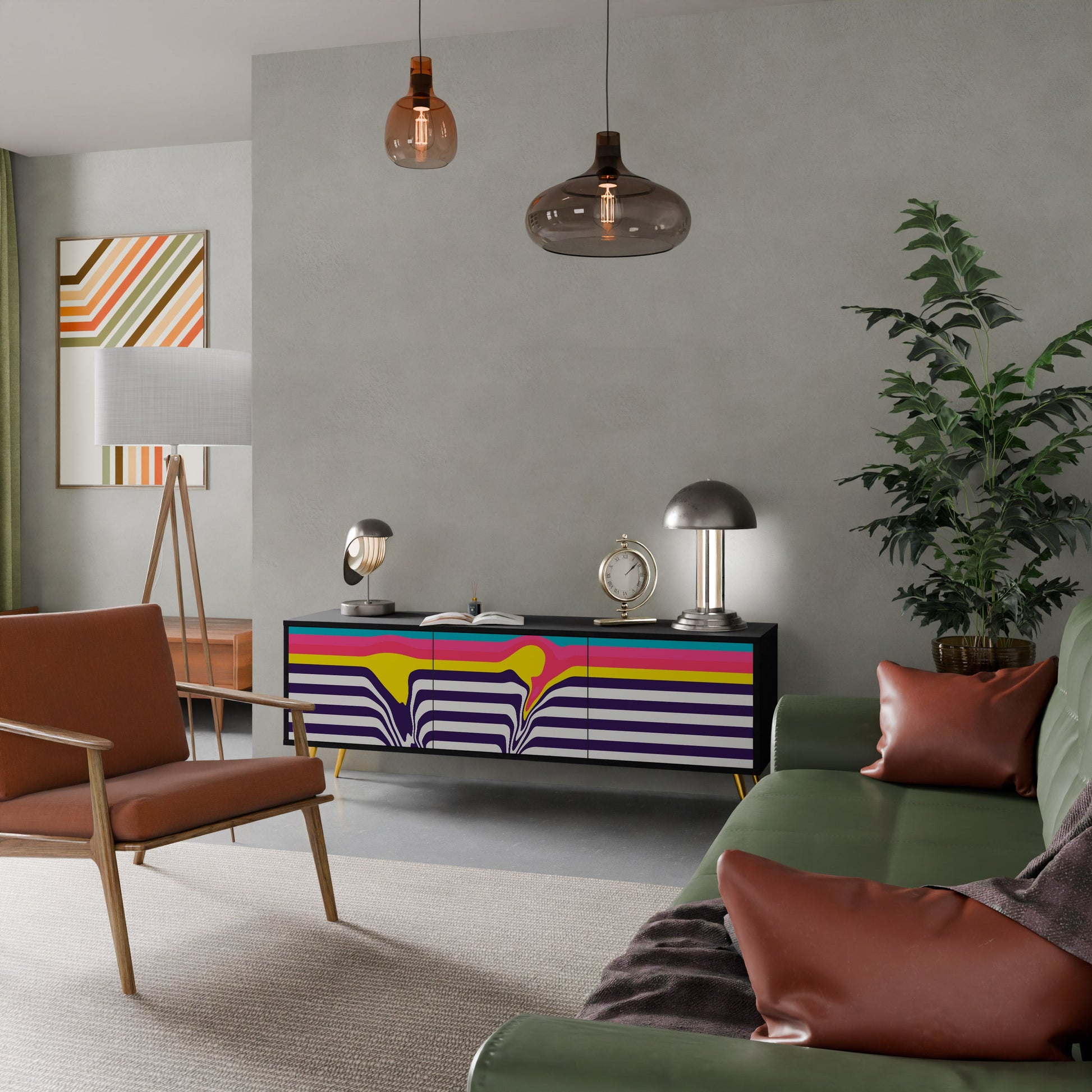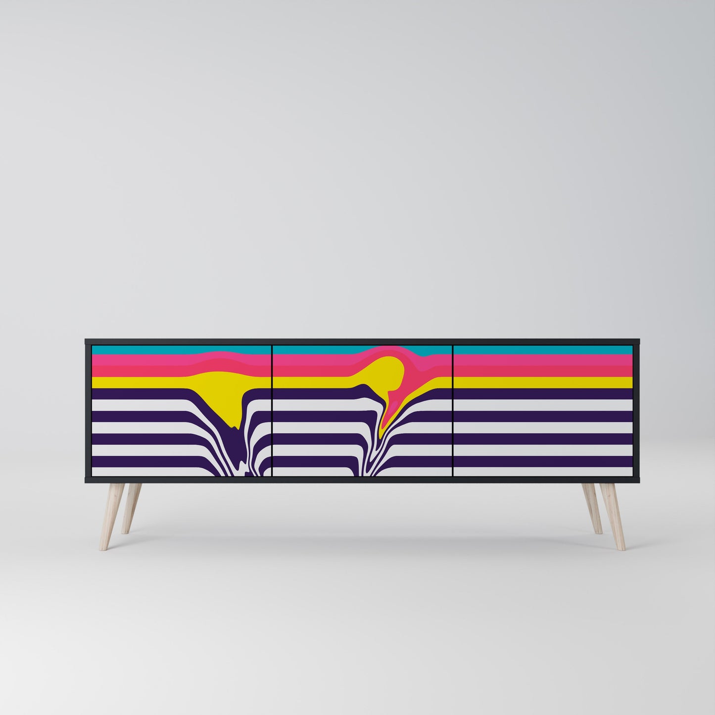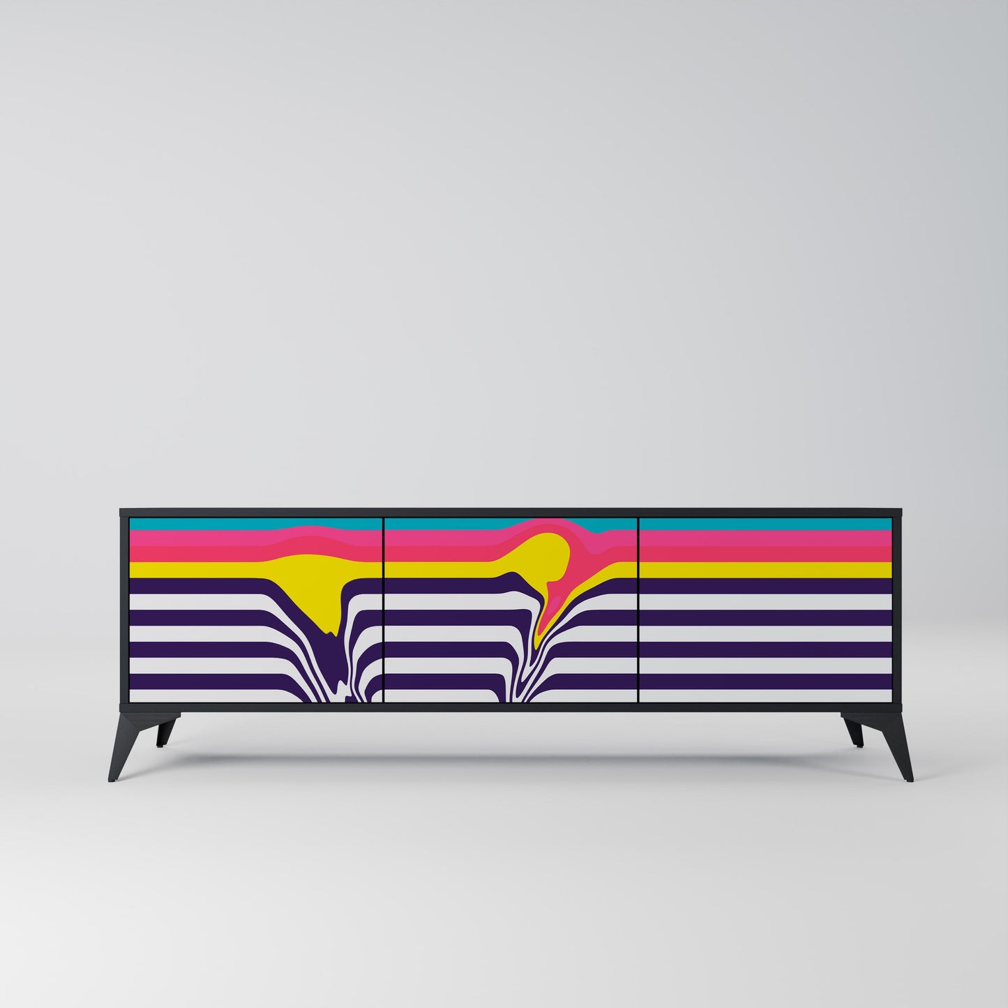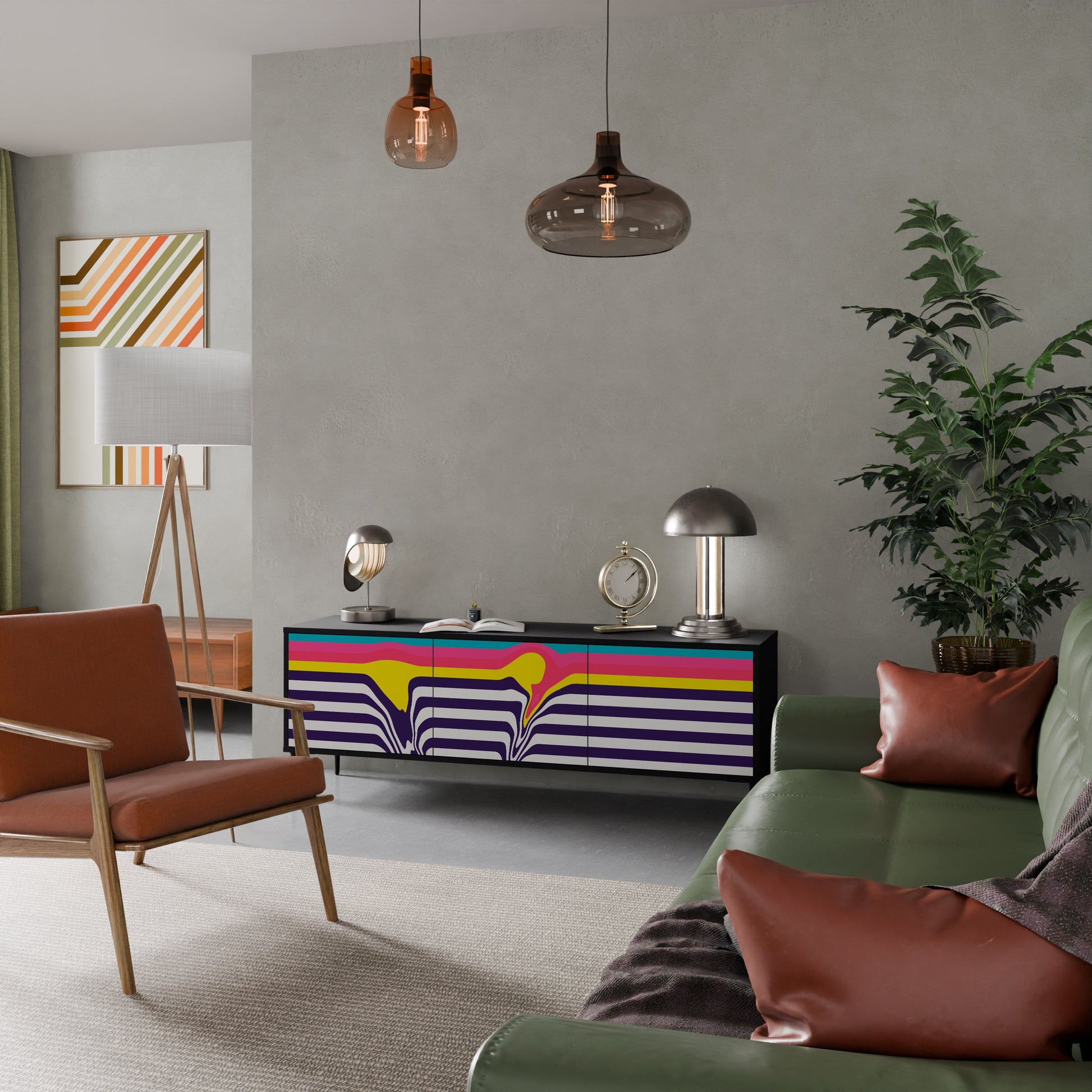 Il corpo nero del supporto crea un accento audace e moderno che si abbina magnificamente ad allestimenti industriali e minimalisti. I frontali con una stampa di design aggiungono carattere e unicità, rendendo questo pezzo non solo pratico ma anche un elemento decorativo di spicco.