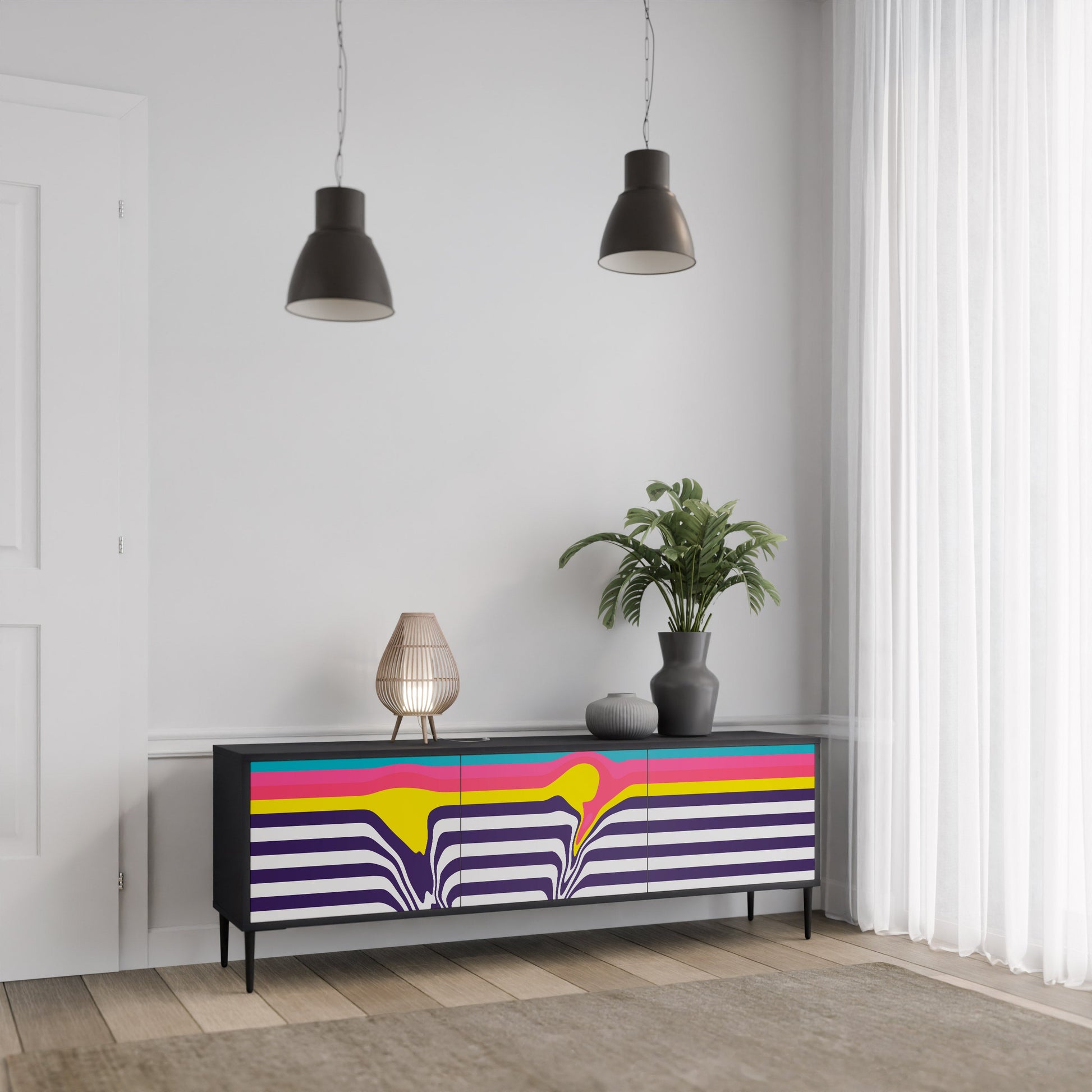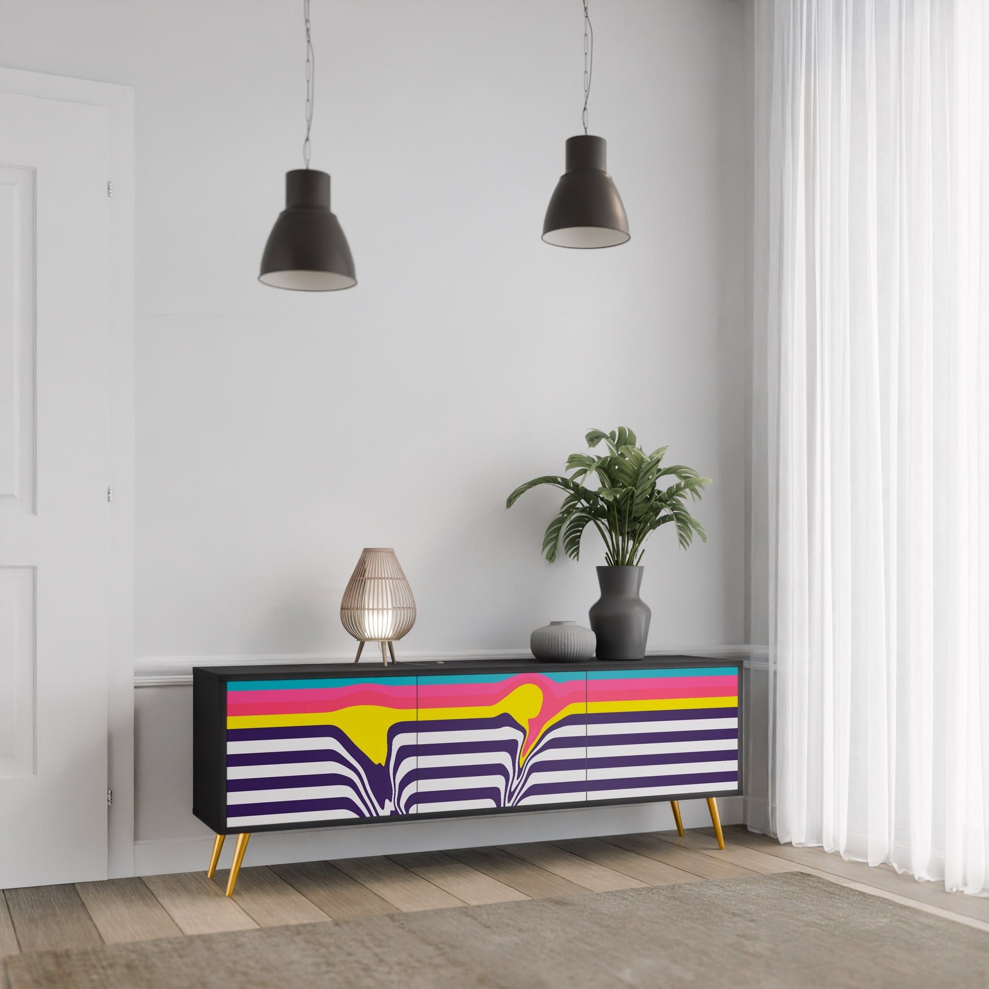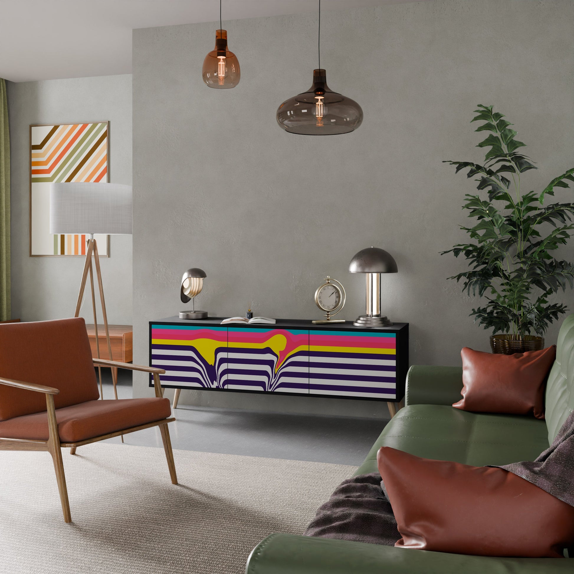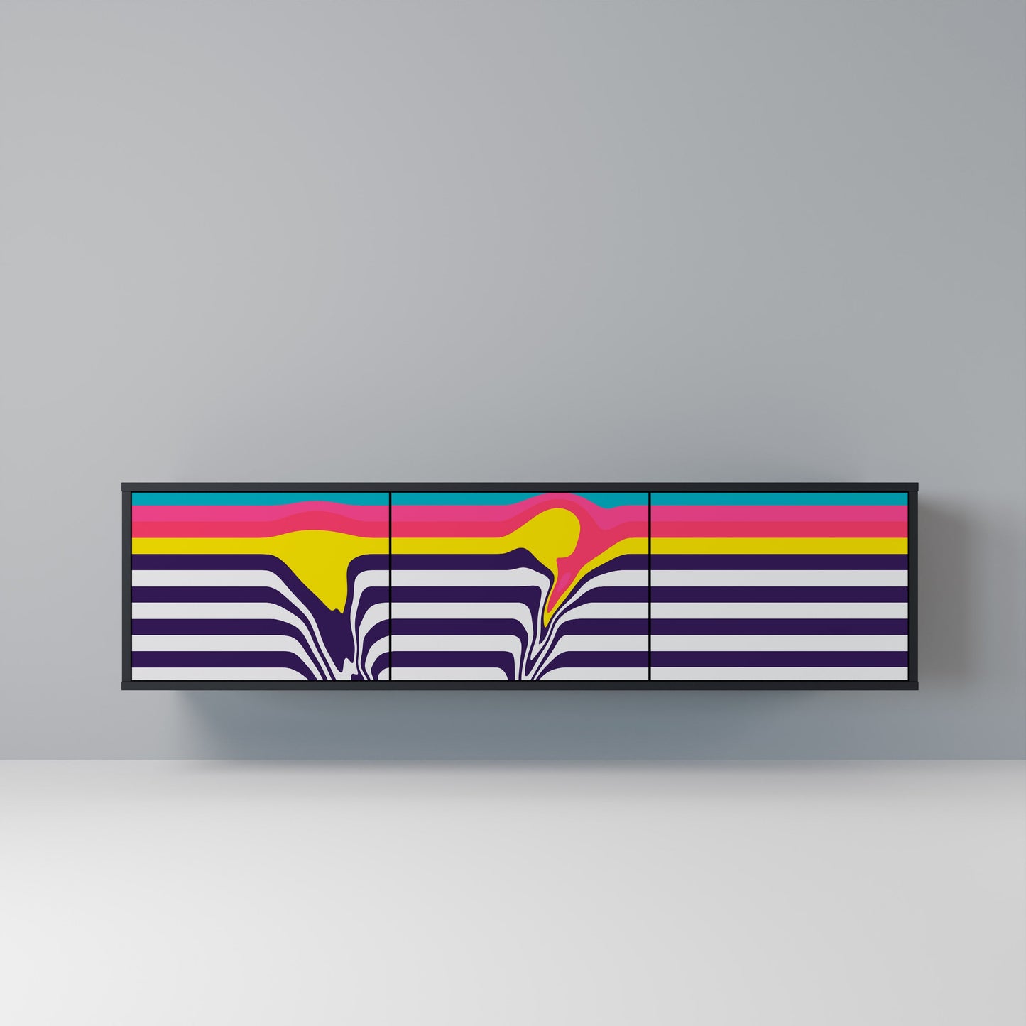 Il corpo nero del supporto crea un accento audace e moderno che si abbina magnificamente ad allestimenti industriali e minimalisti. I frontali con una stampa di design aggiungono carattere e unicità, rendendo questo pezzo non solo pratico ma anche un elemento decorativo di spicco.