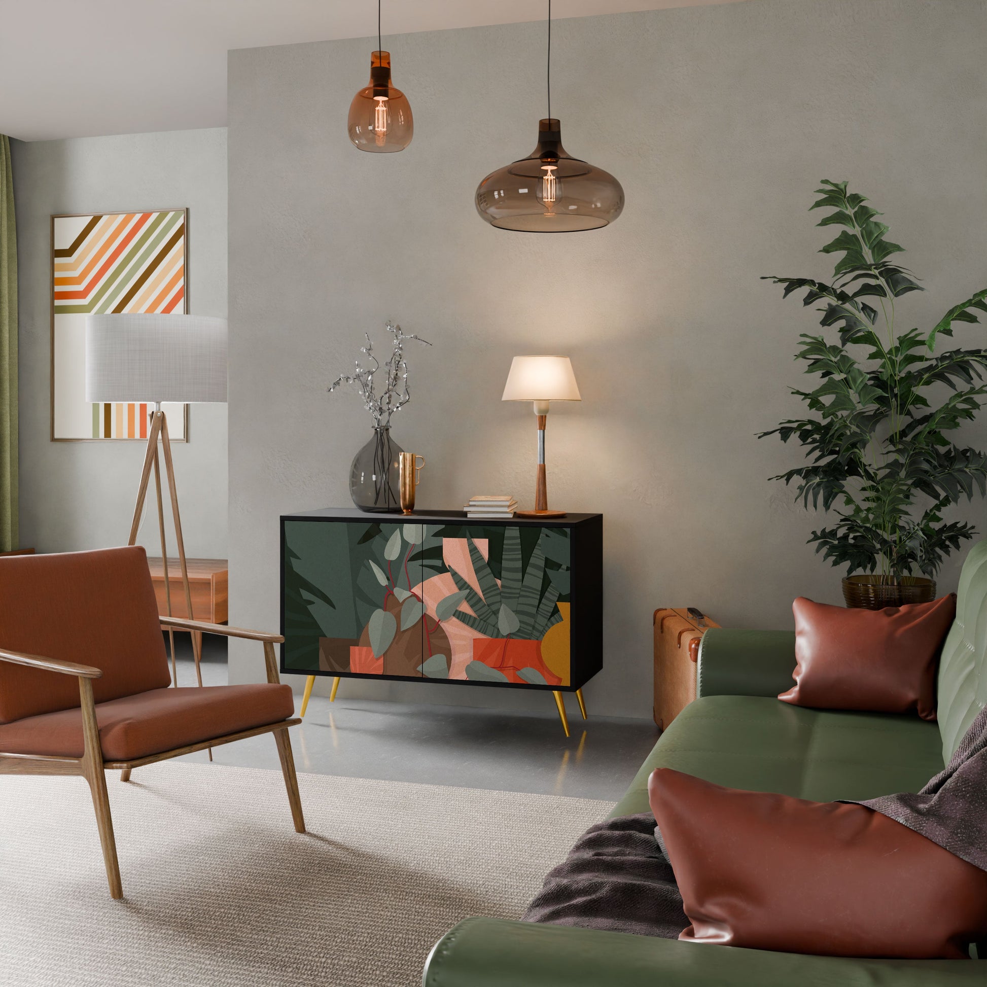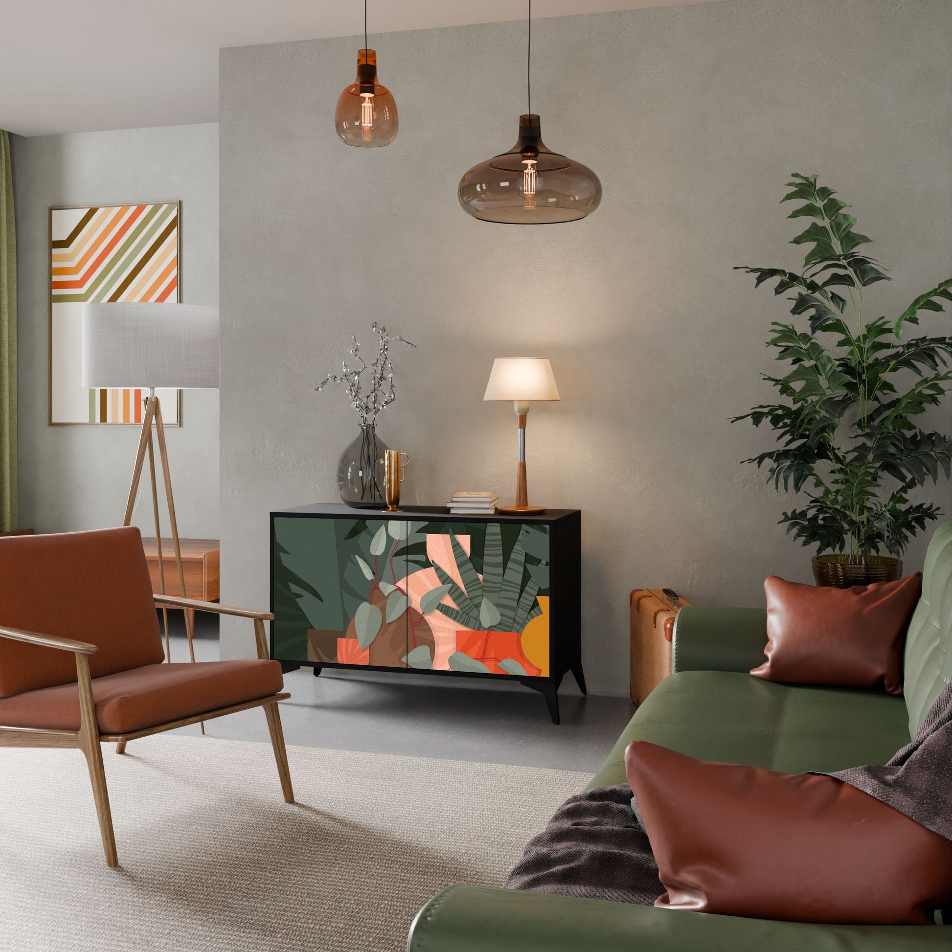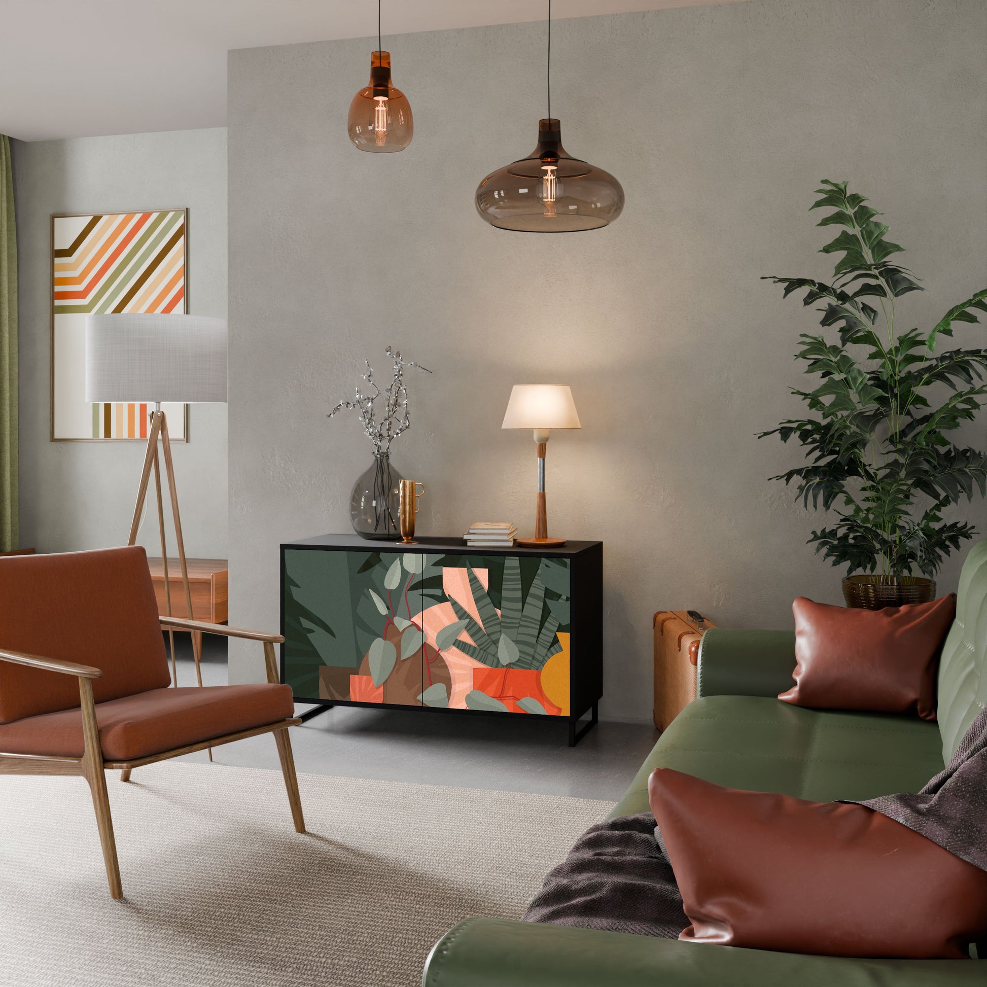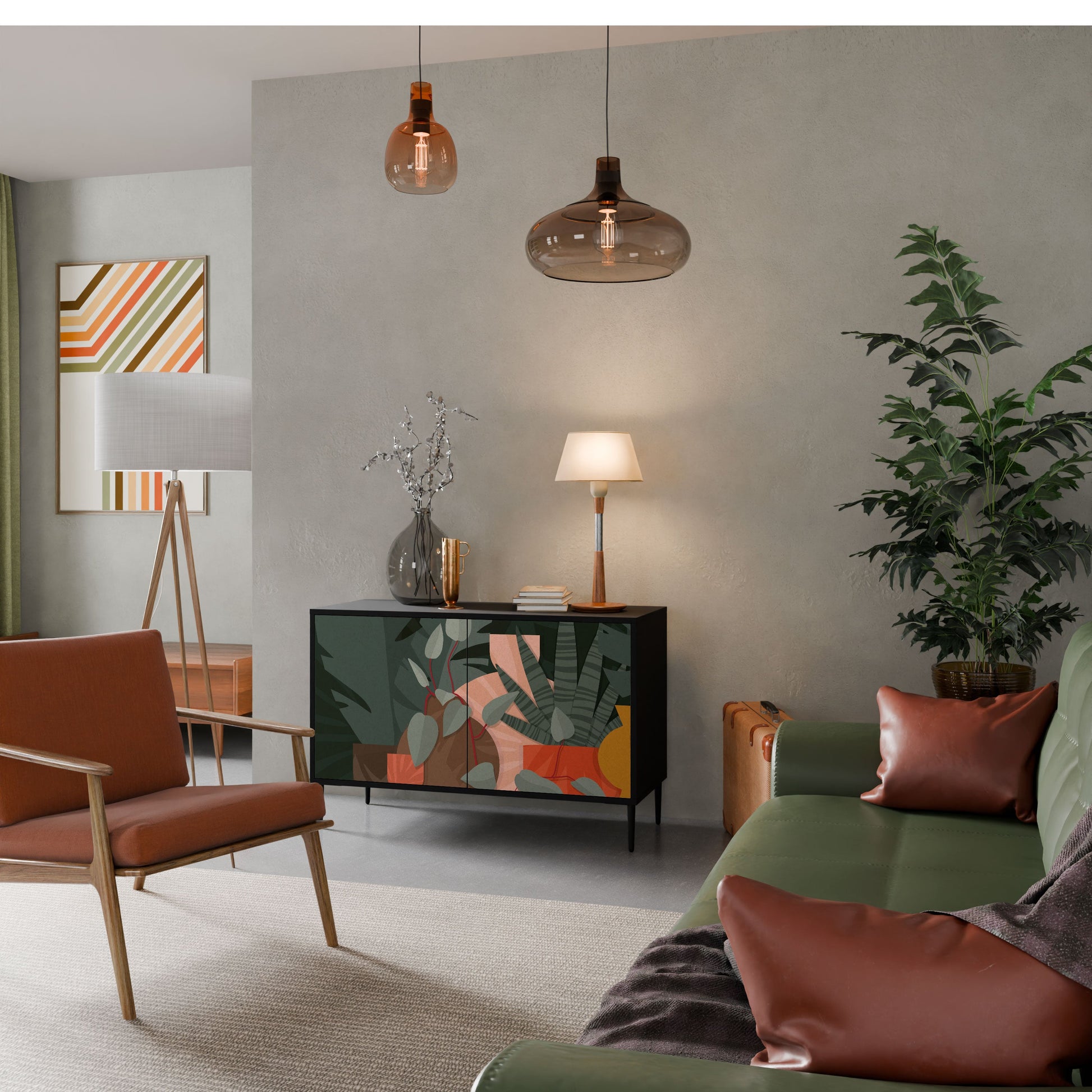 Eleganza e funzionalità in un unico mobile: la nostra credenza a 2 ante con corpo nero è la soluzione perfetta per gli amanti degli interni eleganti e moderni. Il corpo nero enfatizza il carattere audace del mobile, mentre i frontali con una stampa unica aggiungono un tocco artistico. Si adatta perfettamente al soggiorno, alla camera da letto o all'ufficio, completando sia gli arrangiamenti moderni che quelli industriali.