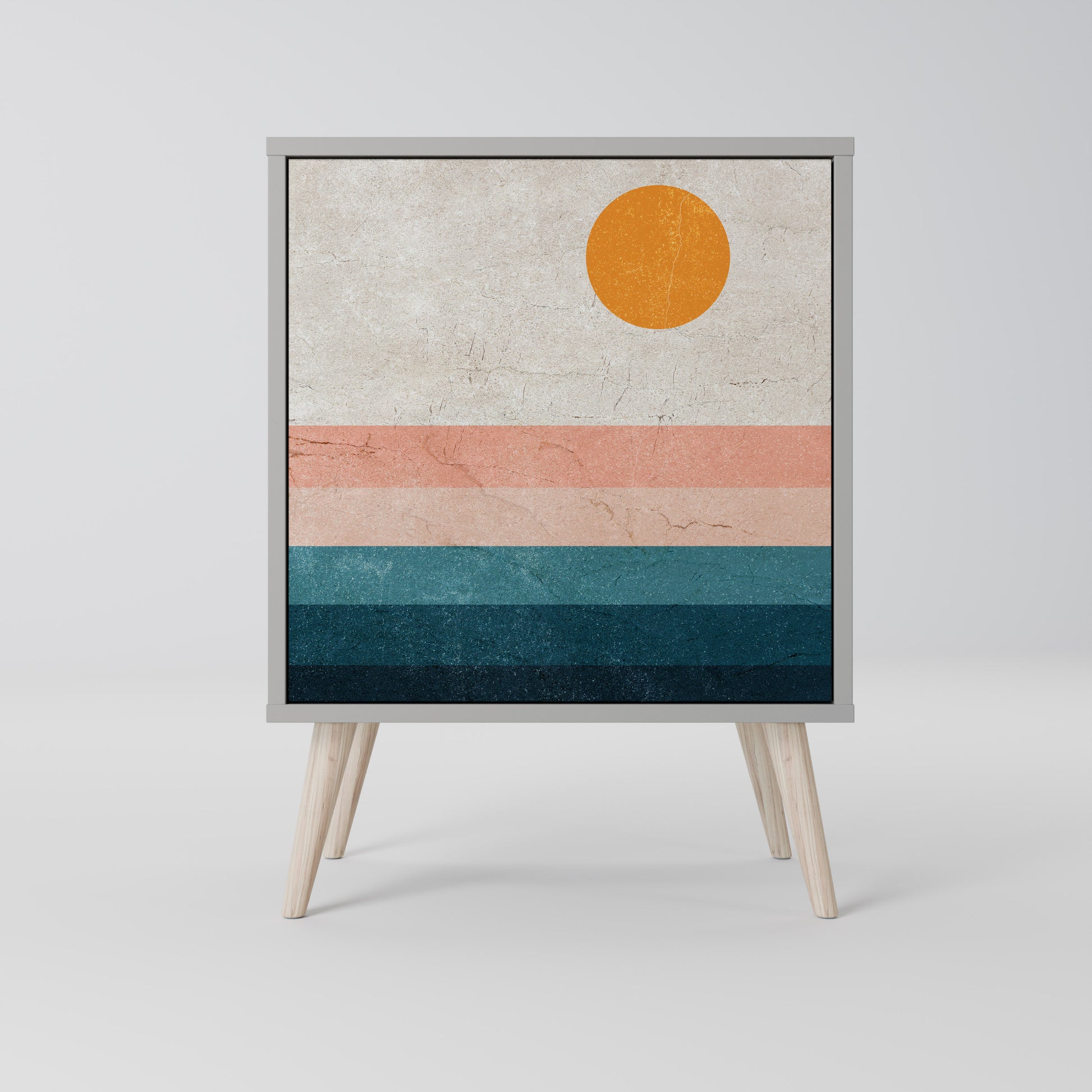 Questo mobile compatto ma straordinariamente elegante colpisce per il suo design minimalista, che si adatta perfettamente sia agli interni moderni che a quelli classici. Il tenue colore grigio della struttura conferisce al mobile un carattere discreto ma distintivo, mentre i frontali con una stampa esclusiva aggiungono un tocco artistico.