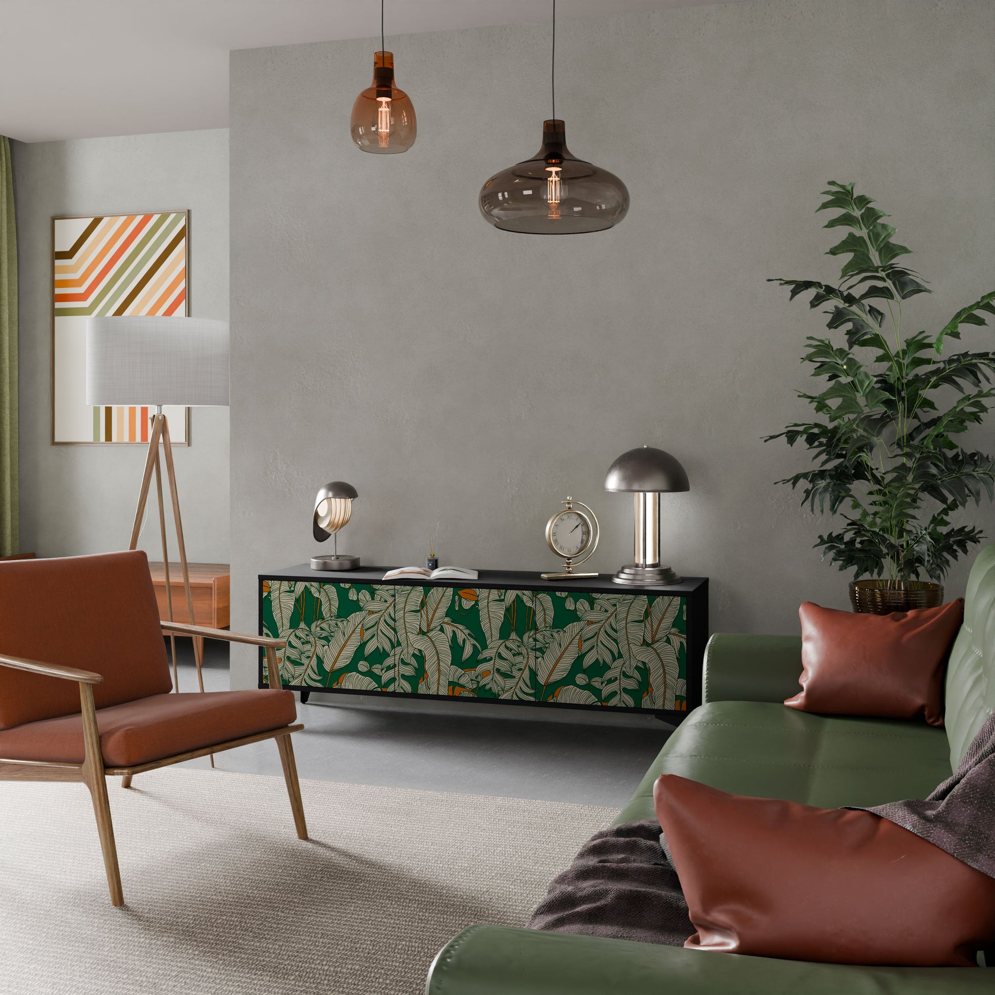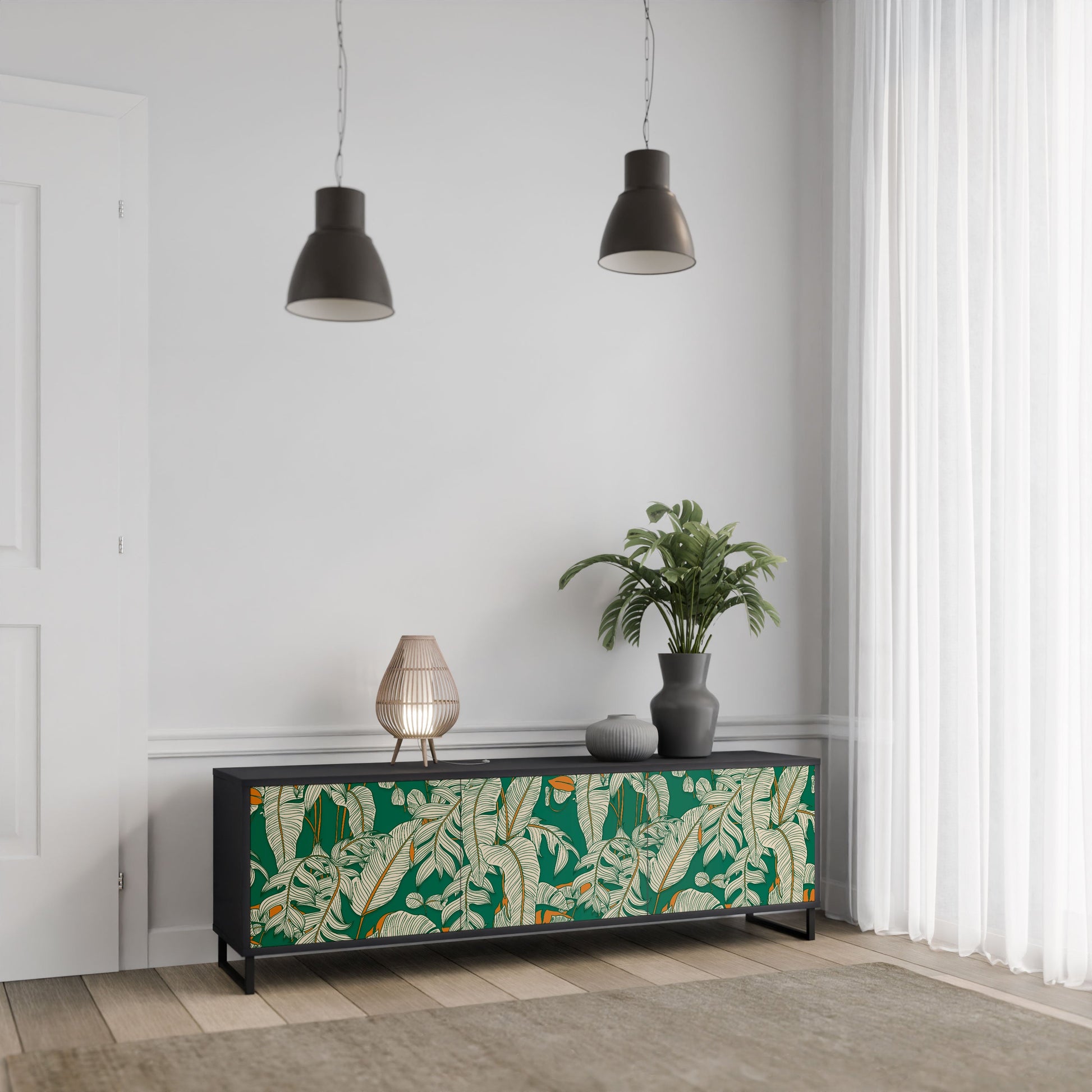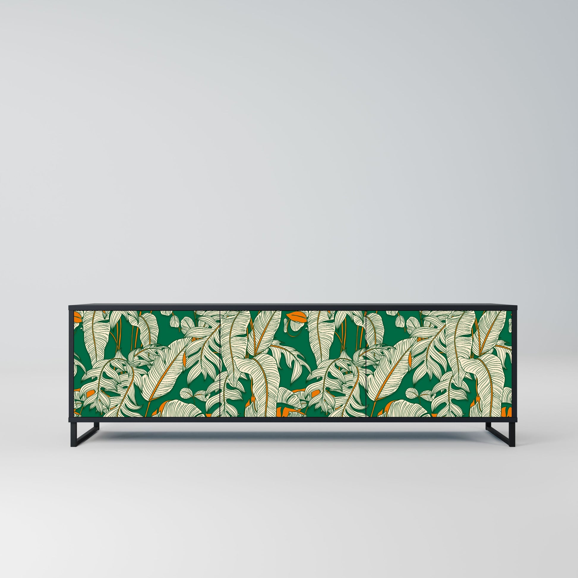 Il corpo nero del supporto crea un accento audace e moderno che si abbina magnificamente ad allestimenti industriali e minimalisti. I frontali con una stampa di design aggiungono carattere e unicità, rendendo questo pezzo non solo pratico ma anche un elemento decorativo di spicco.