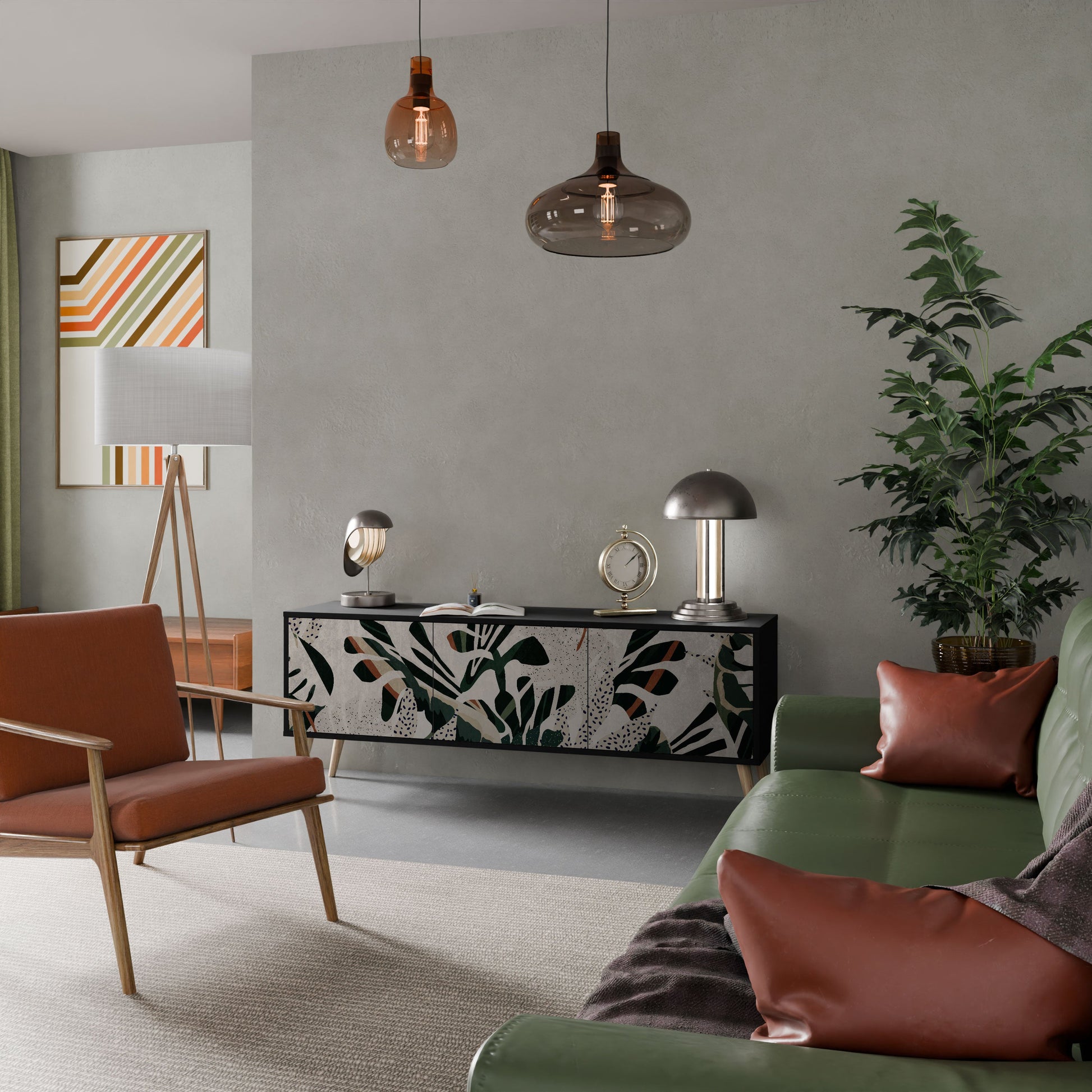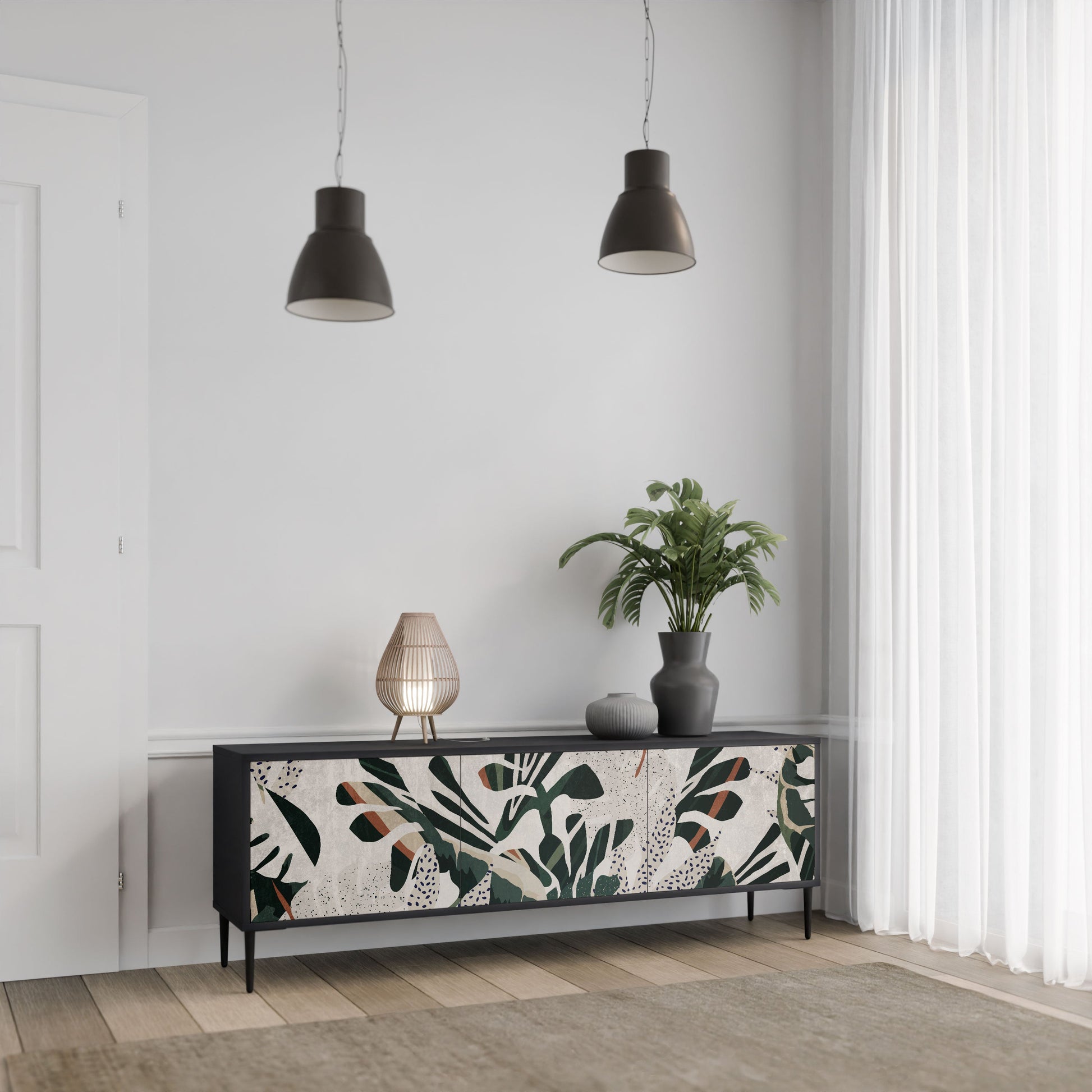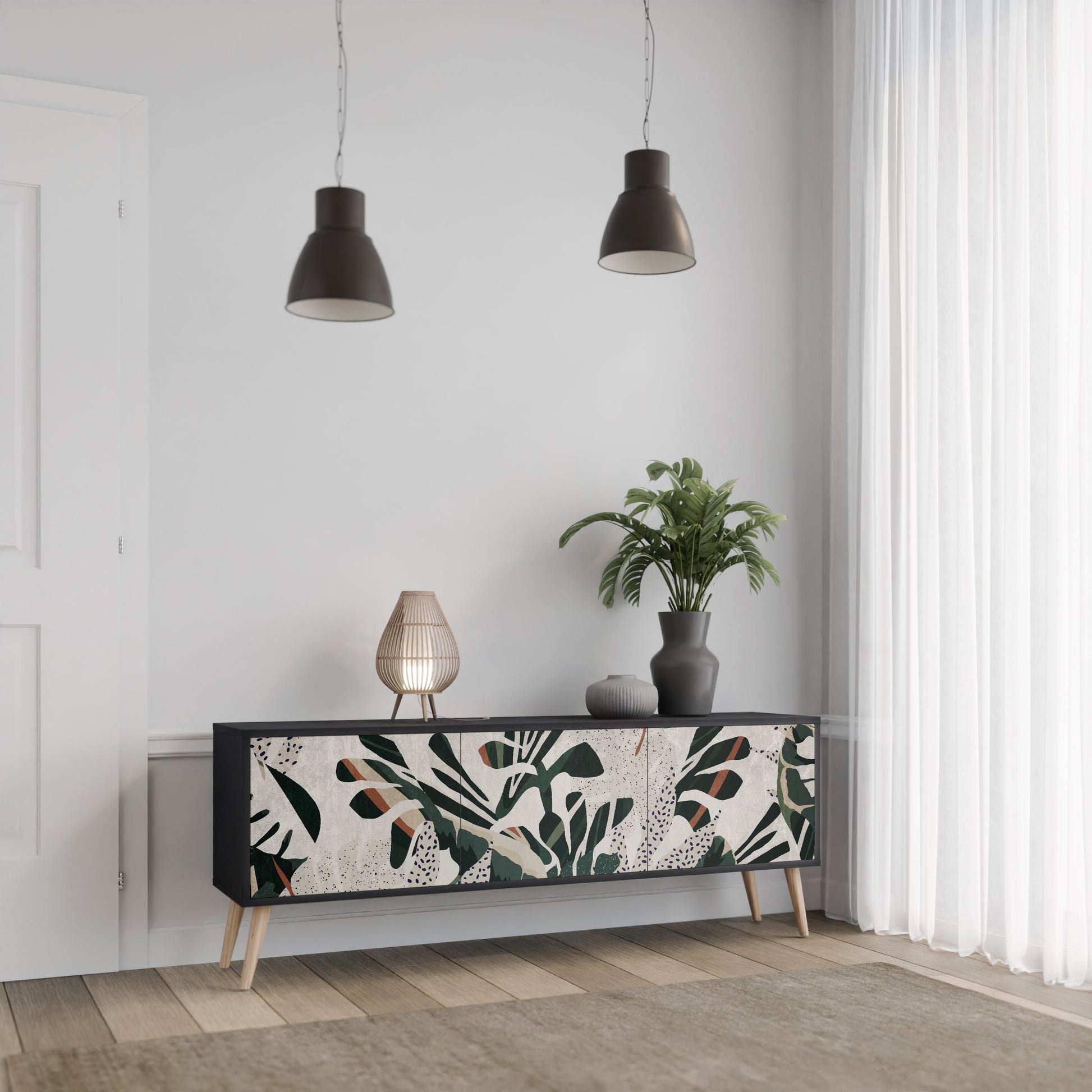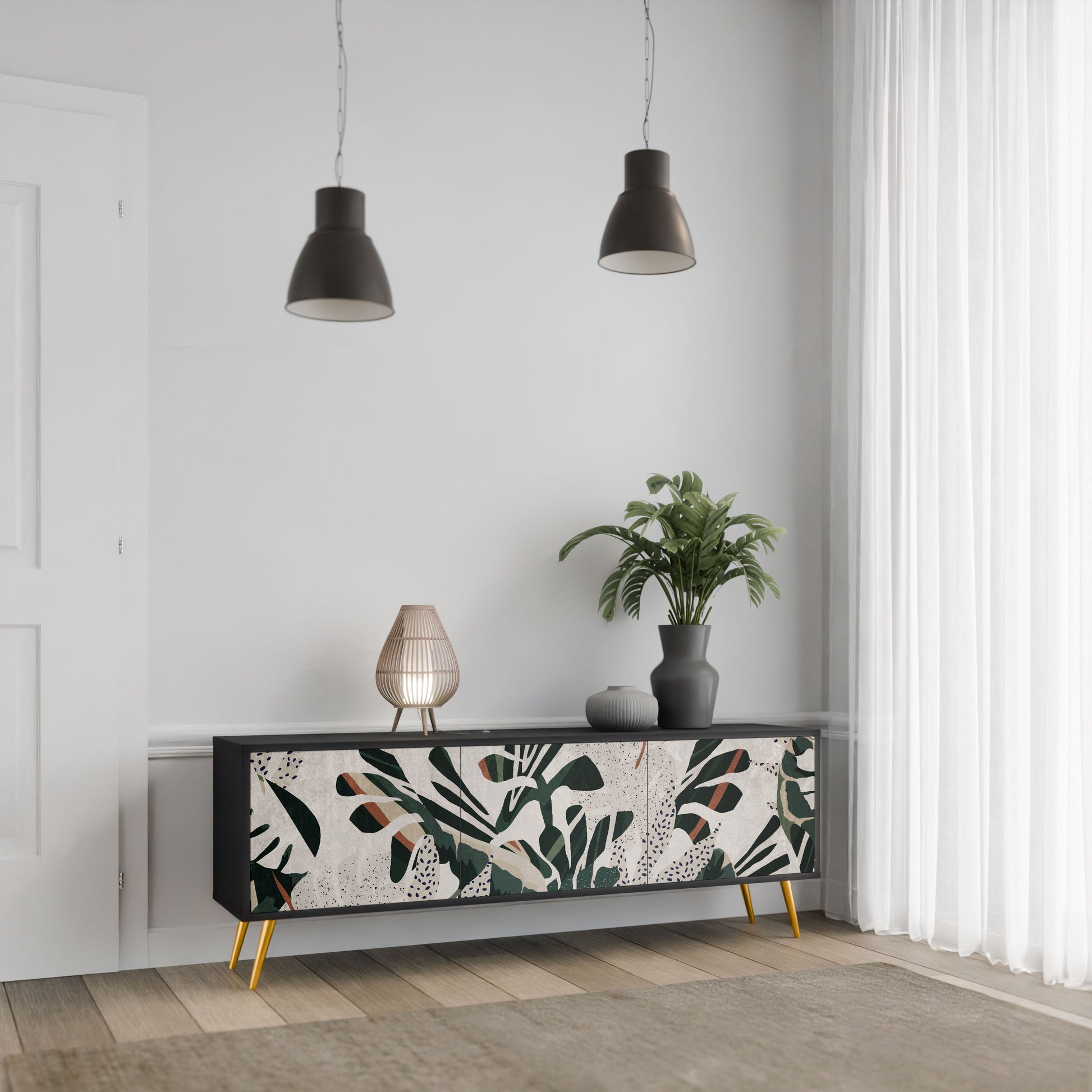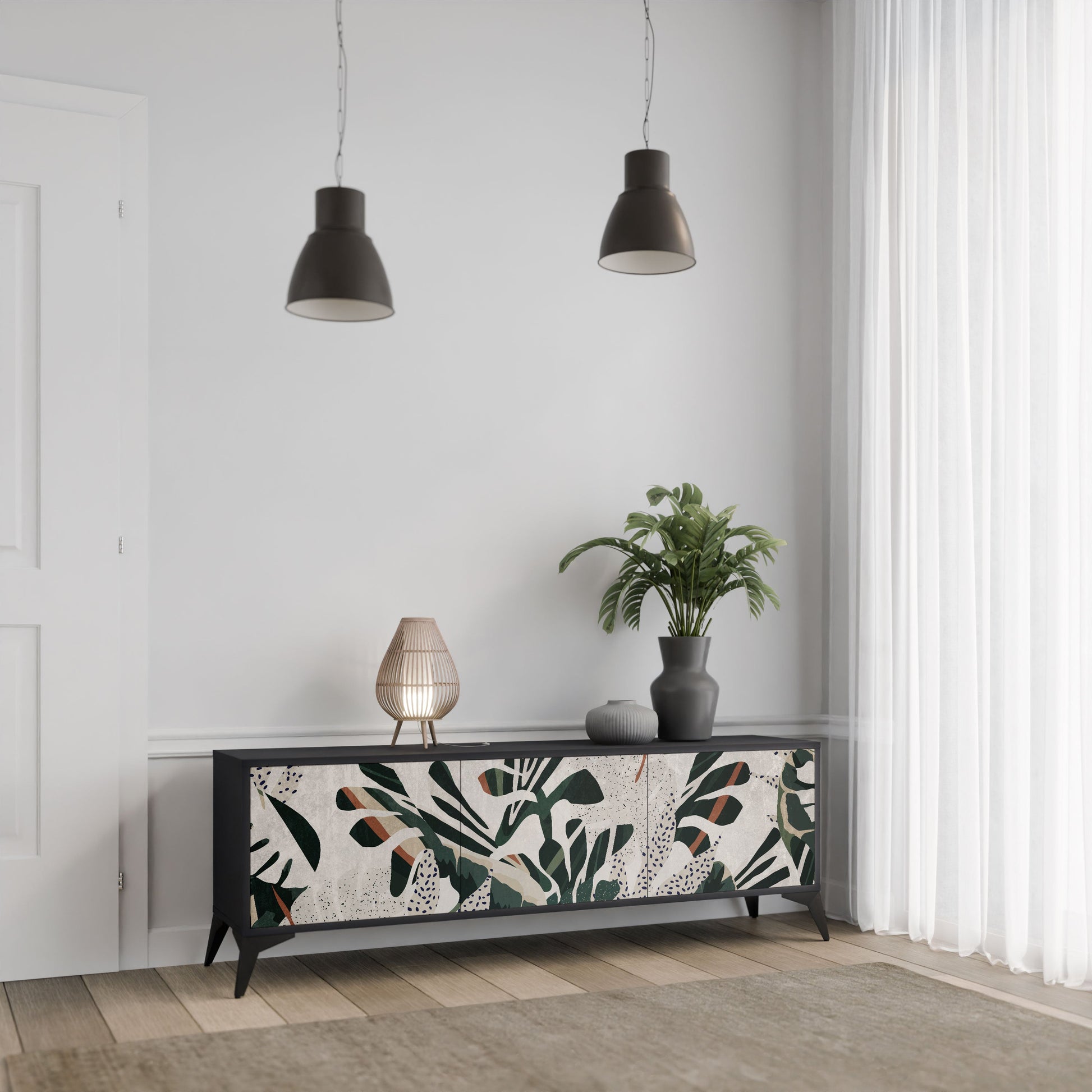 Il corpo nero del supporto crea un accento audace e moderno che si abbina magnificamente ad allestimenti industriali e minimalisti. I frontali con una stampa di design aggiungono carattere e unicità, rendendo questo pezzo non solo pratico ma anche un elemento decorativo di spicco.