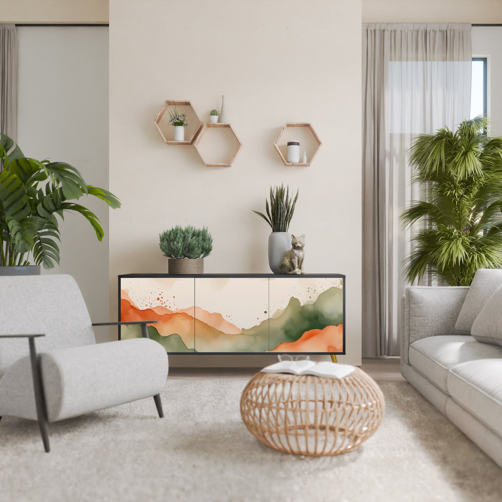Eleganza e funzionalità in un unico mobile: la nostra credenza a 3 ante con corpo nero è la soluzione perfetta per gli amanti degli interni eleganti e moderni. Il corpo nero enfatizza il carattere audace del mobile, mentre i frontali con una stampa unica aggiungono un tocco artistico. Si adatta perfettamente al soggiorno, alla camera da letto o all'ufficio, completando sia gli arrangiamenti moderni che quelli industriali.