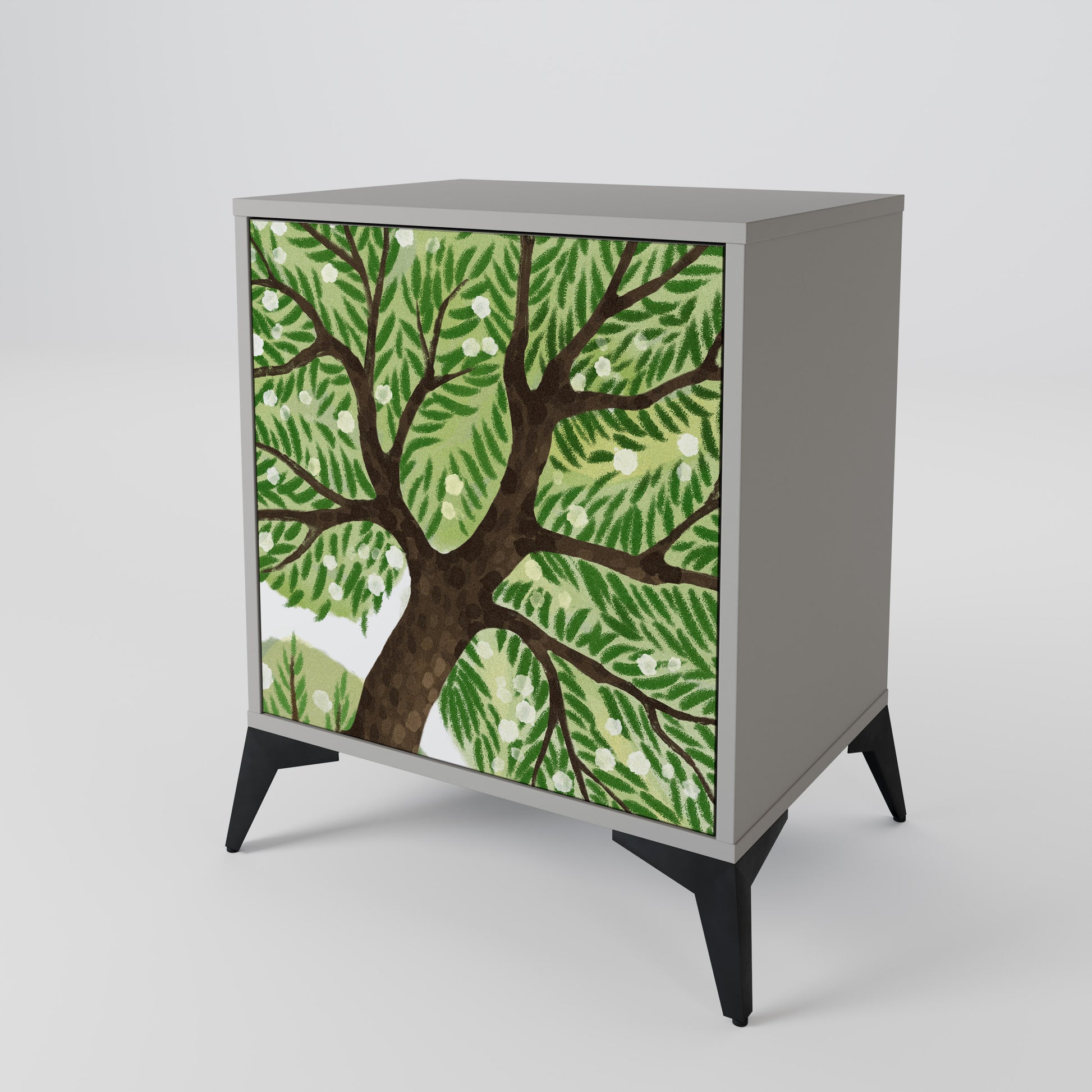 Questo mobile compatto ma straordinariamente elegante colpisce per il suo design minimalista, che si adatta perfettamente sia agli interni moderni che a quelli classici. Il tenue colore grigio della struttura conferisce al mobile un carattere discreto ma distintivo, mentre i frontali con una stampa esclusiva aggiungono un tocco artistico.