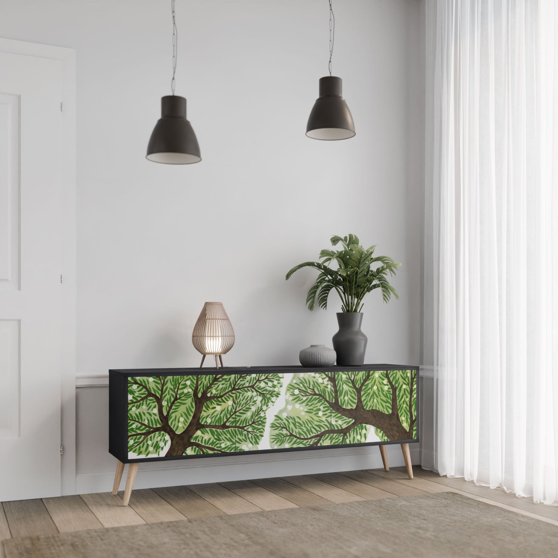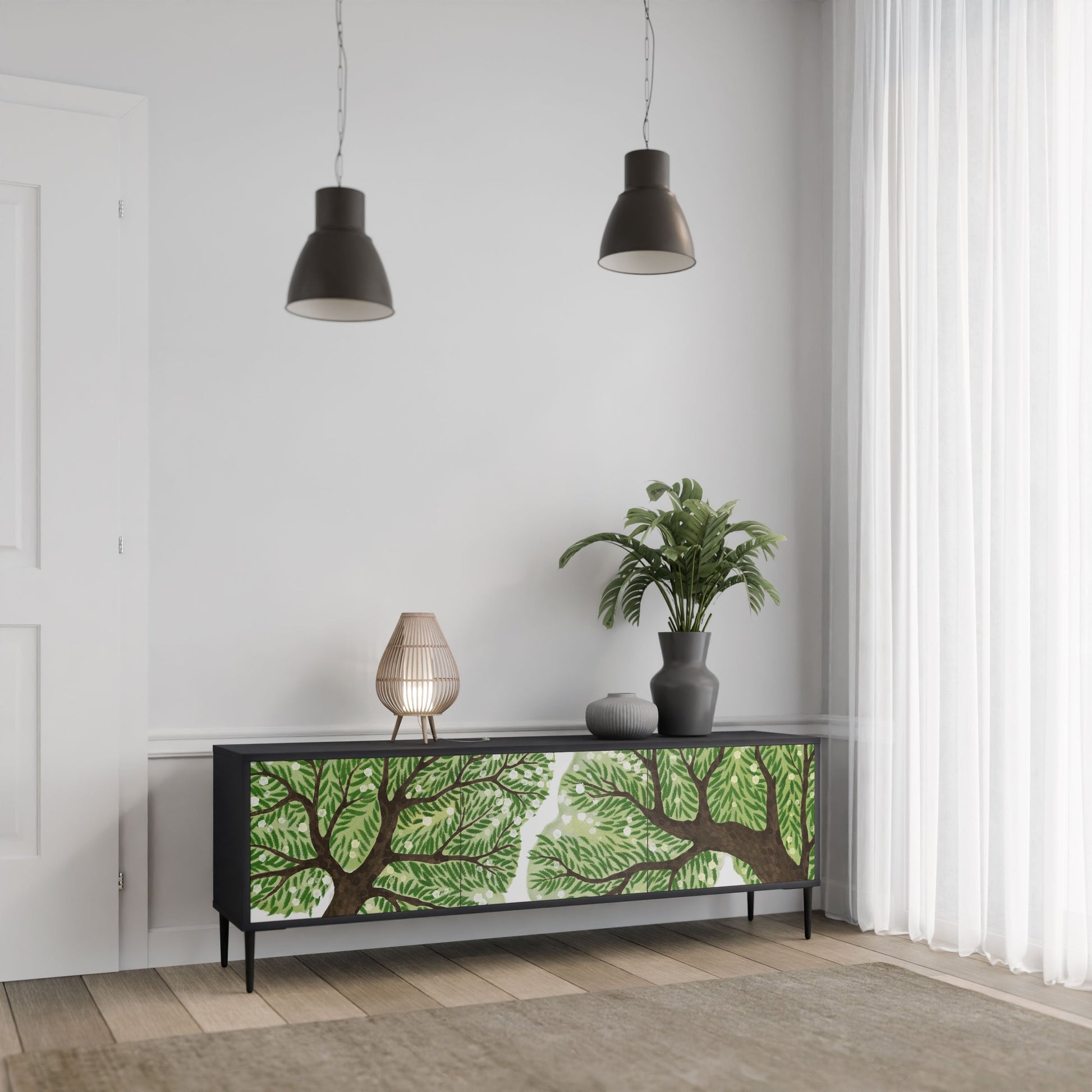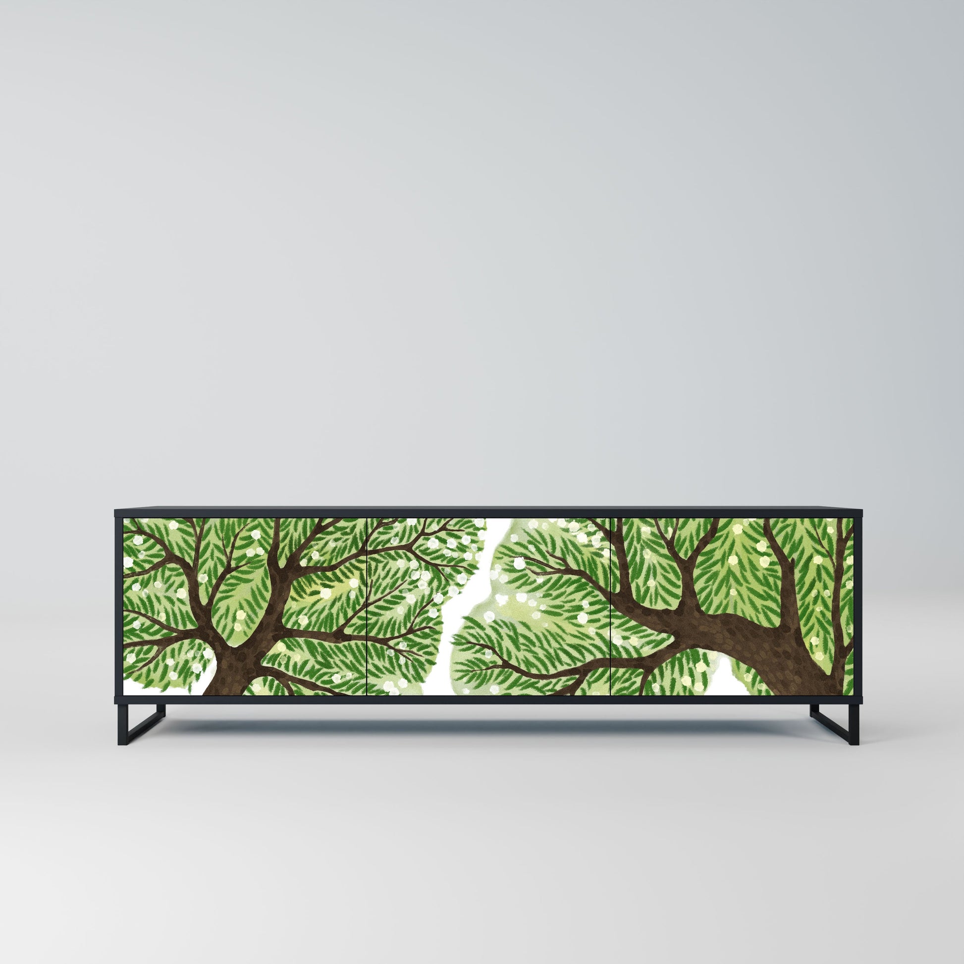 Il corpo nero del supporto crea un accento audace e moderno che si abbina magnificamente ad allestimenti industriali e minimalisti. I frontali con una stampa di design aggiungono carattere e unicità, rendendo questo pezzo non solo pratico ma anche un elemento decorativo di spicco.