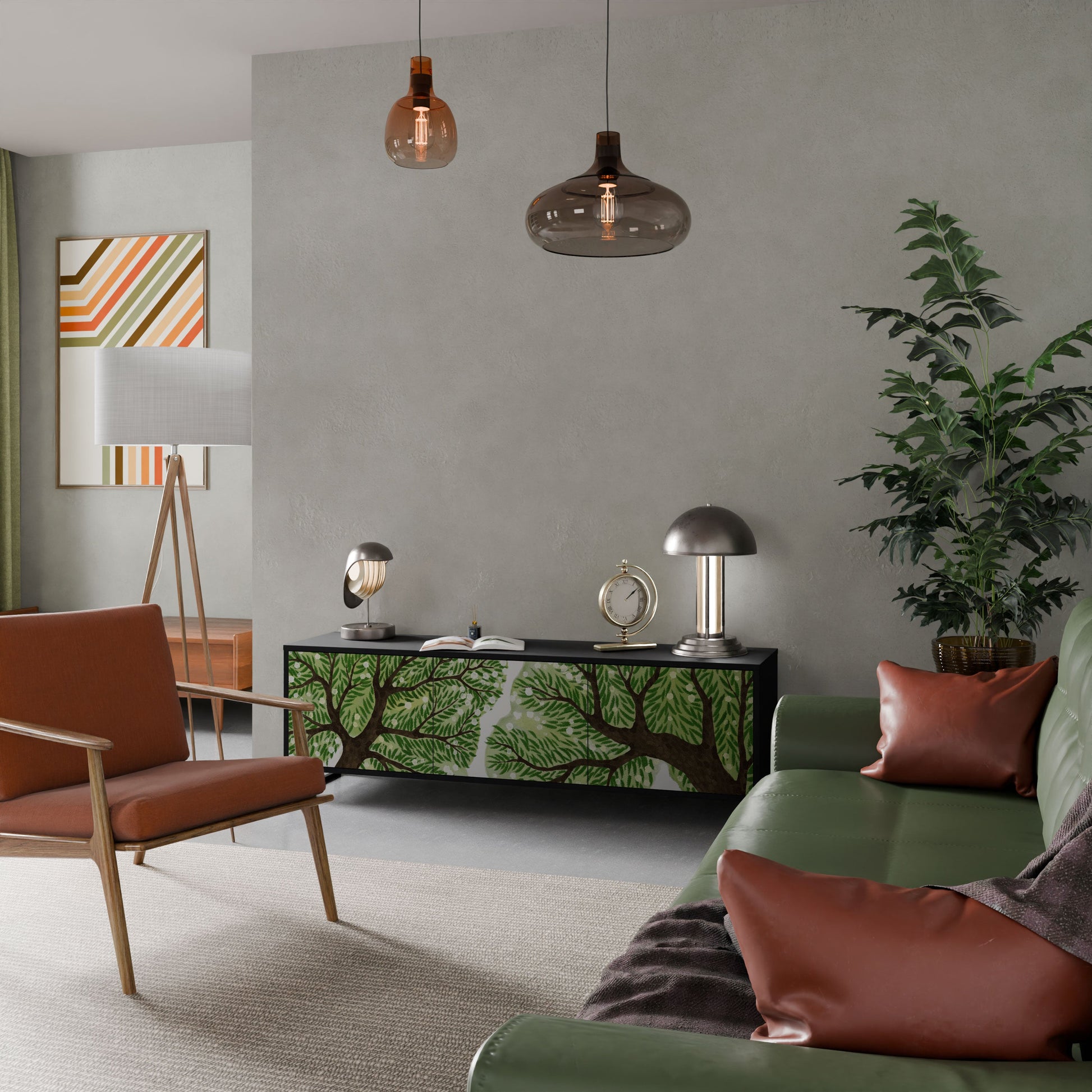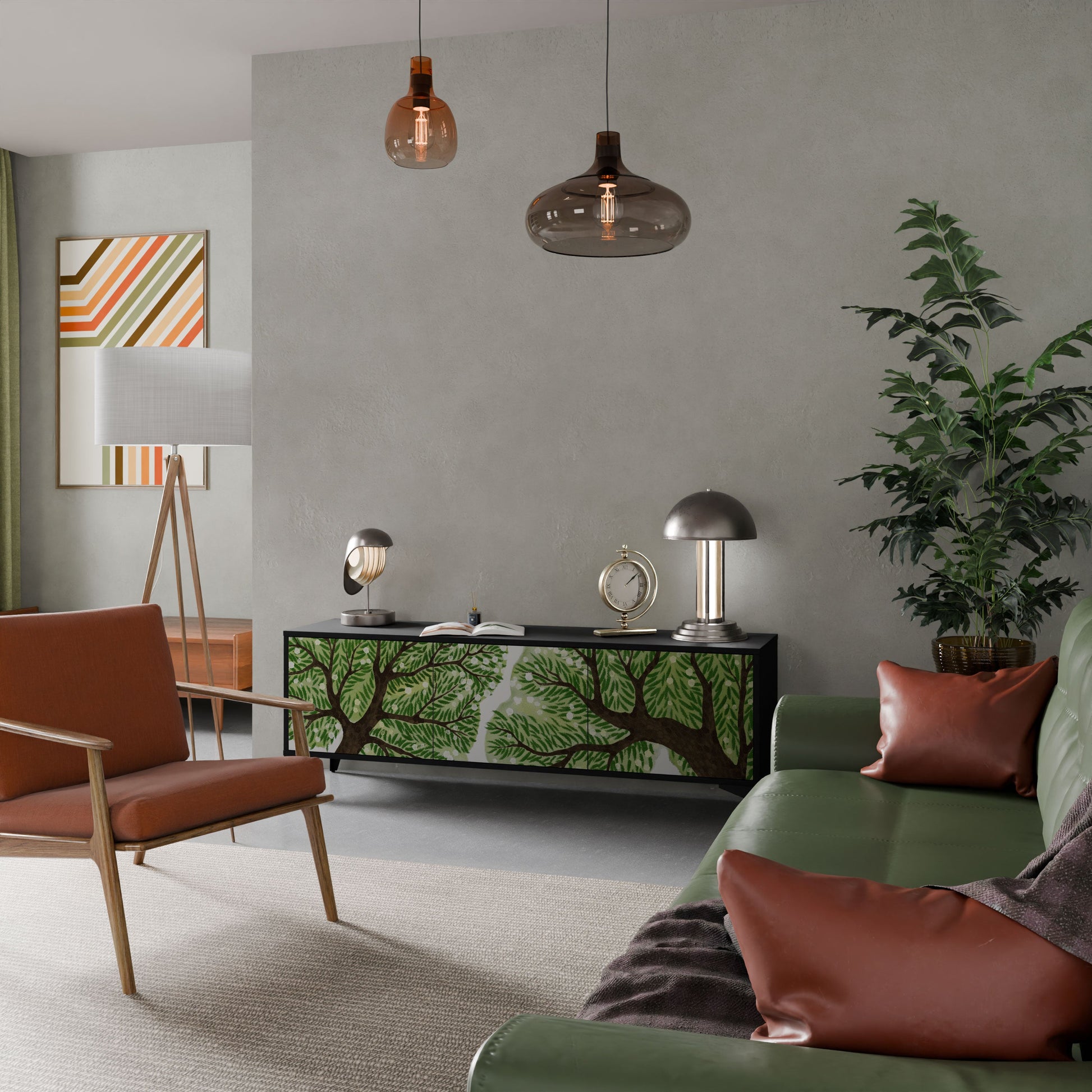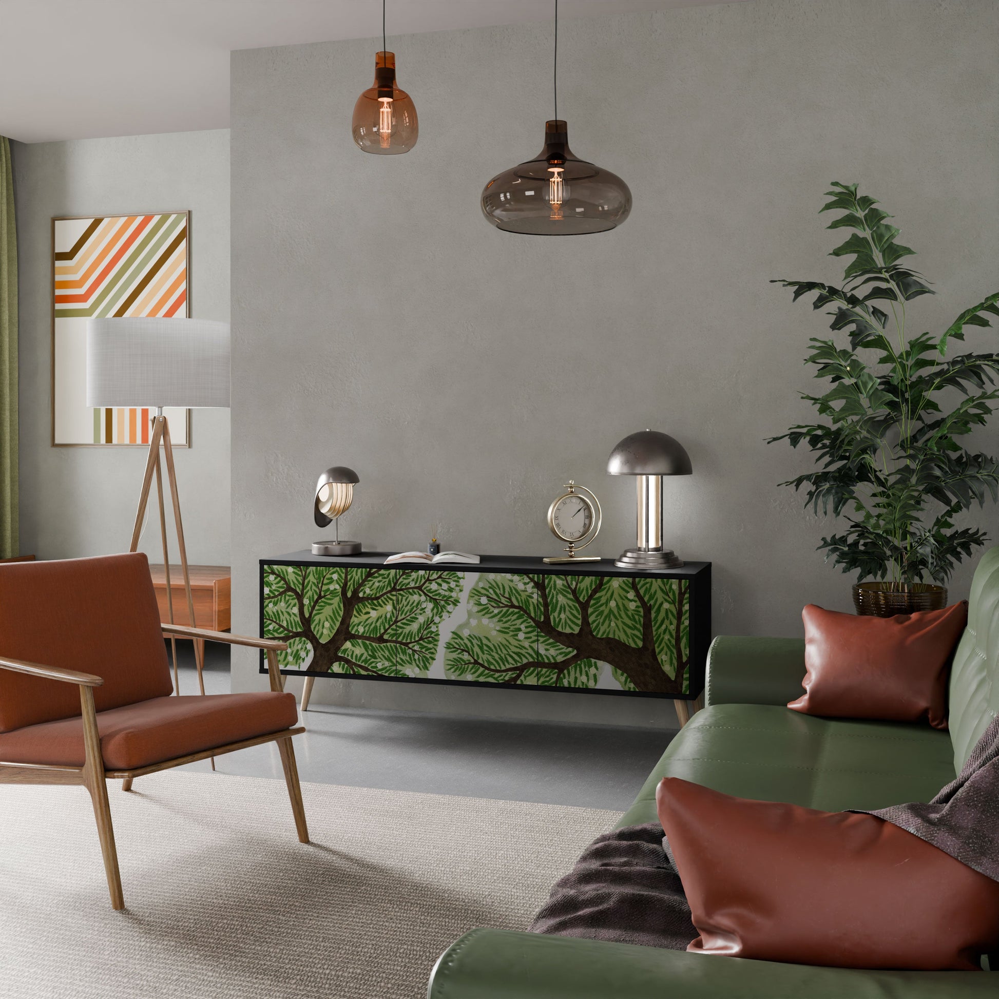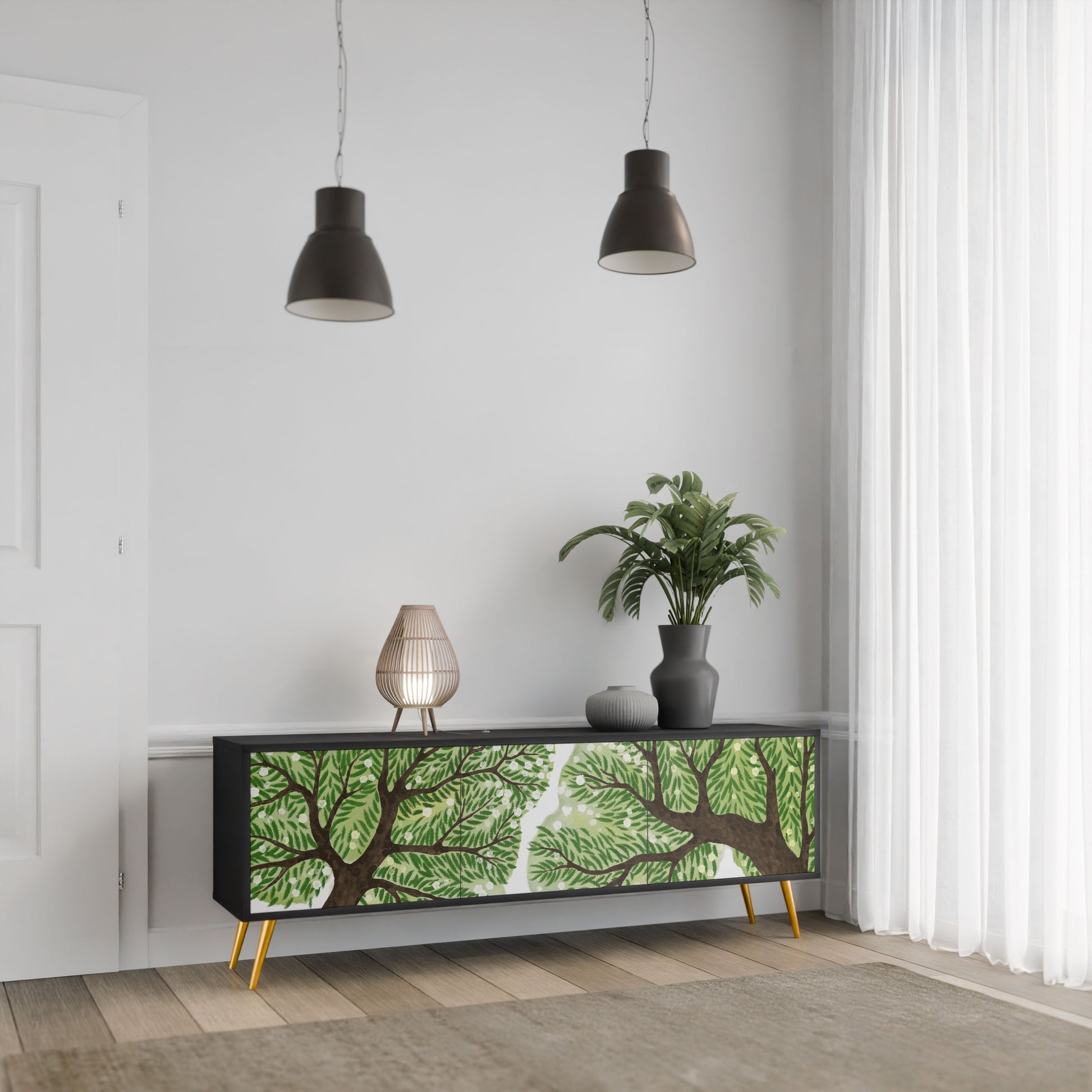 Il corpo nero del supporto crea un accento audace e moderno che si abbina magnificamente ad allestimenti industriali e minimalisti. I frontali con una stampa di design aggiungono carattere e unicità, rendendo questo pezzo non solo pratico ma anche un elemento decorativo di spicco.